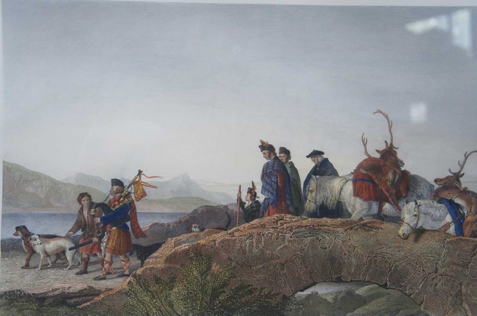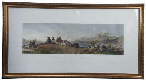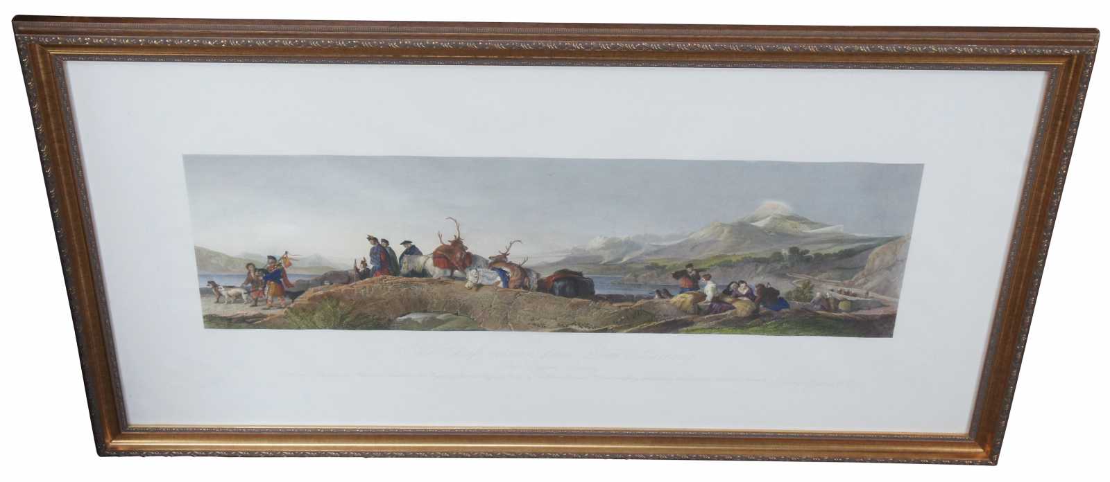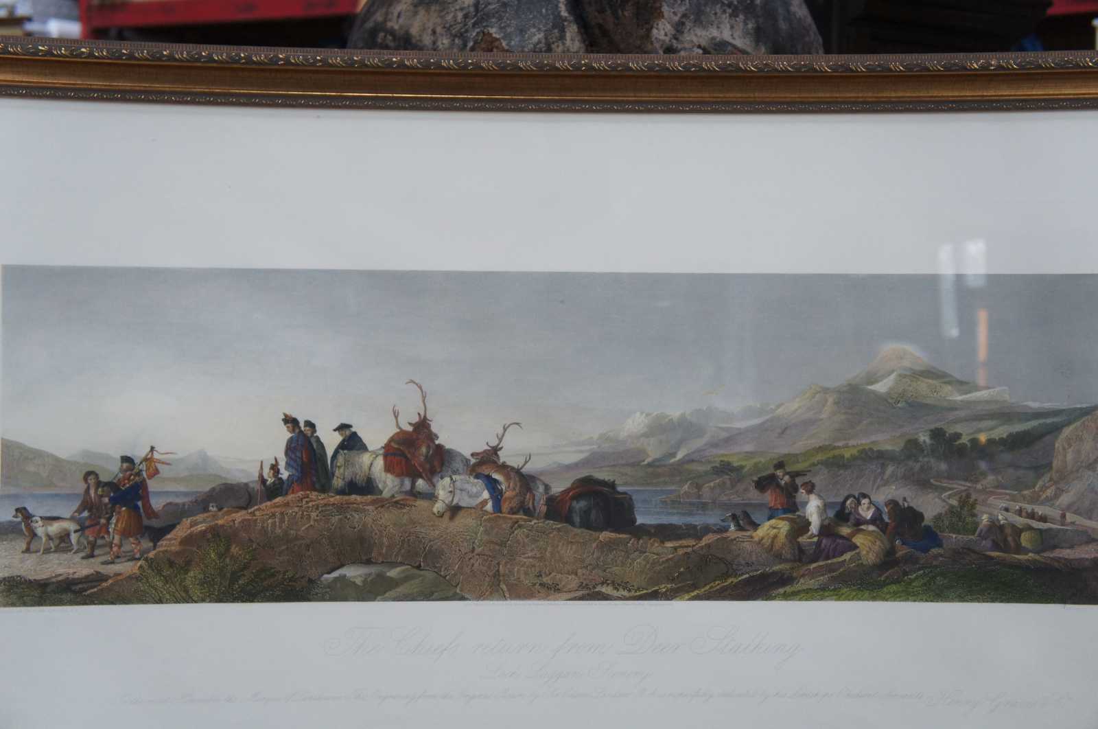 Antique Scottish hunt landscape etching aptly titled The Chiefs Return From Deer Stalking. Featuring a group moving along against the backdrop of a mountain range and large body of water. London published 1881 by Henry Graves & co., the proprietors to H.M. the Queen and T.R.H the Price and Princess of Wales.Painted by Sir Edwin Landseer, R.A (British, 1802–1873). Engraved by T.A. Prior.