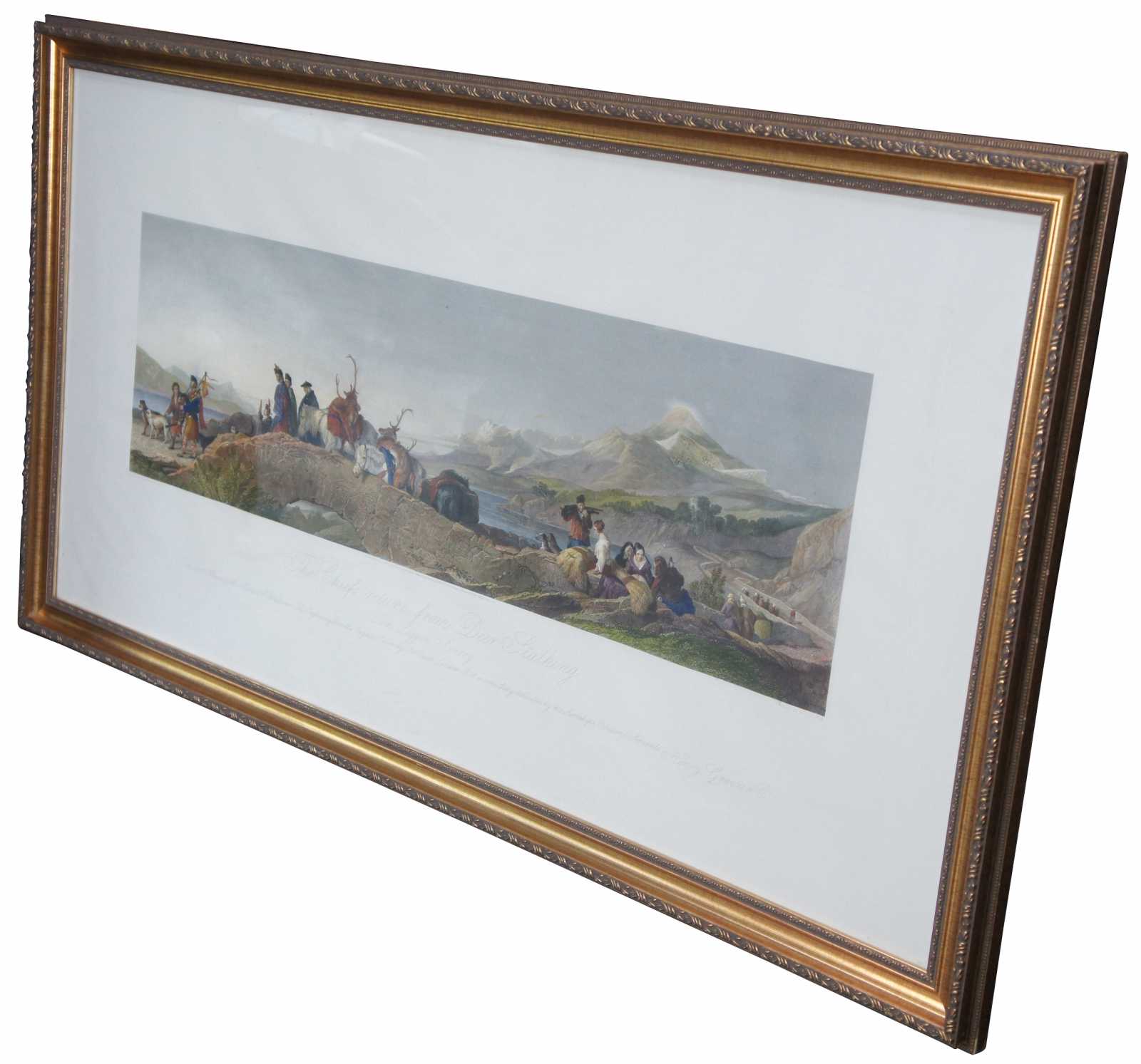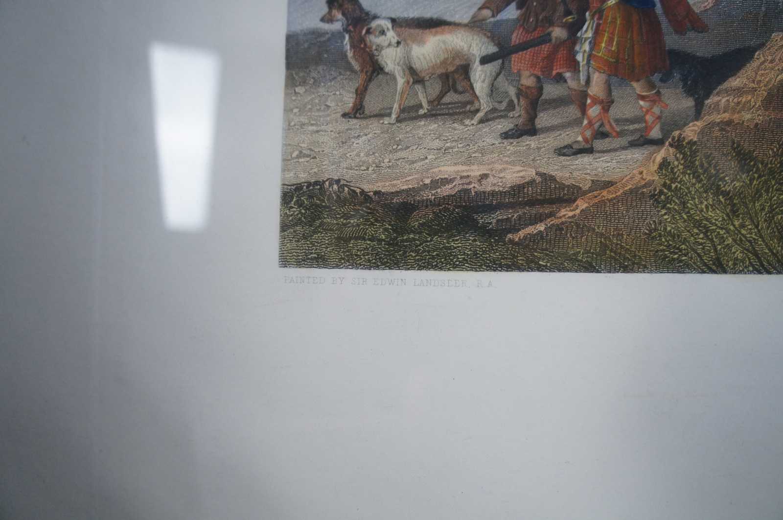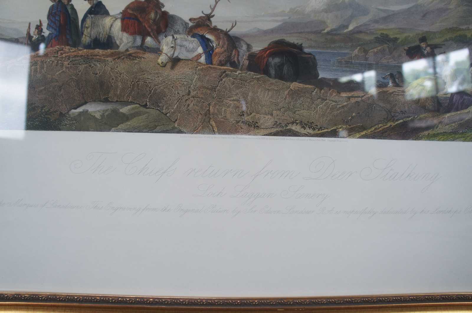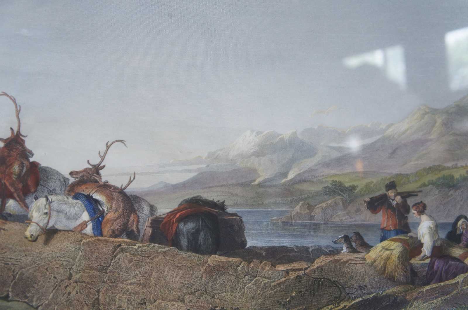 Antique Scottish hunt landscape etching aptly titled The Chiefs Return From Deer Stalking. Featuring a group moving along against the backdrop of a mountain range and large body of water. London published 1881 by Henry Graves & co., the proprietors to H.M. the Queen and T.R.H the Price and Princess of Wales.Painted by Sir Edwin Landseer, R.A (British, 1802–1873). Engraved by T.A. Prior.
