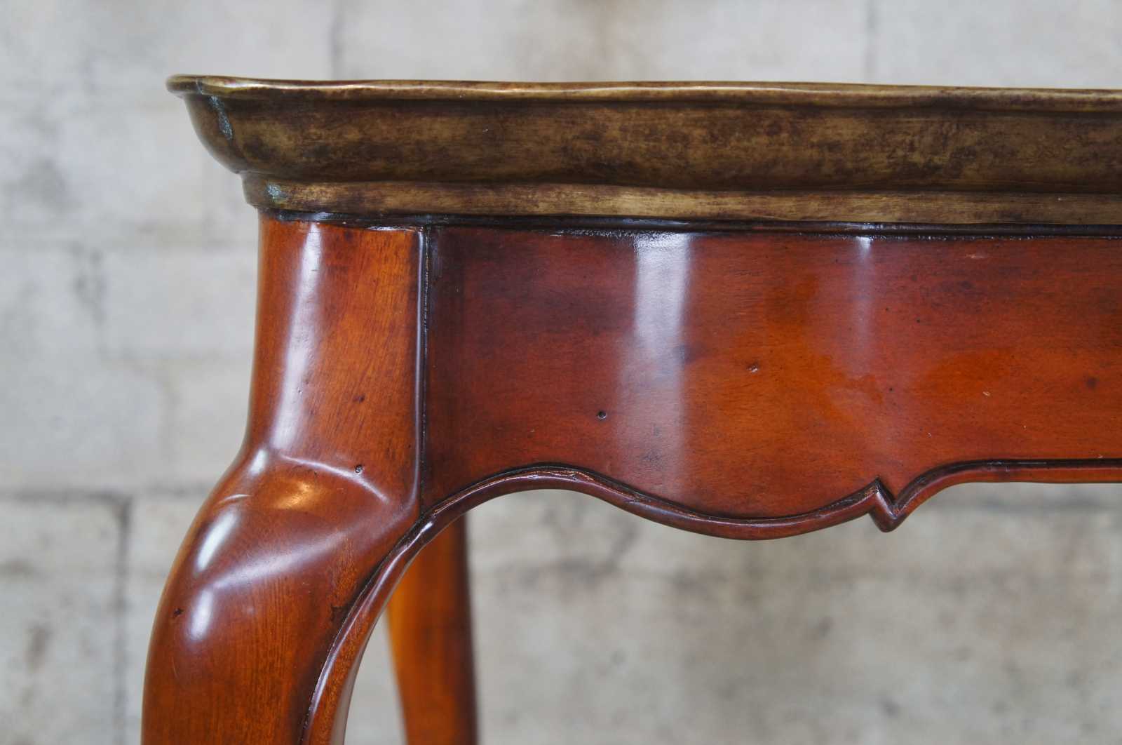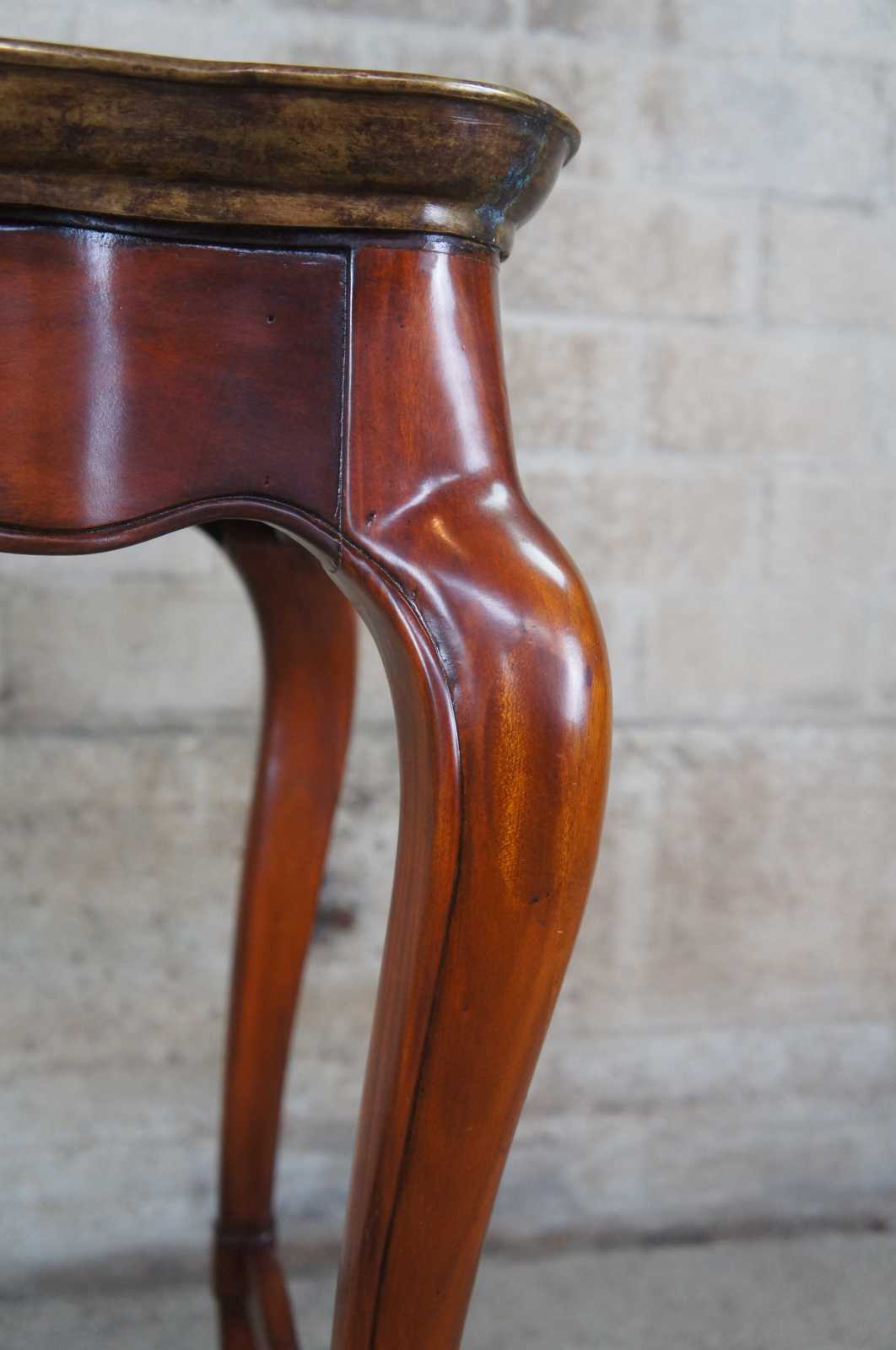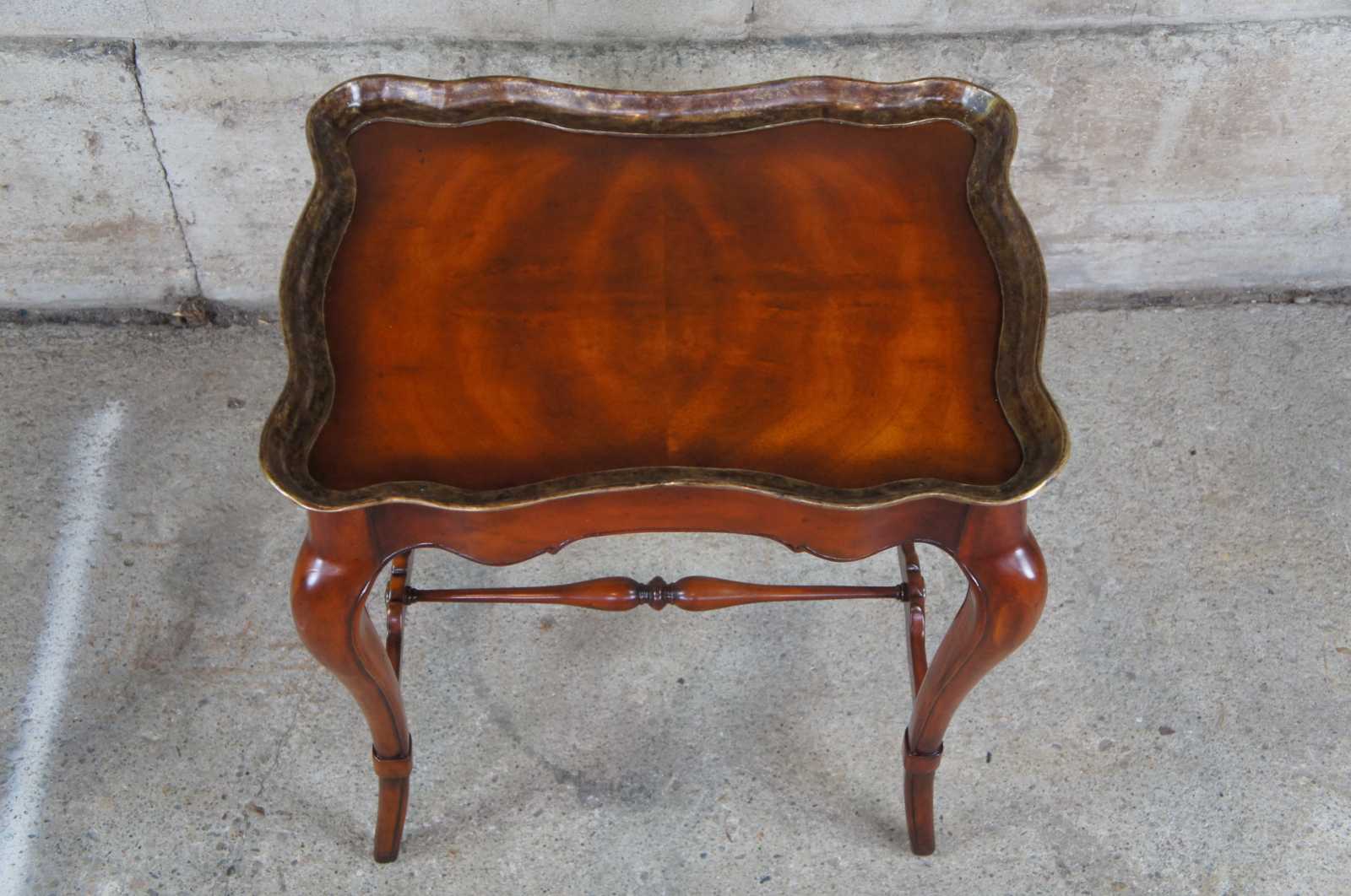 A stunning French inspired accent table. Made from walnut with an inset matchbooked top featuring a patinated brass scalloped edge. The table is supported by long cabriole legs connected by a serpentine H stretcher with brass button and turned central post. Attributed to Theodore Alexander.