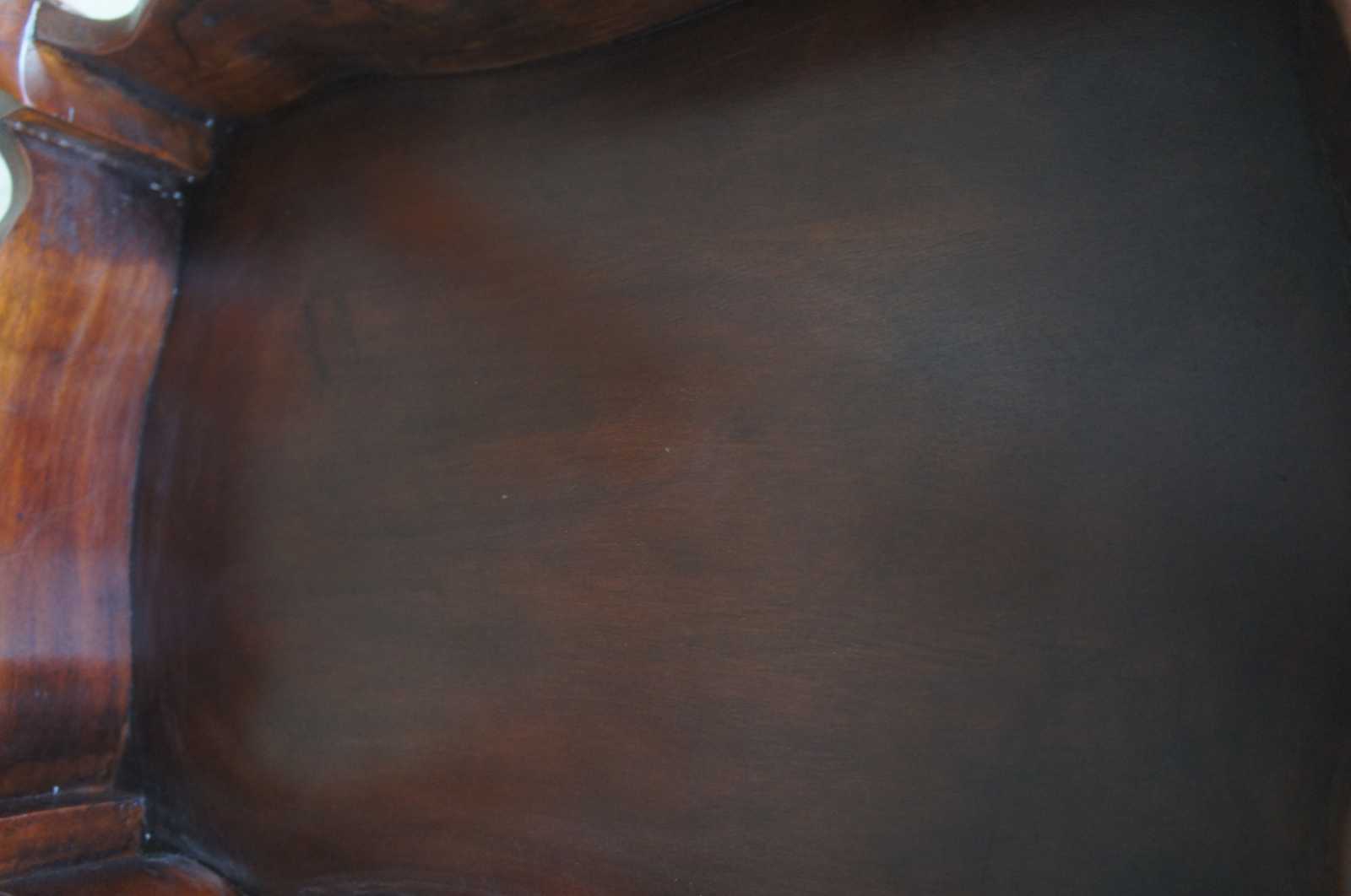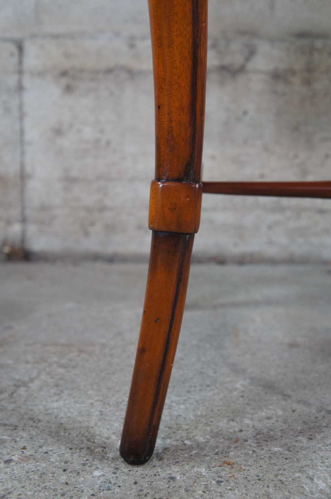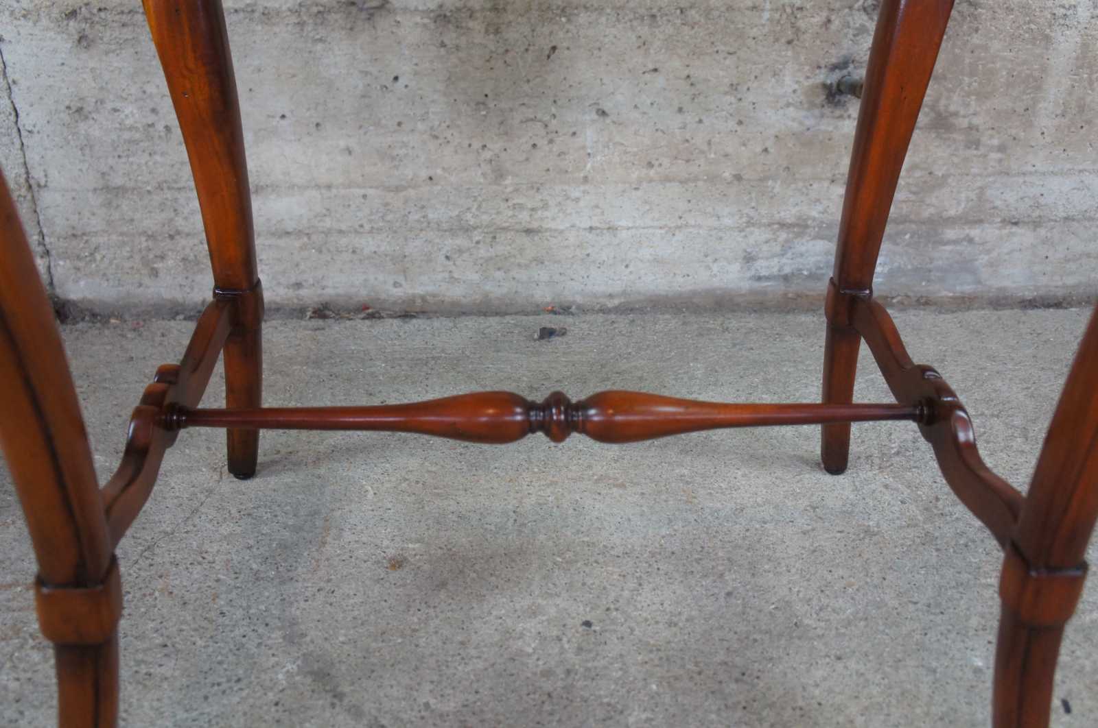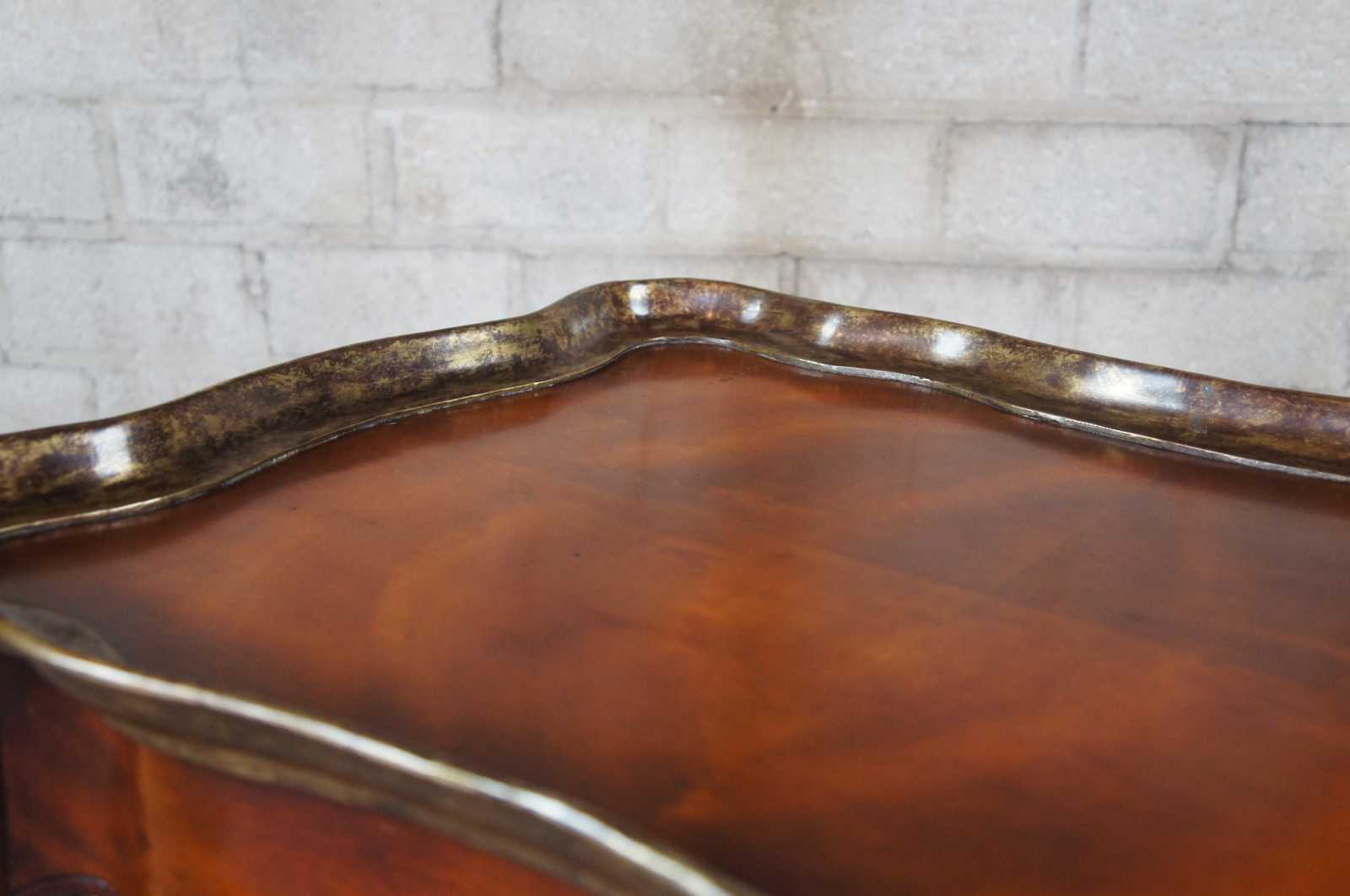 A stunning French inspired accent table. Made from walnut with an inset matchbooked top featuring a patinated brass scalloped edge. The table is supported by long cabriole legs connected by a serpentine H stretcher with brass button and turned central post. Attributed to Theodore Alexander.