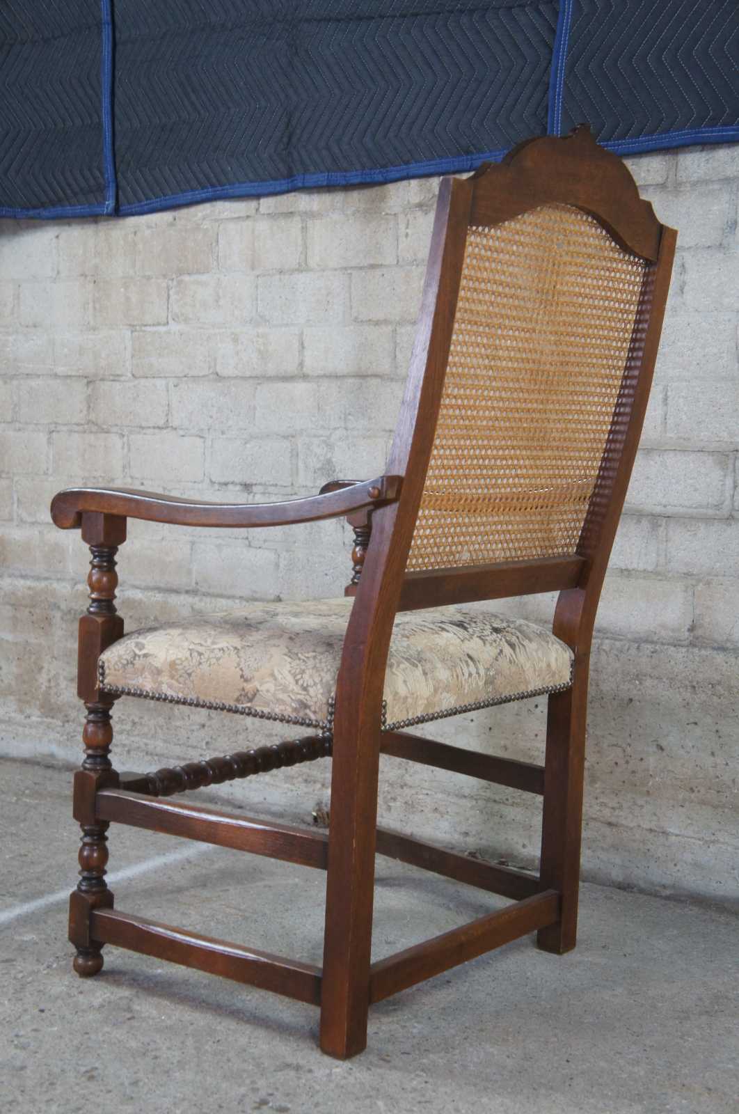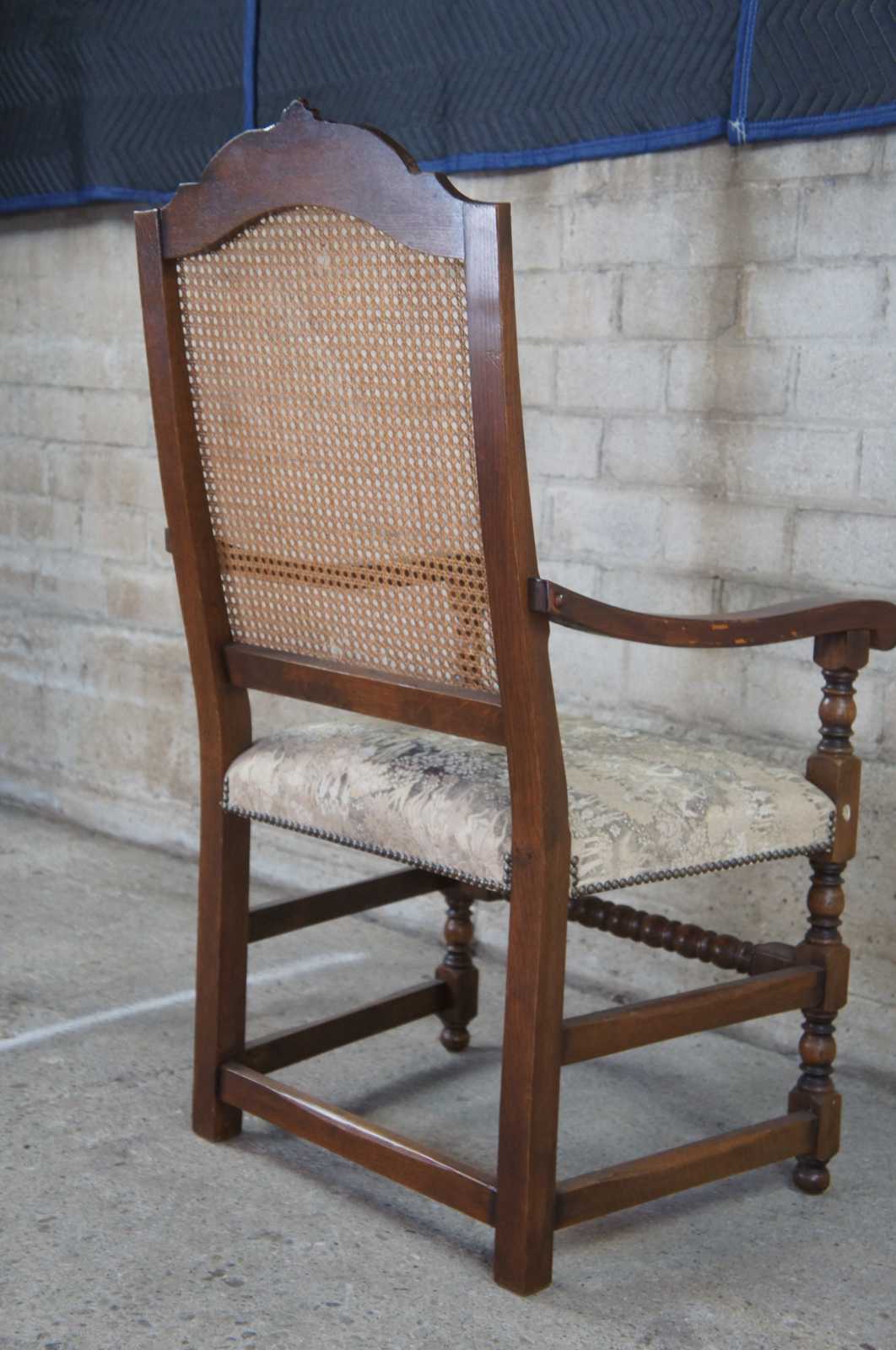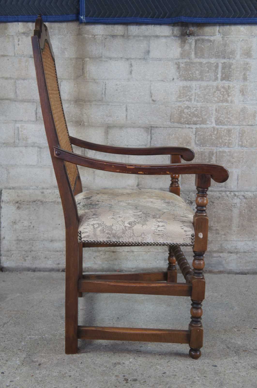 Vintage Spanish Revival arm or accent chair. Made of oak, featuring a caned back, upholstered aubusson style seat with nailhead trim and turned posts.