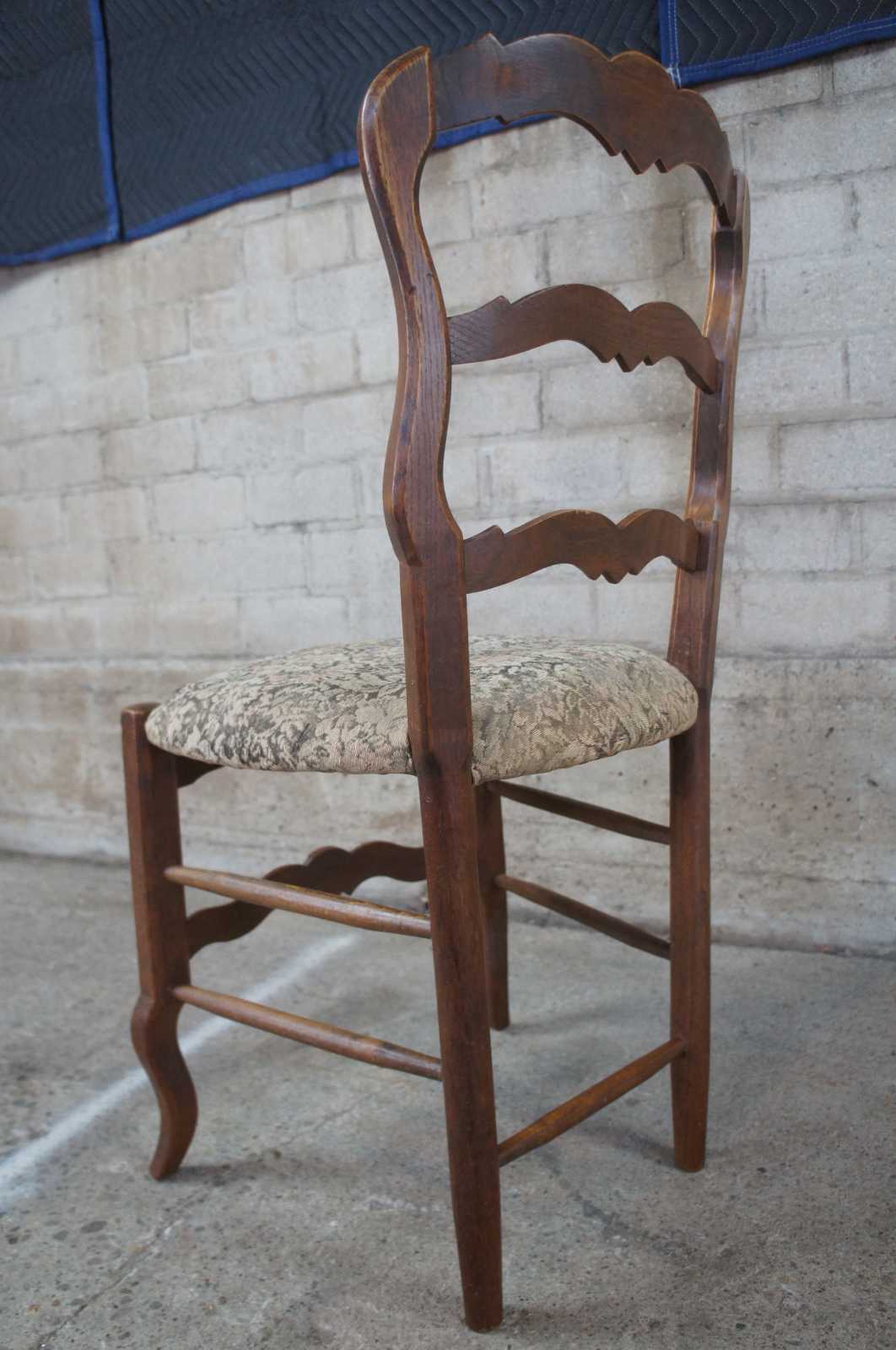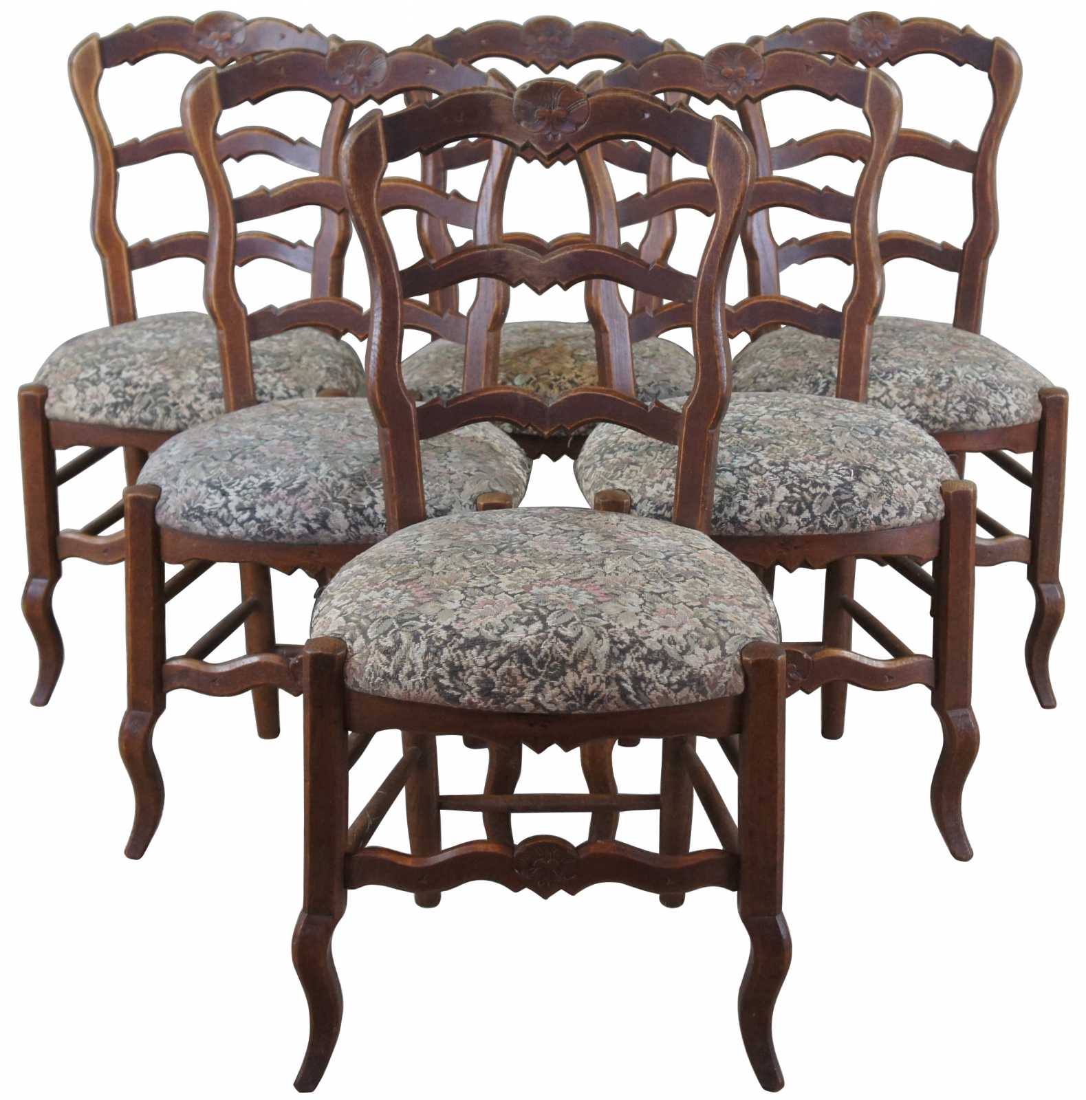 Set of six French Country dining chairs. Made of oak with serpentine ladderback design and floral Aubusson upholstered seat.