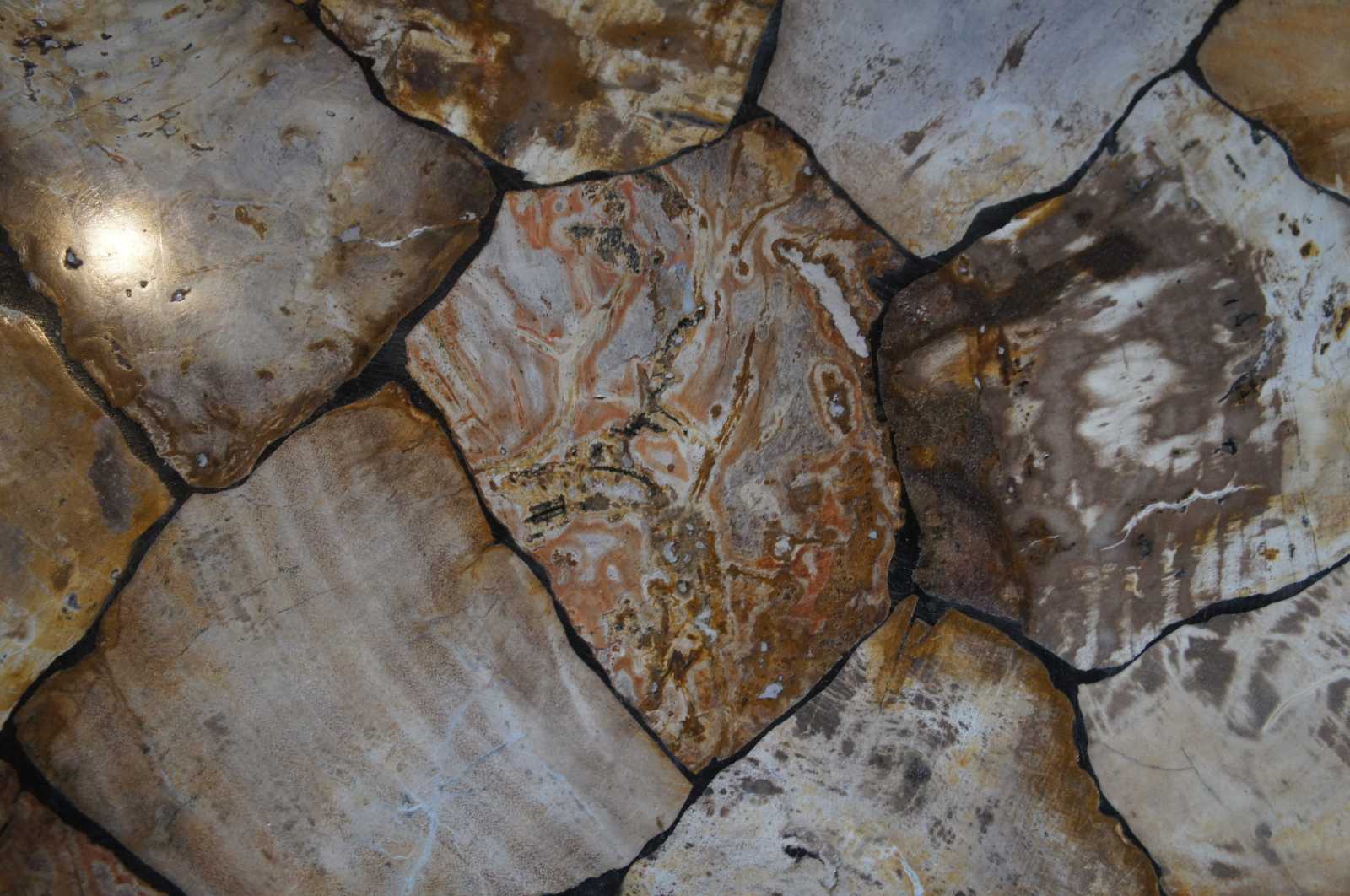 Petrified Wood tabletops are crafted using petrified wood veneers cut from lengths of fossilized trees, which were buried under layers of mud and ash for untold years. Each stone slice boasts shades of brown and black accentuated by the wood’s natural grain.