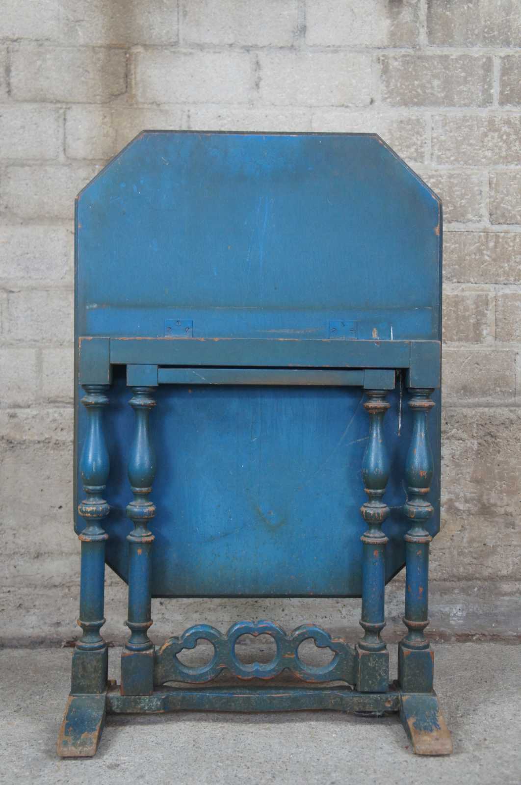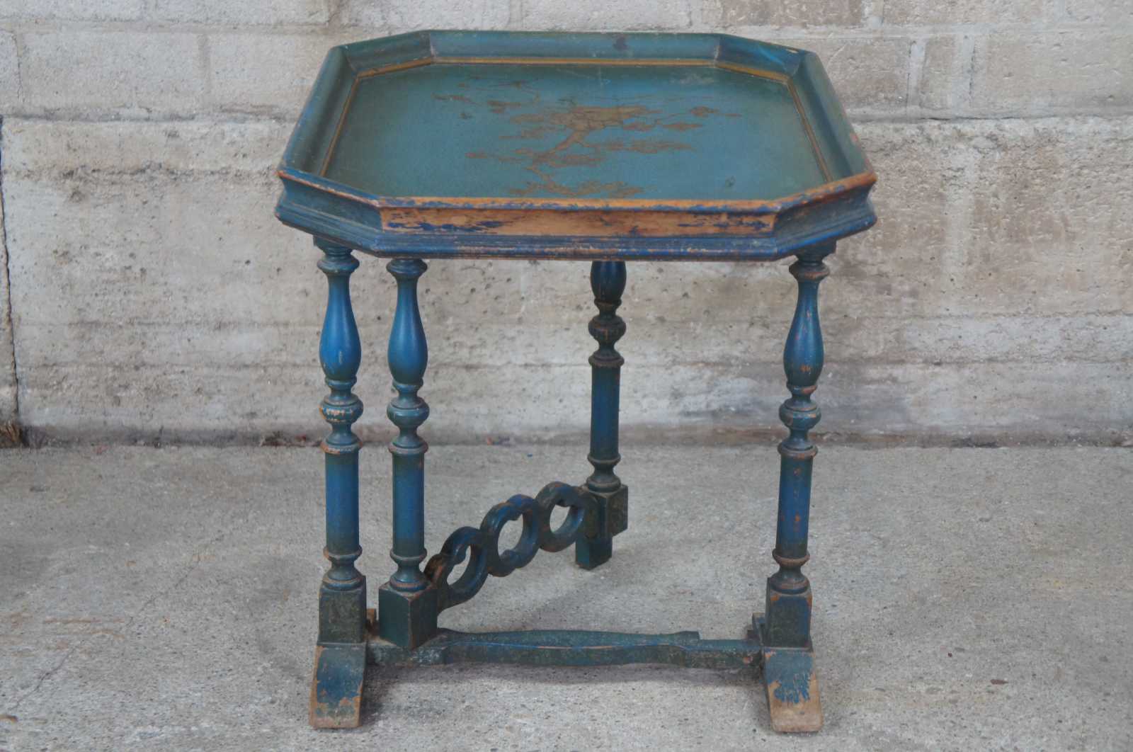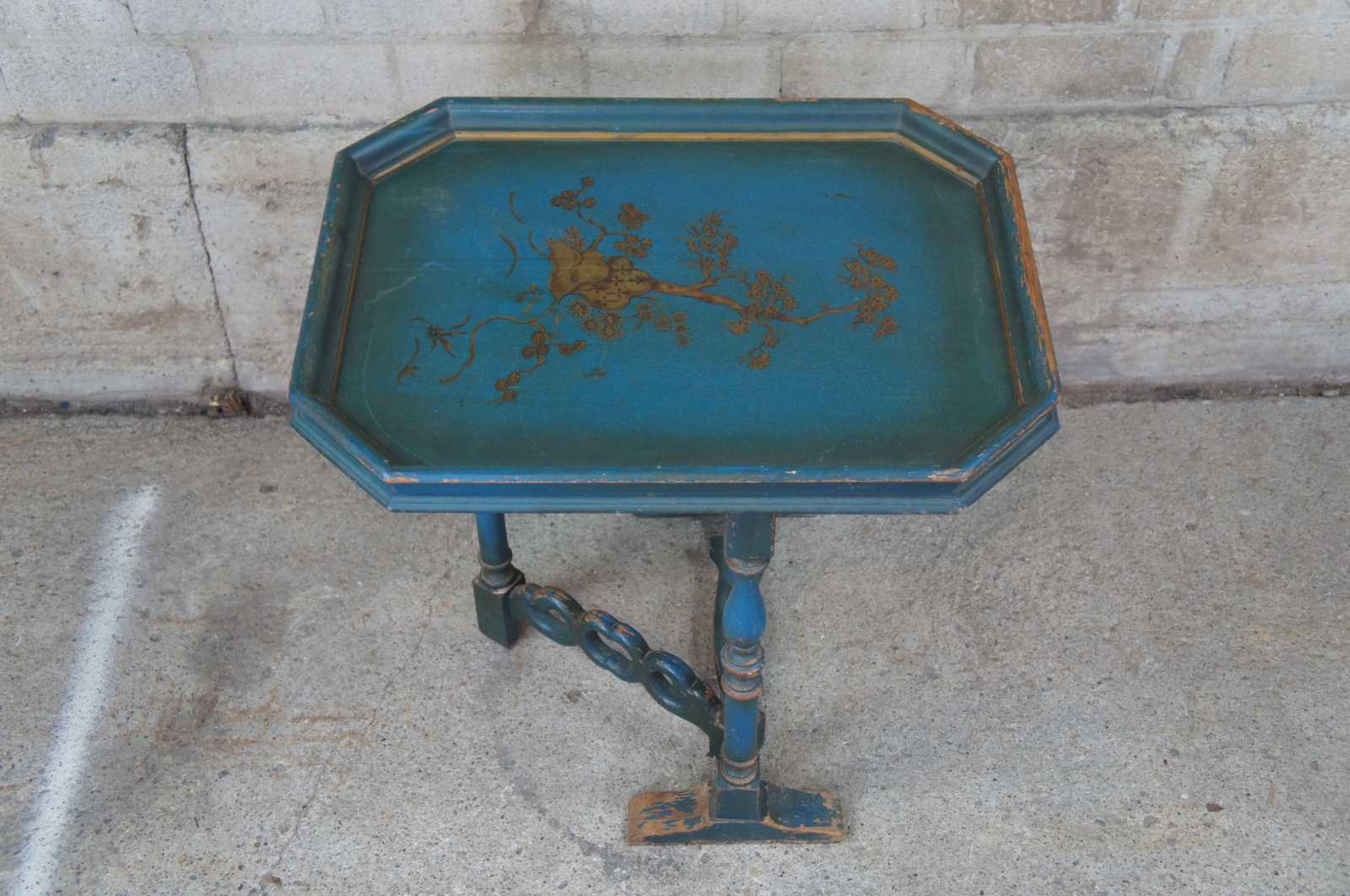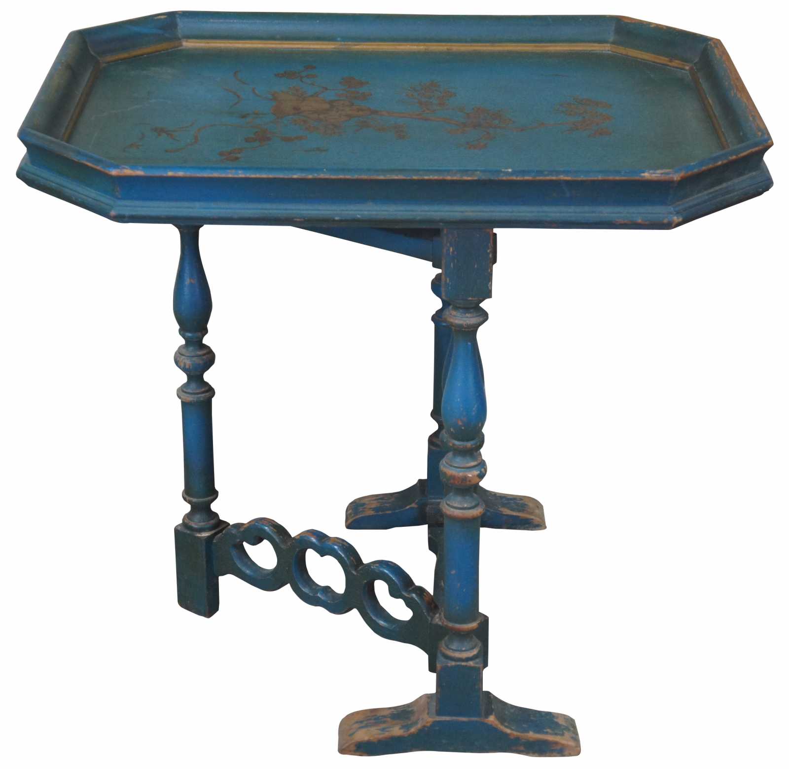 Early 20th century William & Mary style side/ tea table. Features a gateleg design with turned supports and octagonal tray with ogee edge. Finished in a bohemian blue with cherry blossom tree in gold.