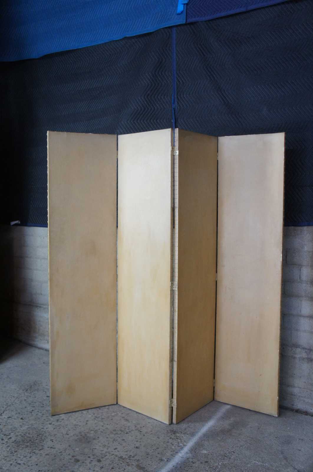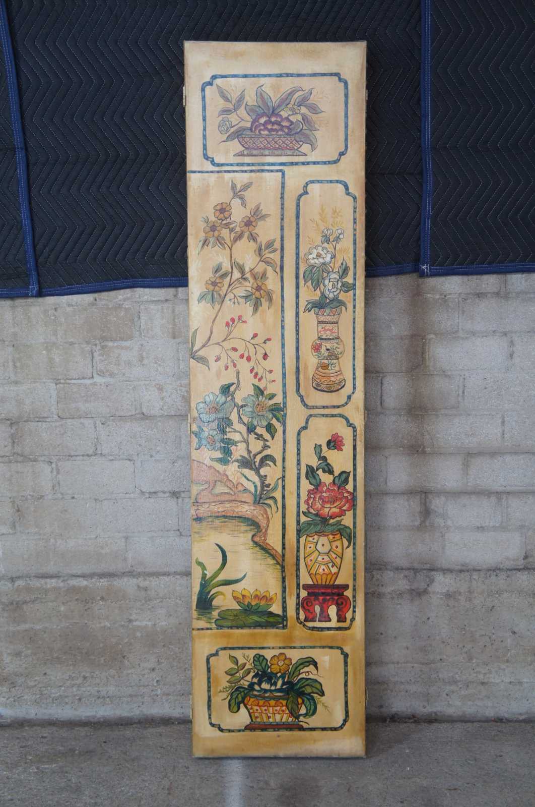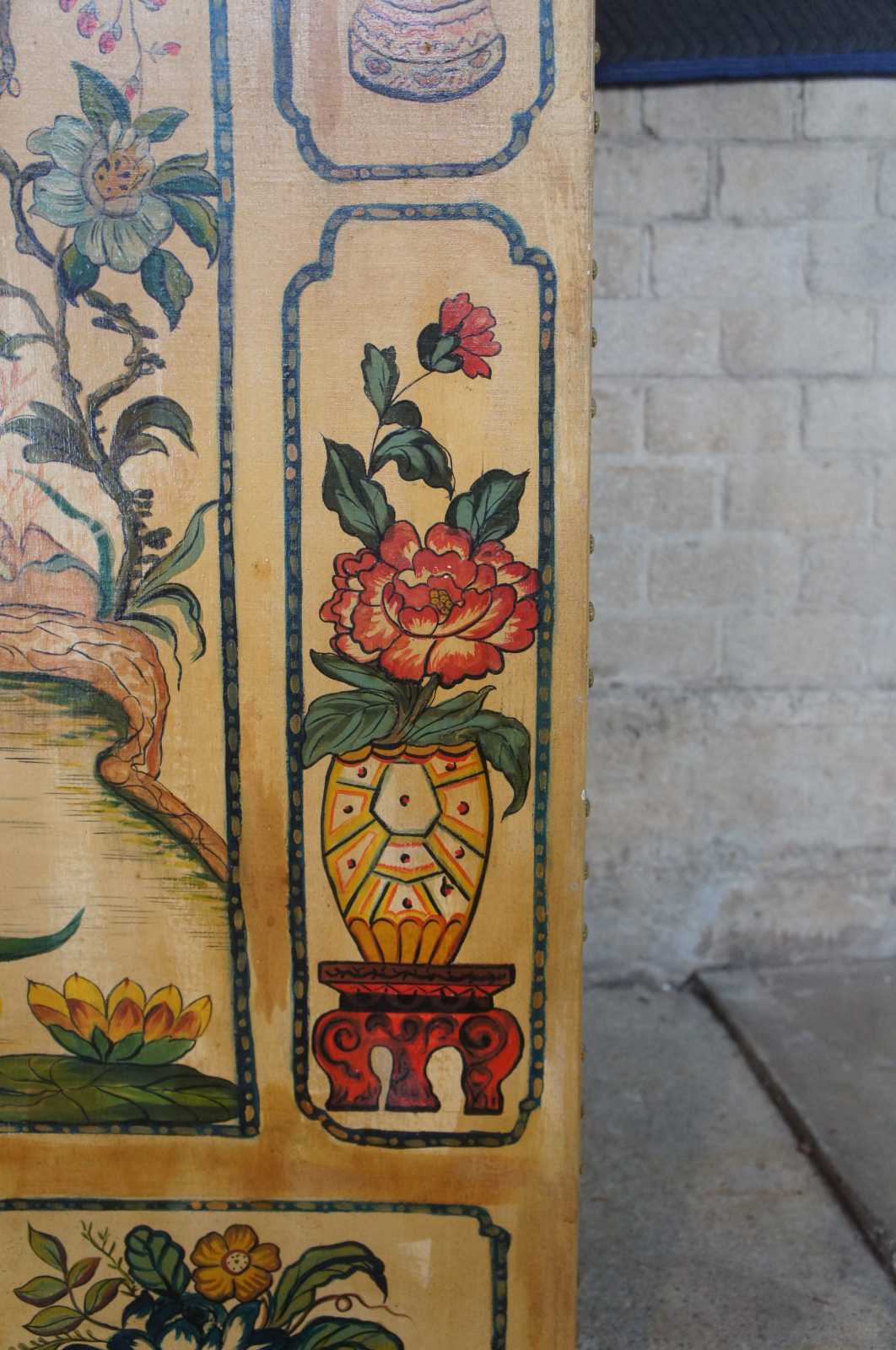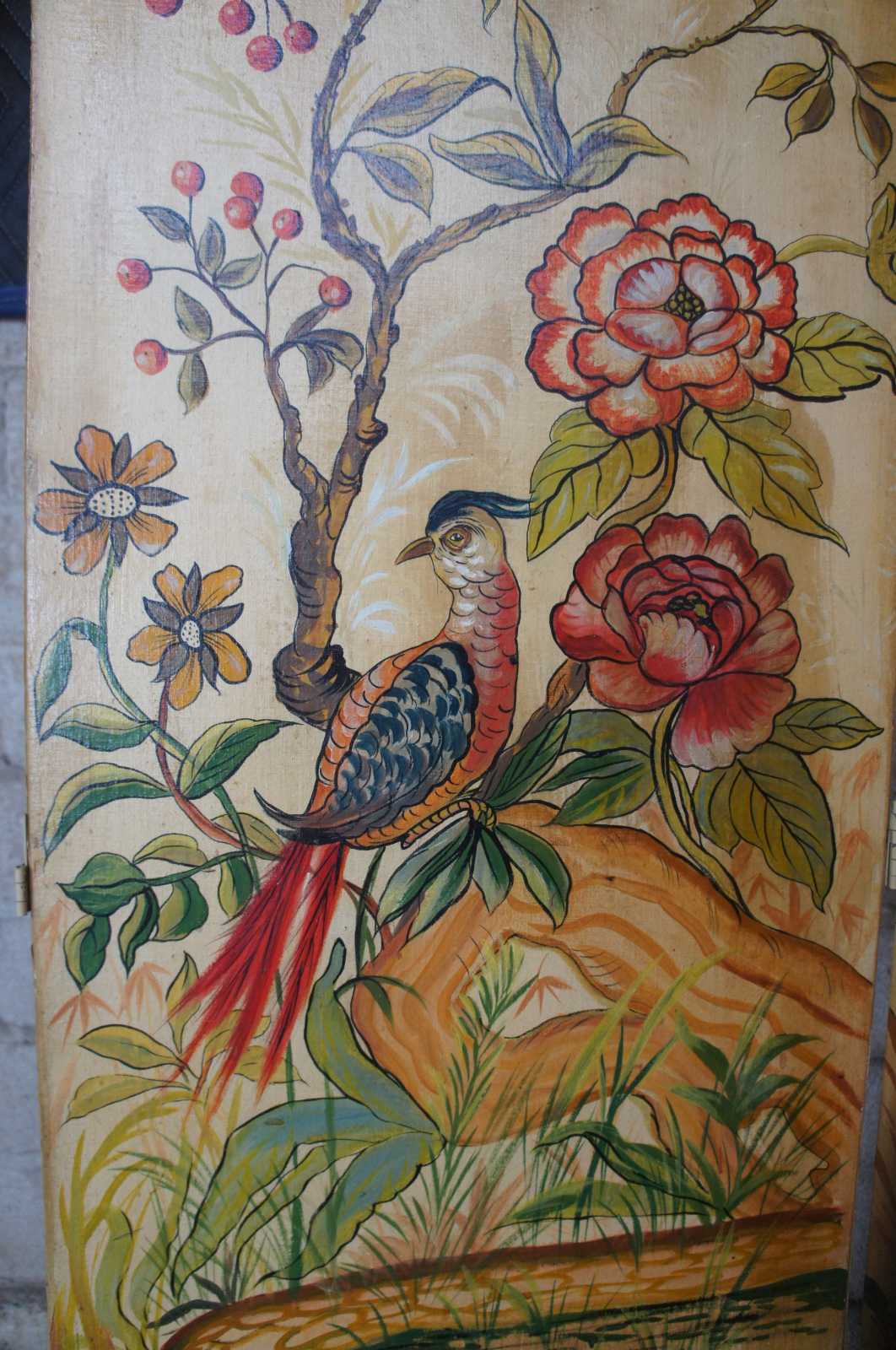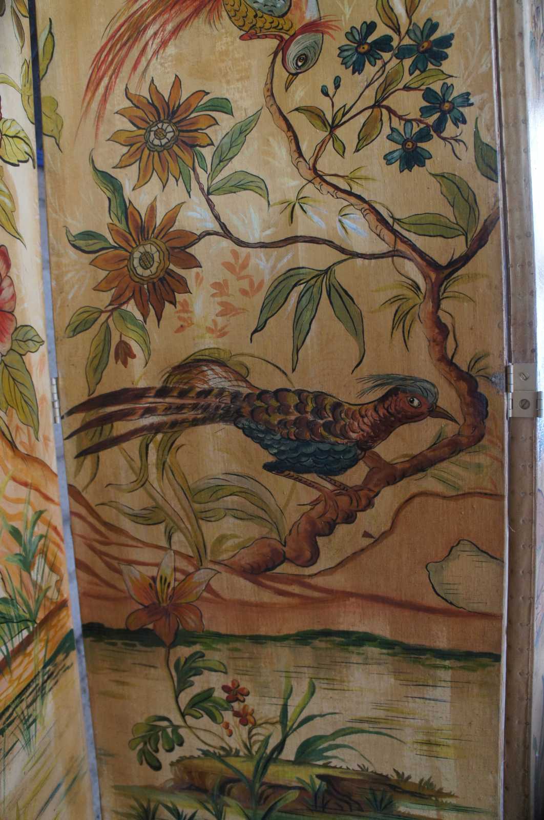 Mid 20th century chinoiserie room divider or dressing screen. Features an intricately detailed ladscape with tropical animals and flowers around a pond. Includes a duck and a variety of birds. The landscape is neatly framed by a boarder of porcelain pots and flowers.