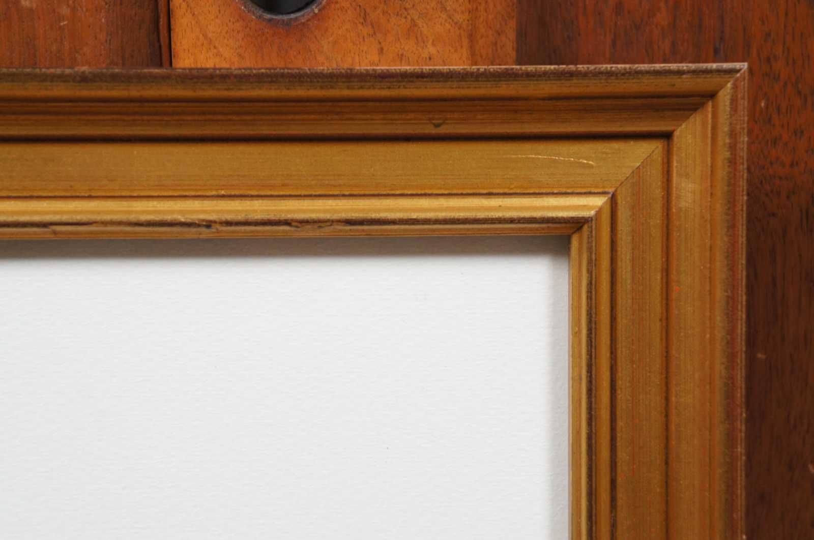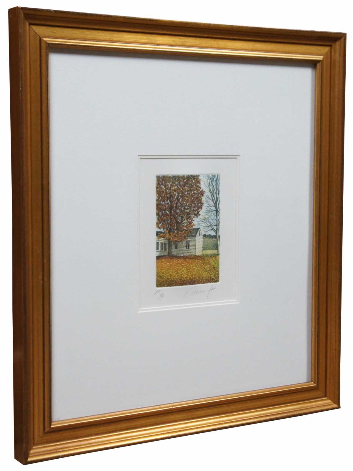 Olivero Masi framed landscape print showing the corner of a farmhouse in an autumn leaf covered landscape. Pencil signed and numbered 70/99.