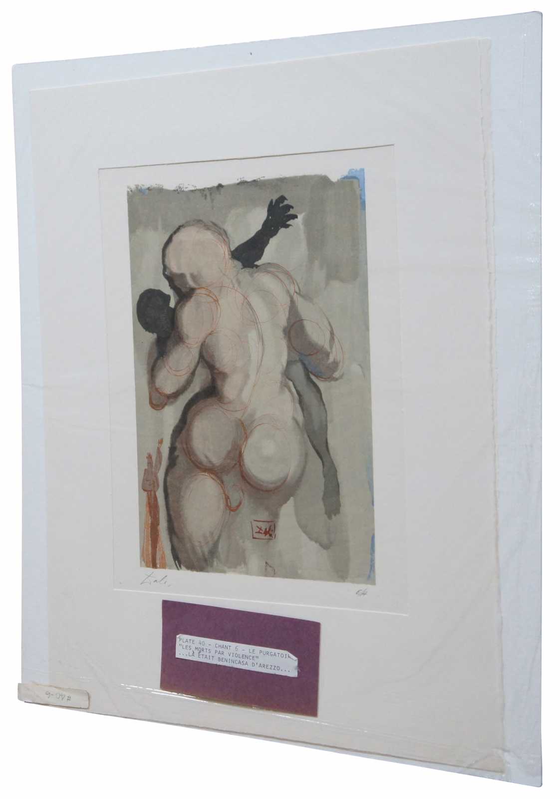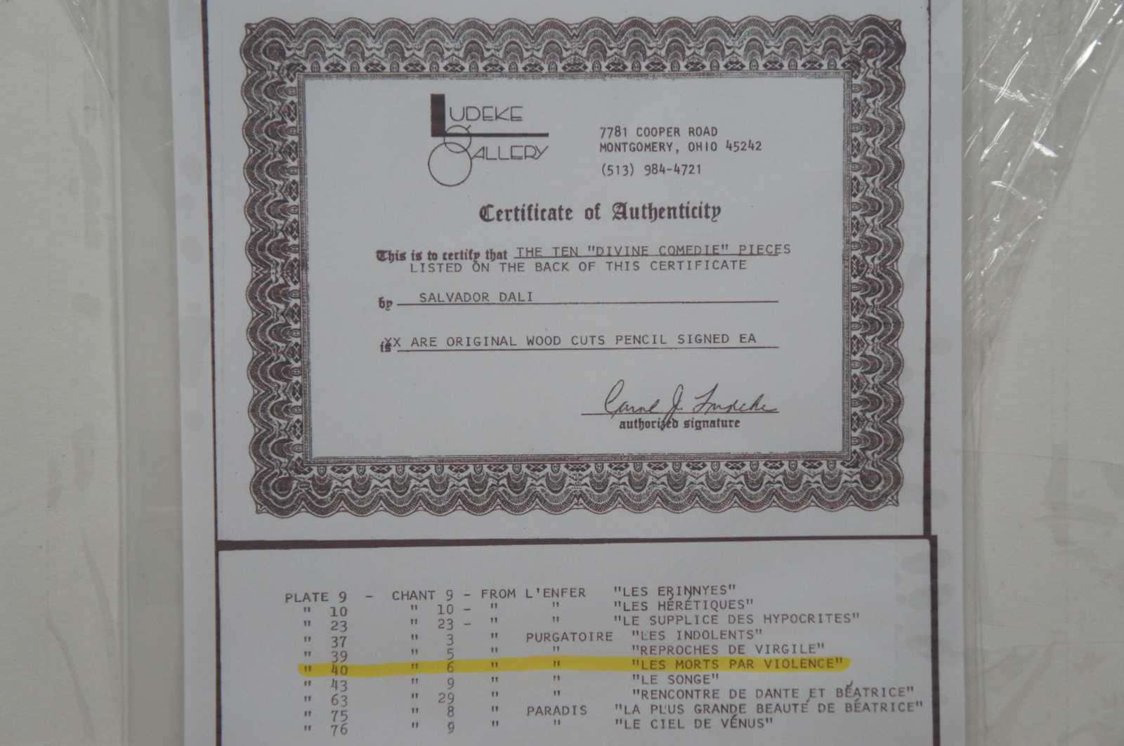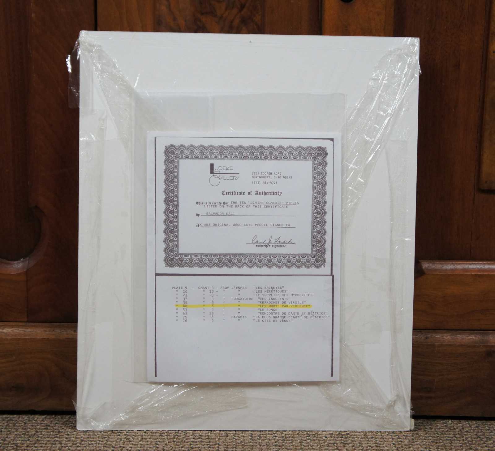 Original woodcut artist’s proof print, pencil signed by Salvador Dali – Plate 40 – Chant/Canto 6 – from Le Purgatoire (Purgatory) – “Les Morts par Violence” (Deaths by Violence) from the “Divine Comedie” series. Original certificate of authenticity covered 10 separate prints – photocopy included.