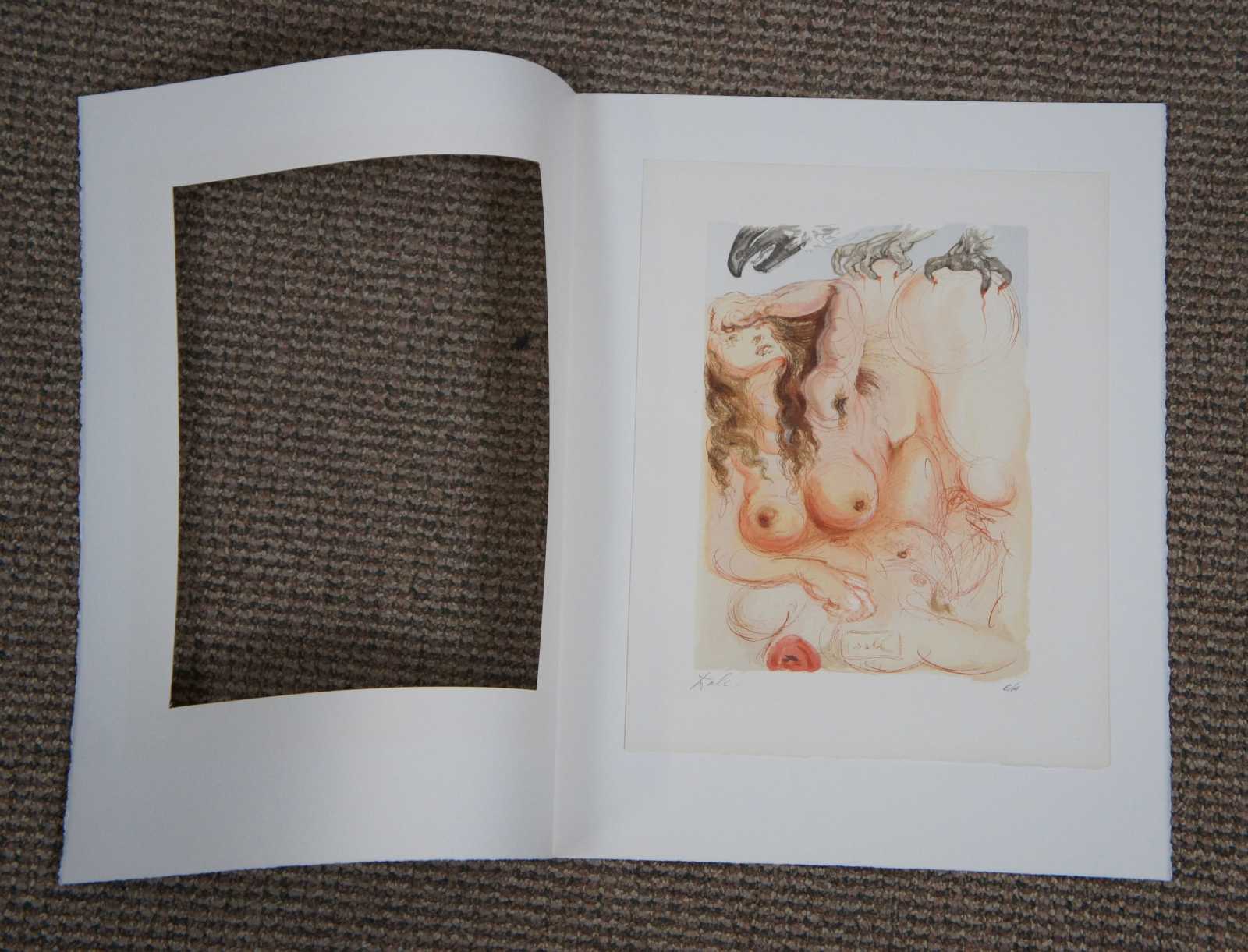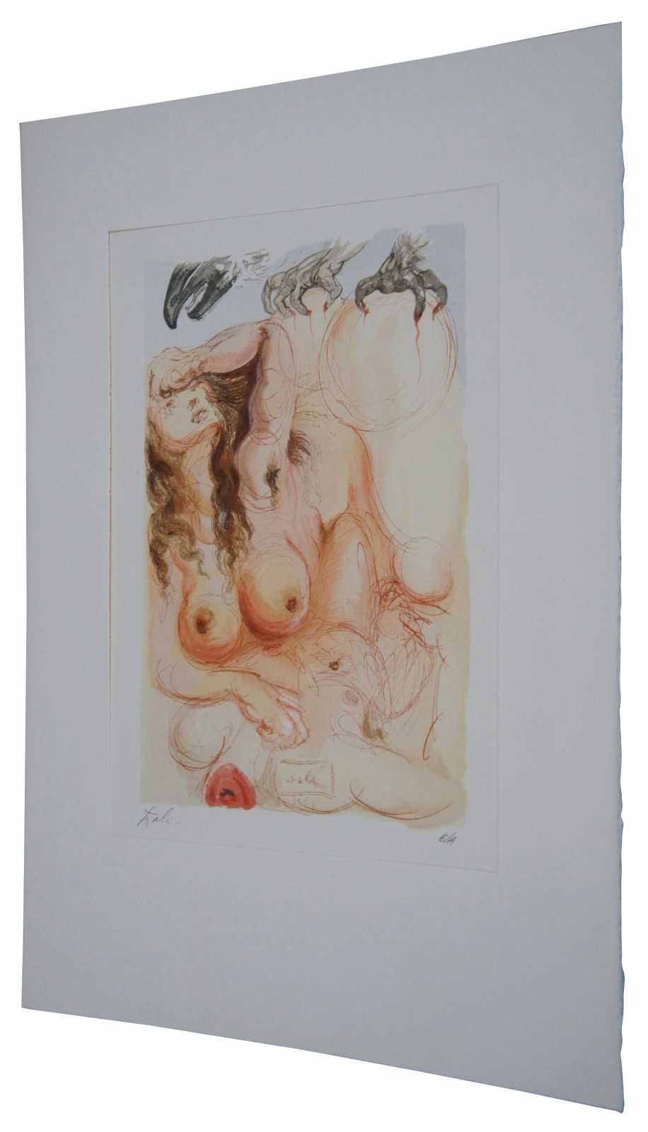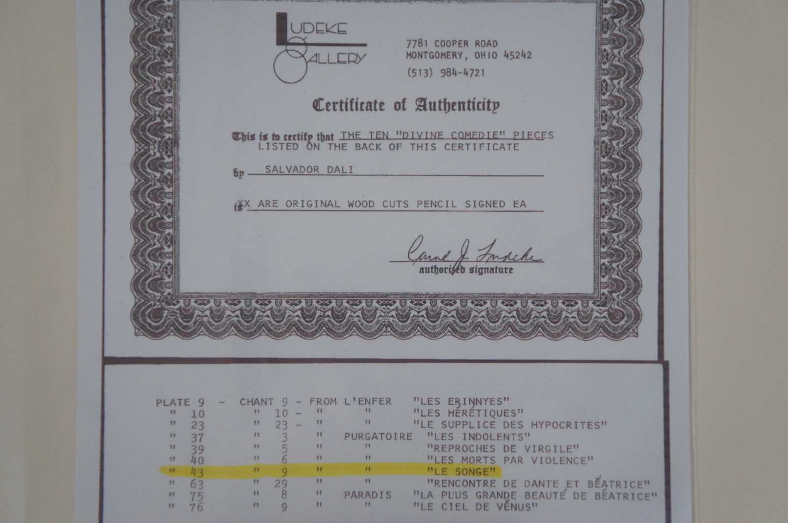 Original woodcut artist’s proof print on BFK Rives paper, pencil signed lower left by Salvador Dali – Plate 43 – Chant/Canto 9 – from Le Purgatoire (Purgatory) – “Le Songe” (The Dream) from the “Divine Comedie” series. Original certificate of authenticity covered 10 separate prints – photocopy included.