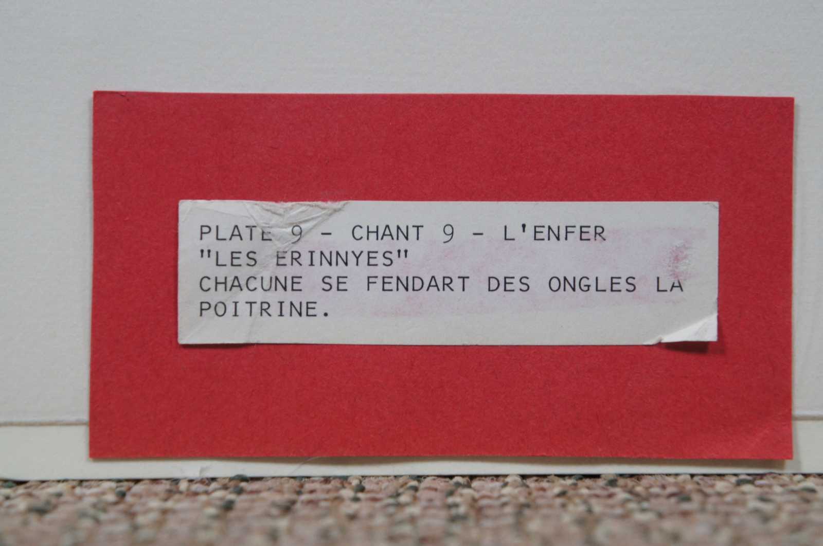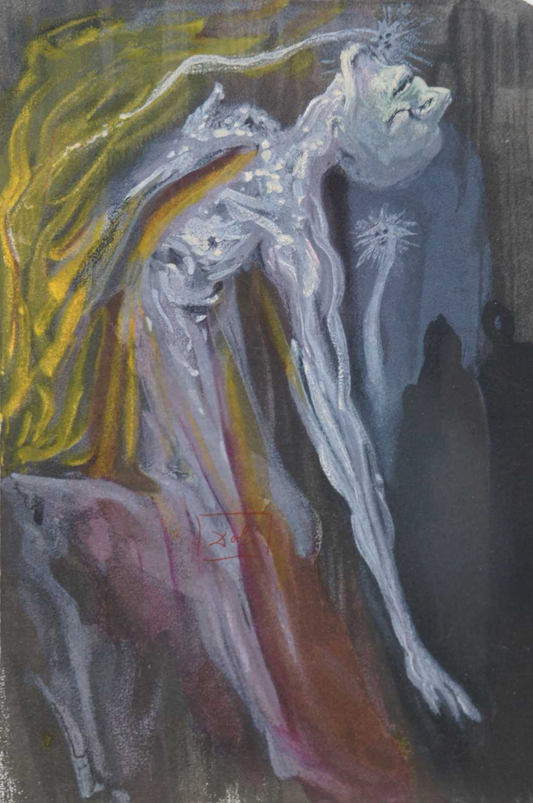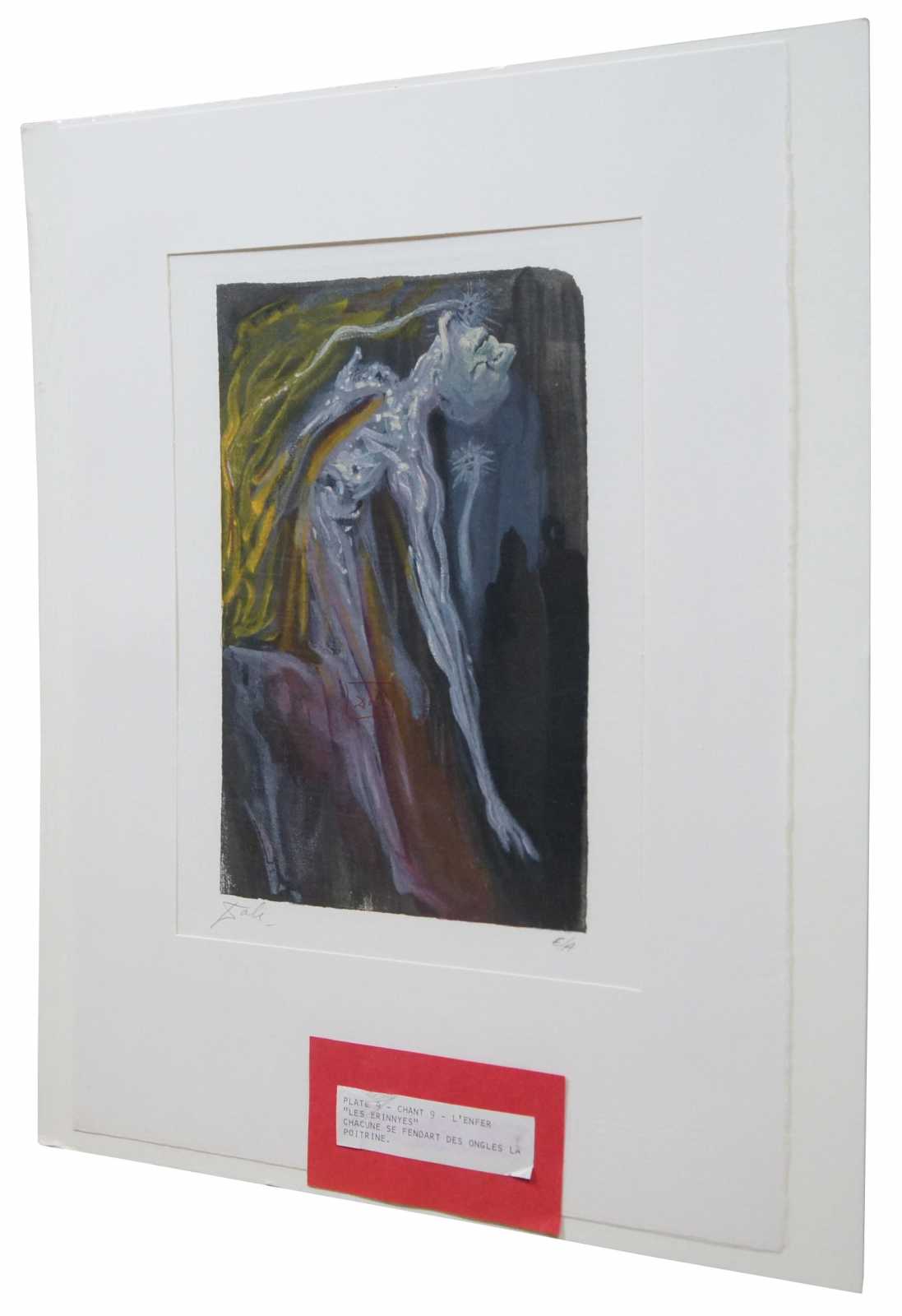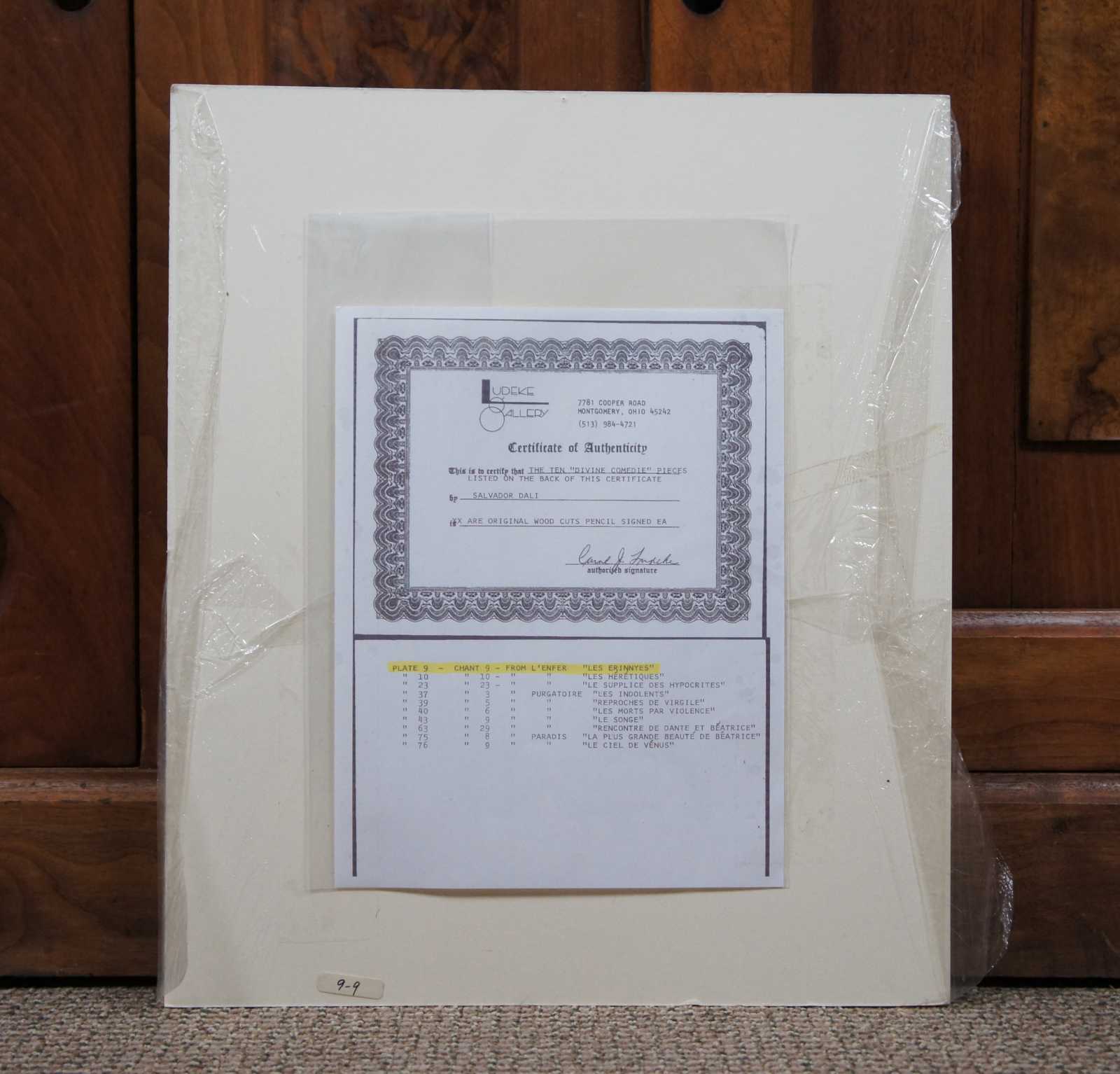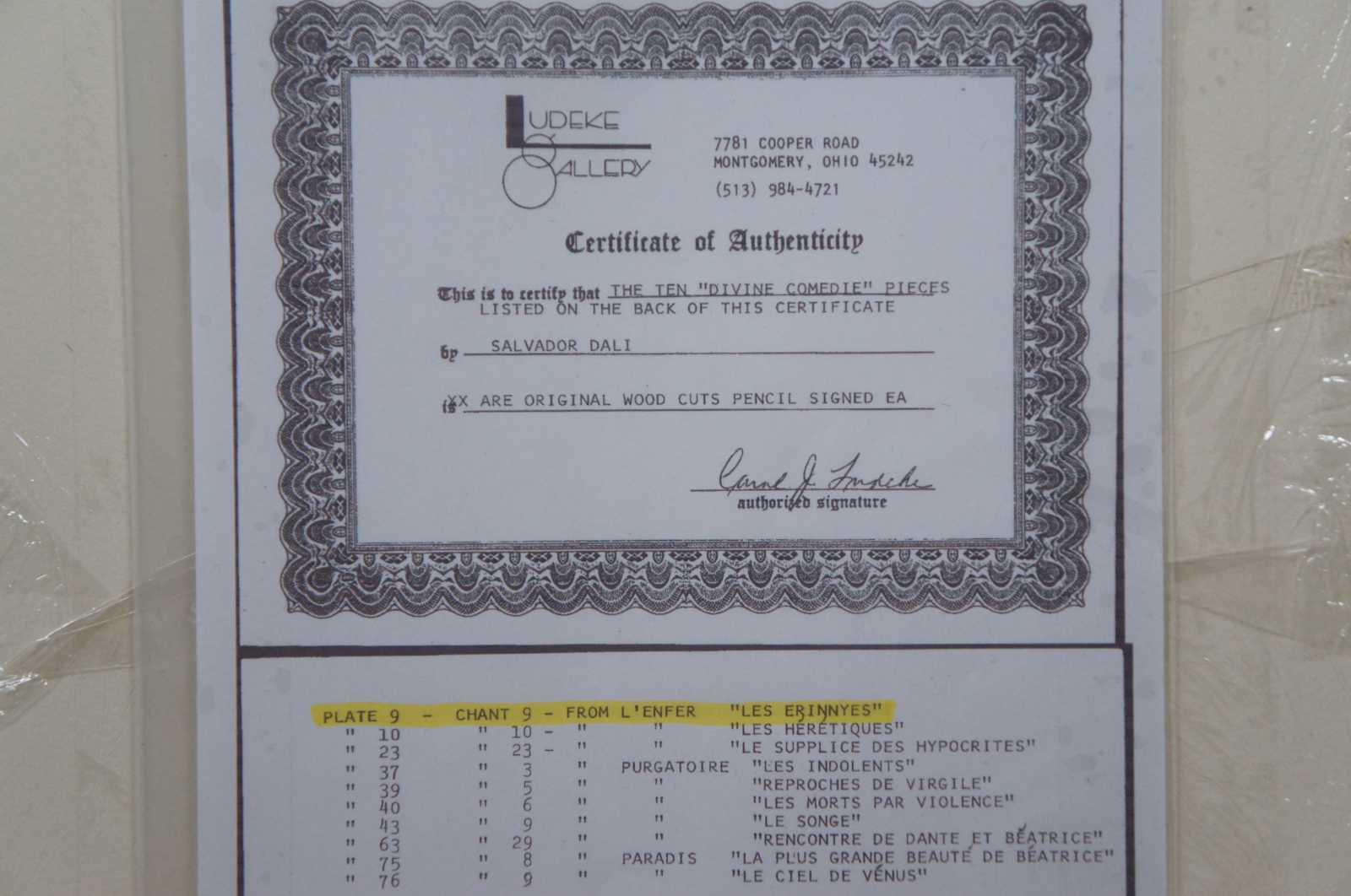 Original woodcut artist’s proof print, pencil signed by Salvador Dali – Plate 9 – Chant/Canto 9 – from L’Enfer (Hell) – “Les Erinnyes” (The Furies) from the “Divine Comedie” series. Original certificate of authenticity covered 10 separate prints – photocopy included.