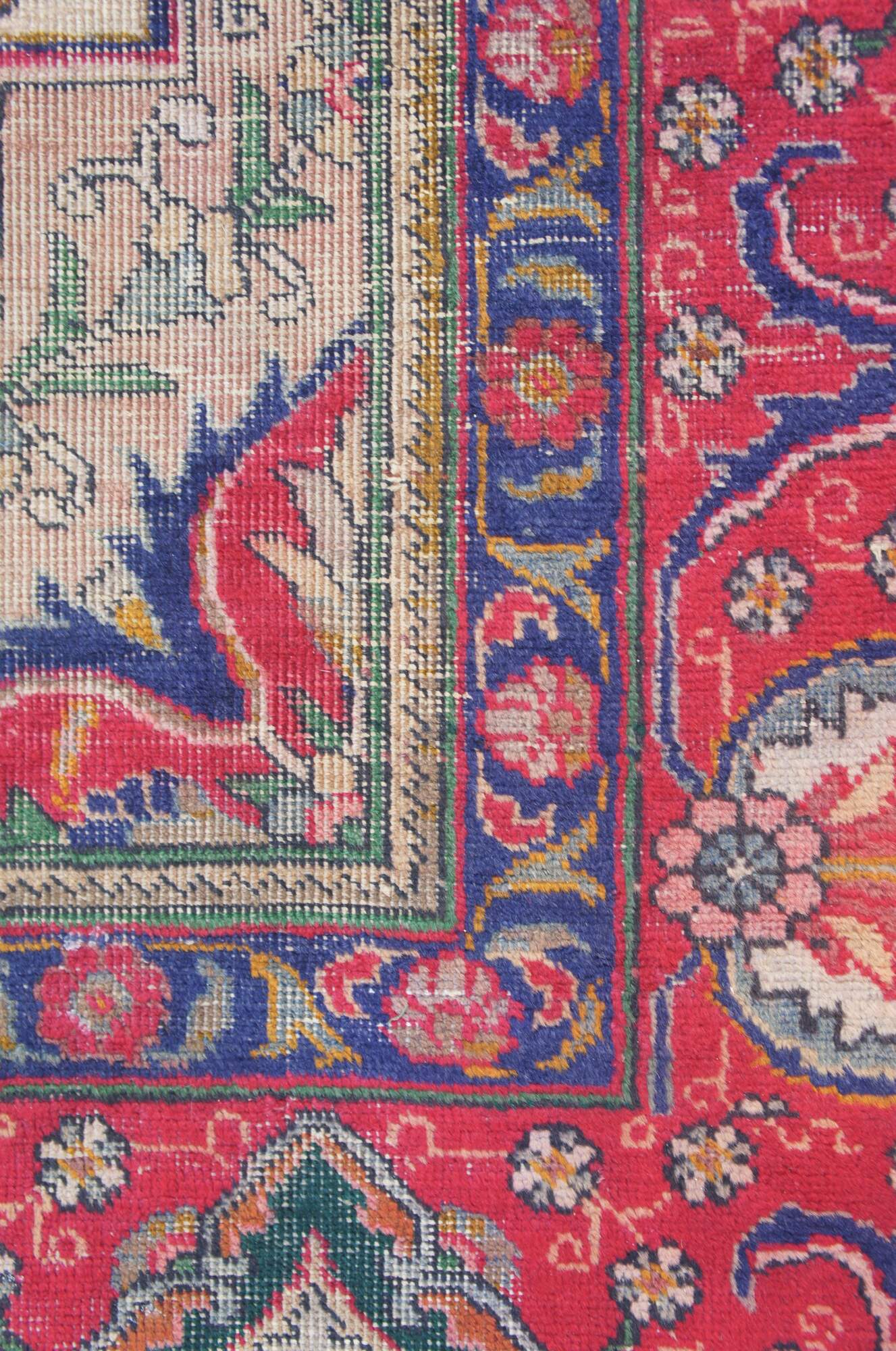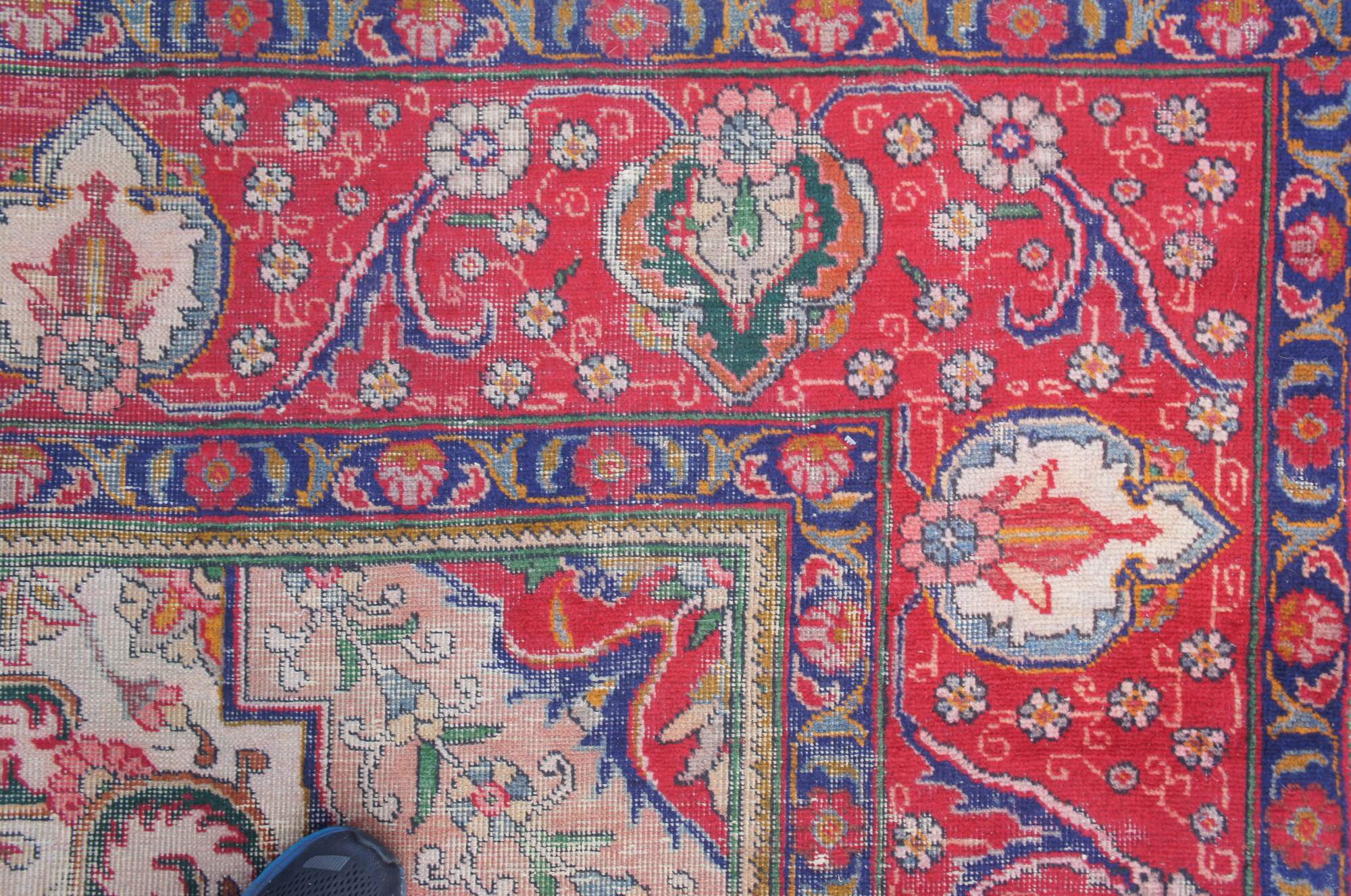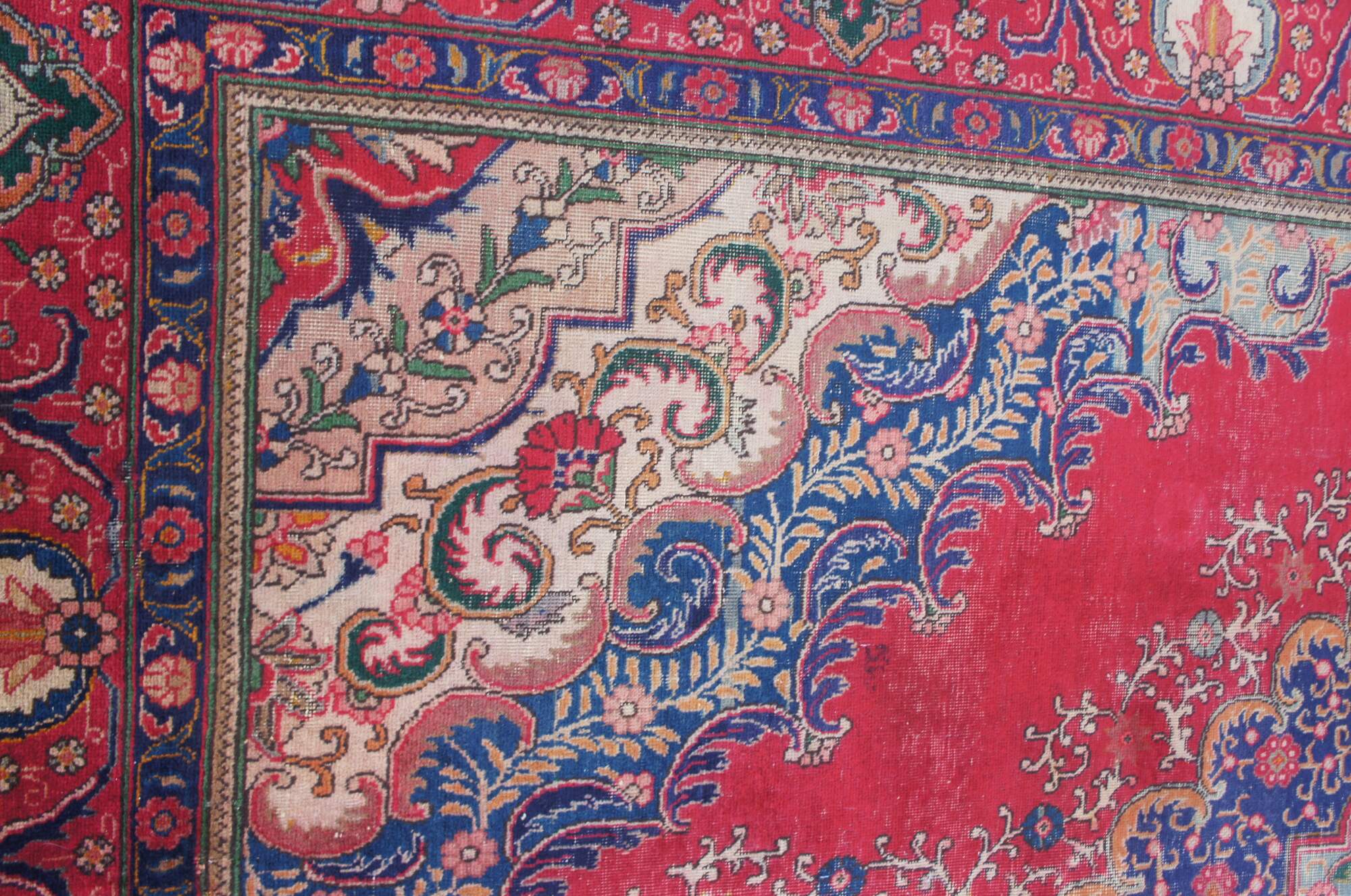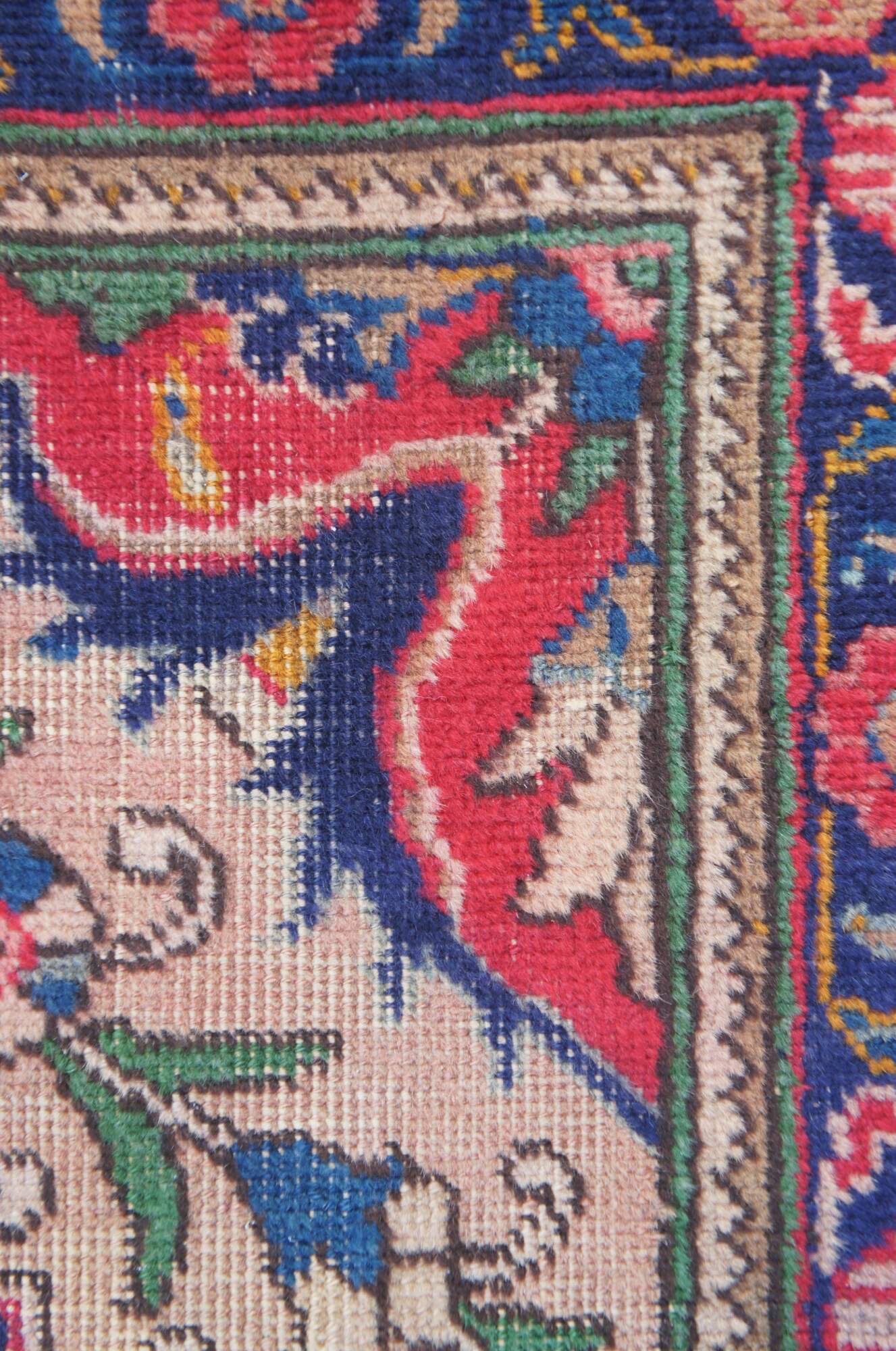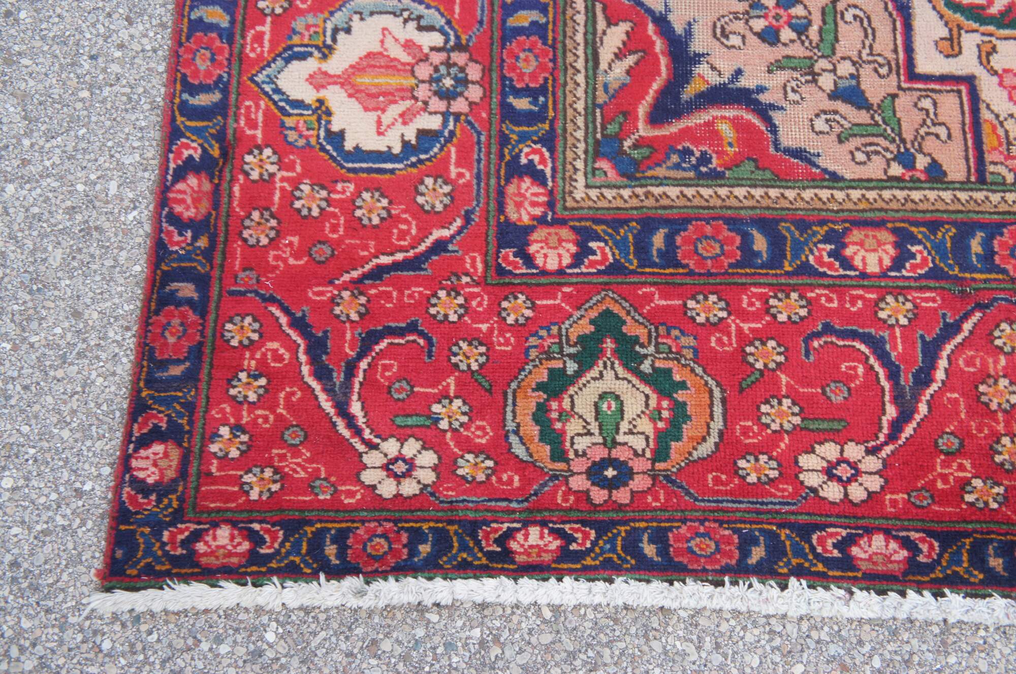 Very Fine wool oriental area rug from the second half of the 20th century. Hand knotted from wool with exquisite layered medallion and foliate detail throughout. Includes shades of red, blue, green, pink, beige and orange. 196 kpsi