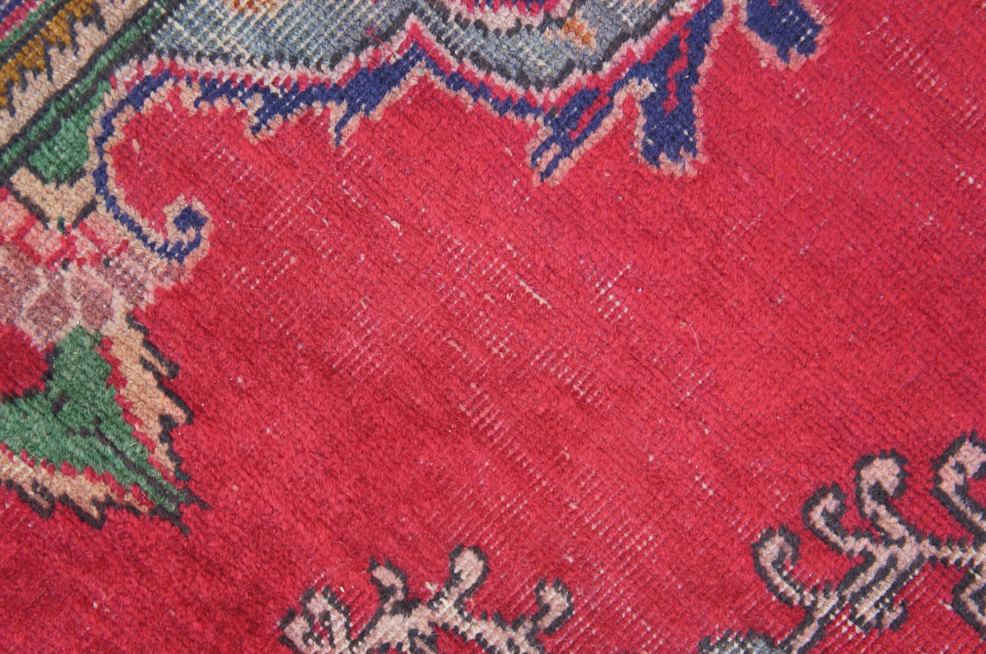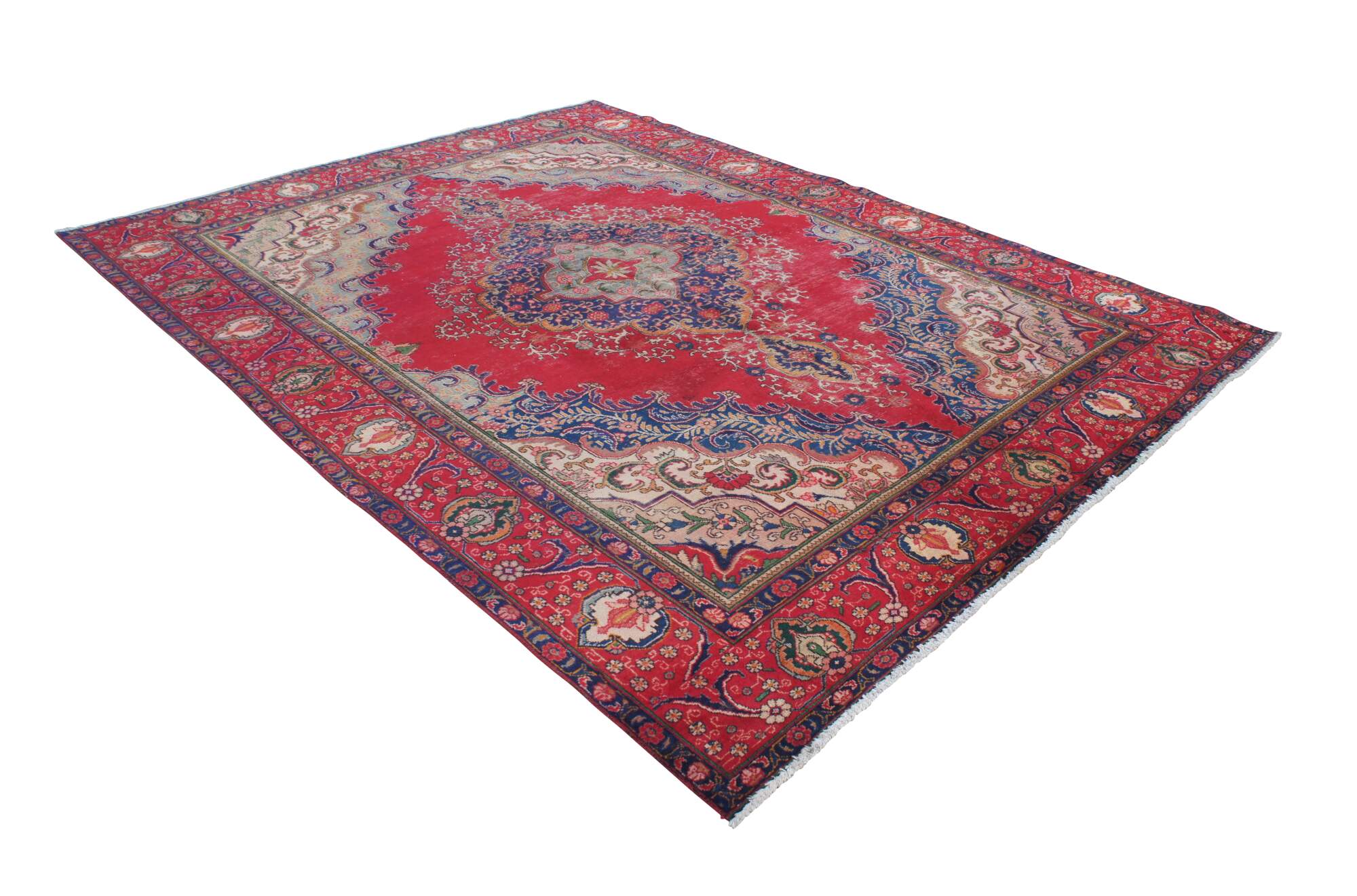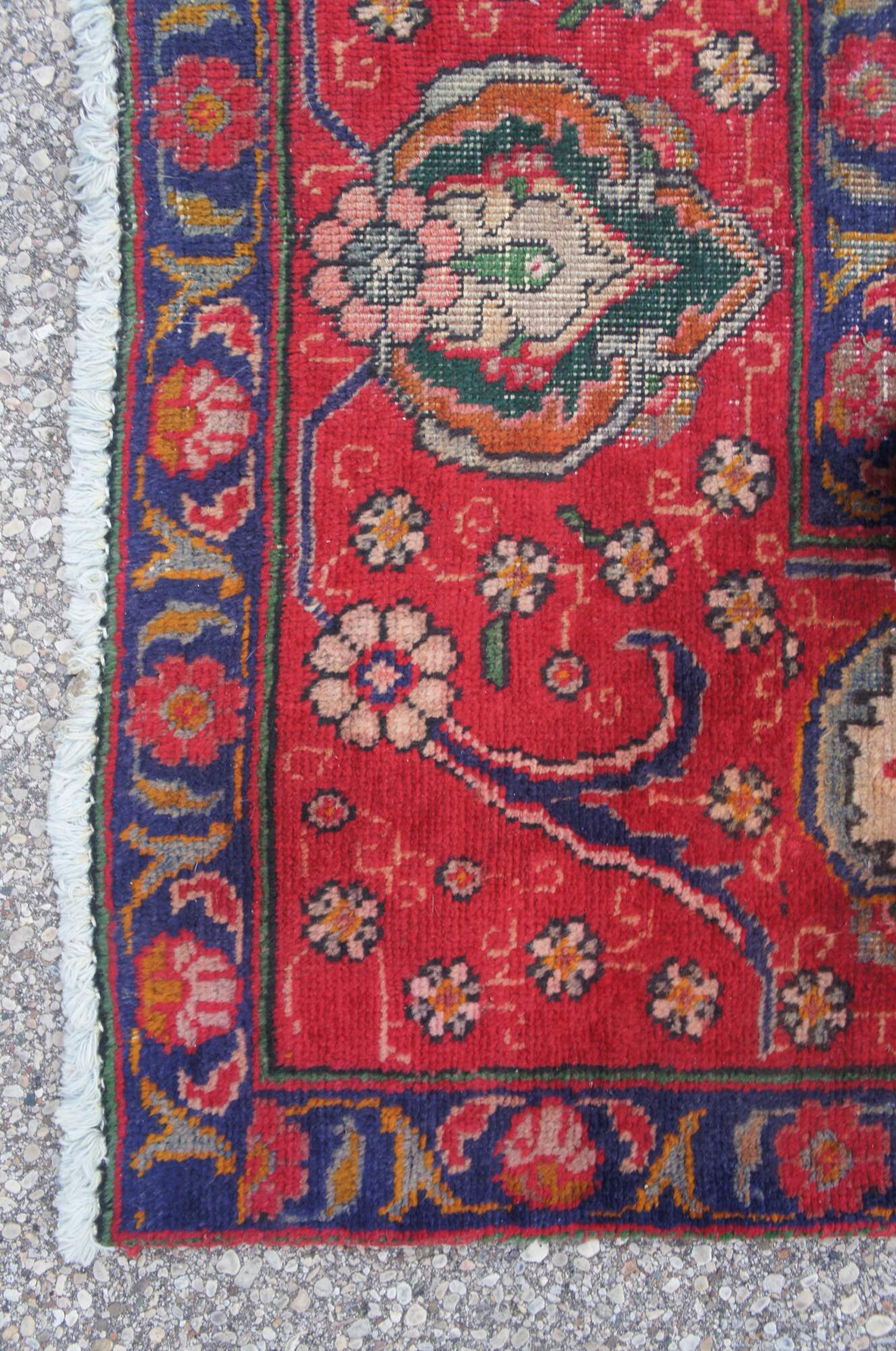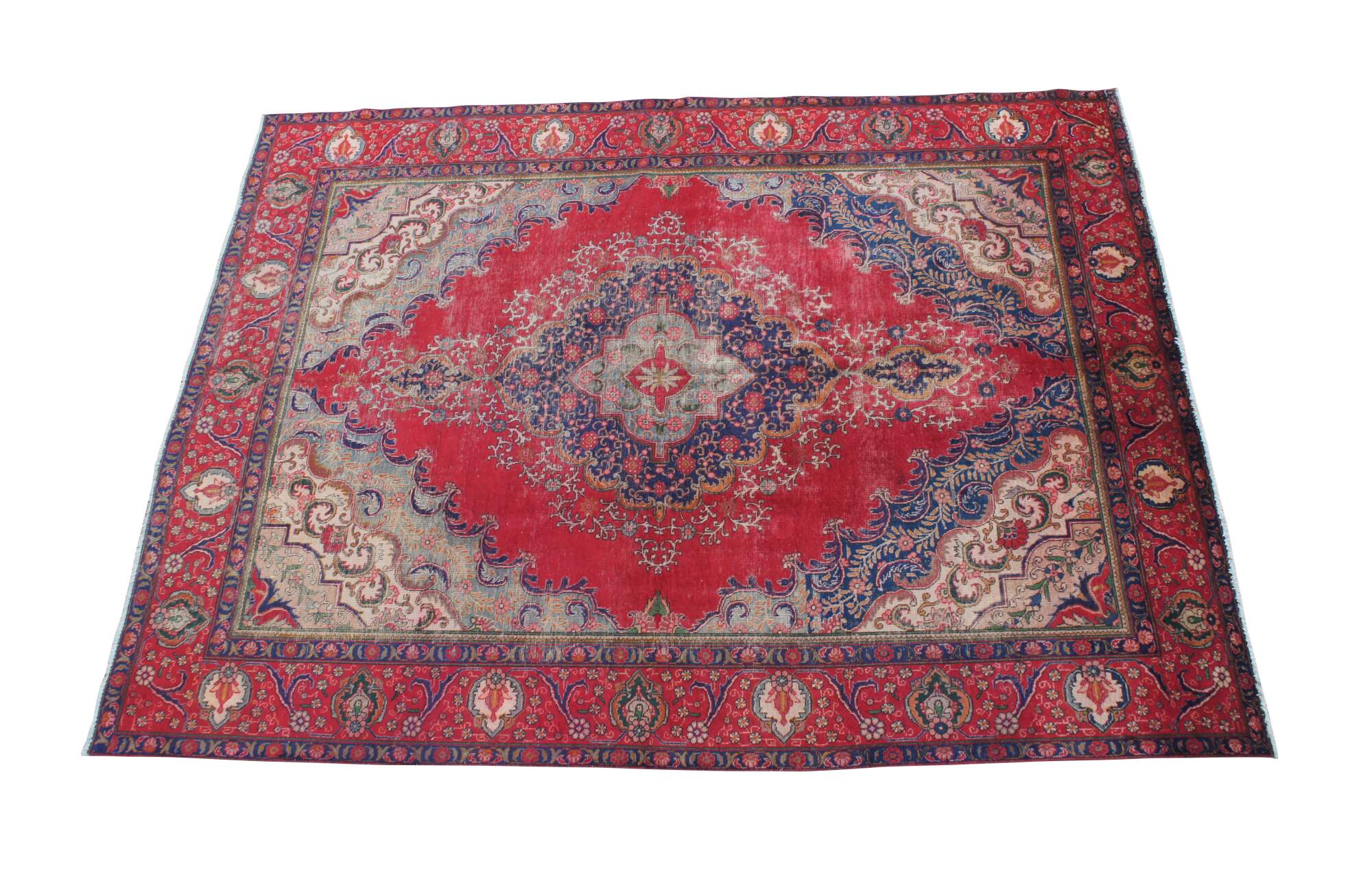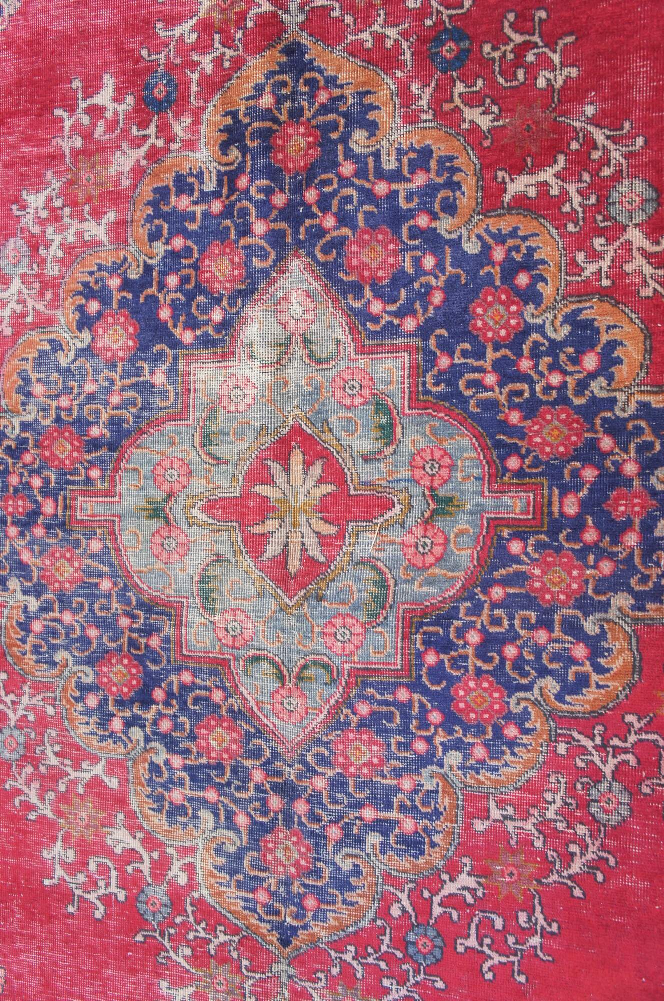 Very Fine wool oriental area rug from the second half of the 20th century. Hand knotted from wool with exquisite layered medallion and foliate detail throughout. Includes shades of red, blue, green, pink, beige and orange. 196 kpsi