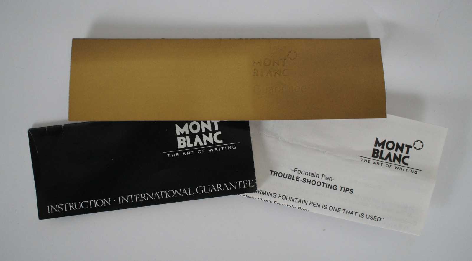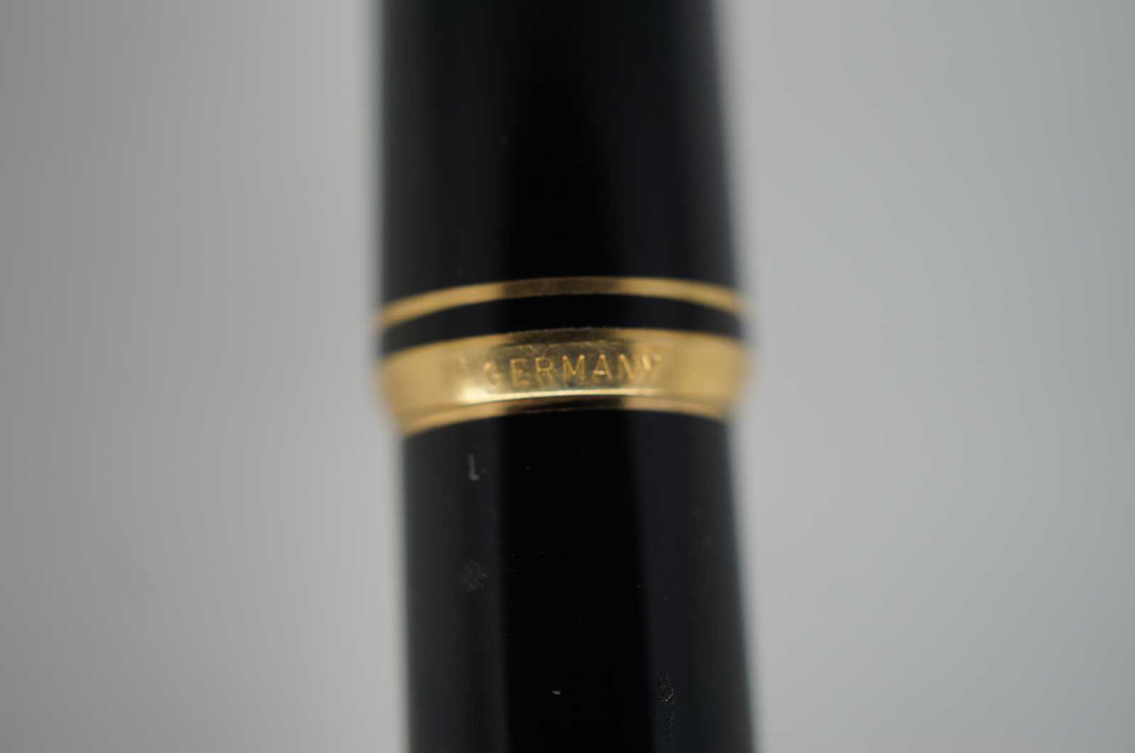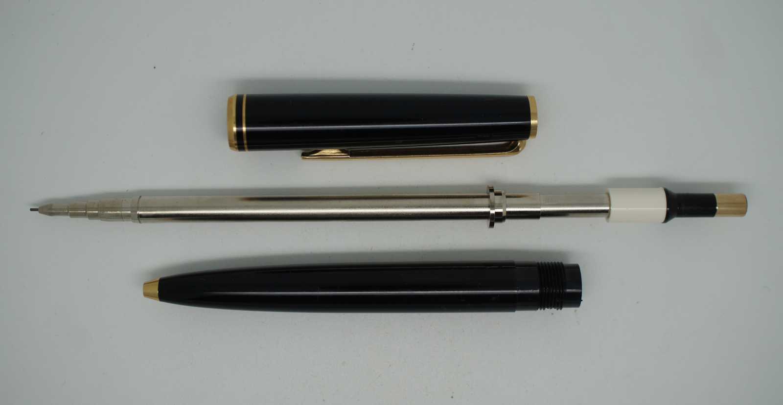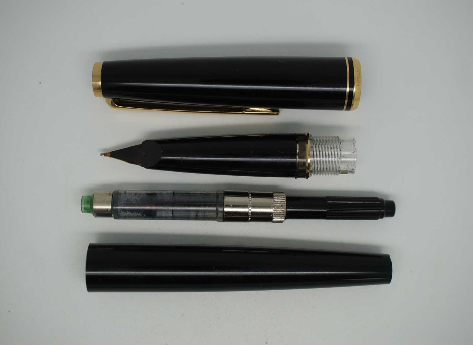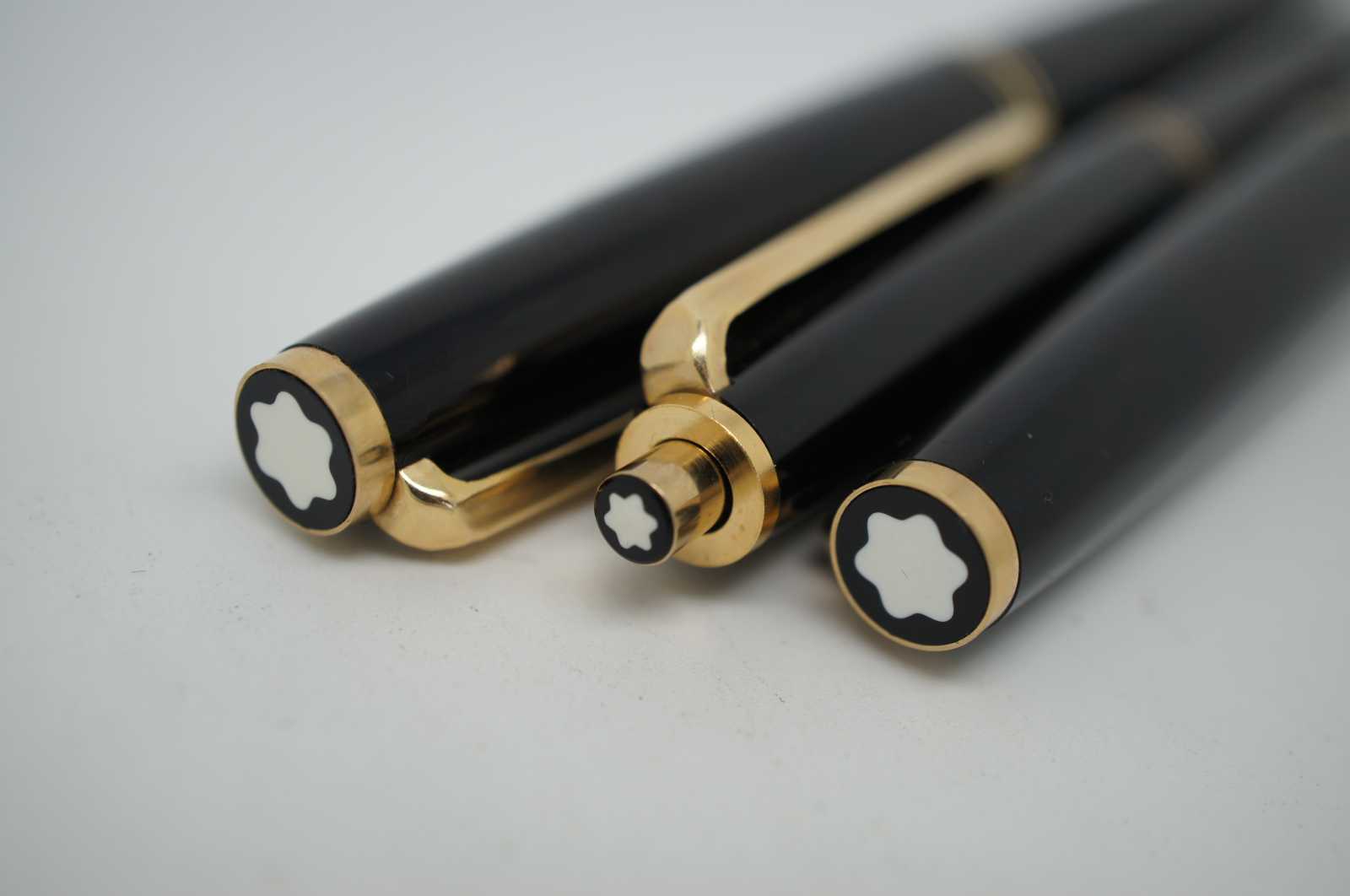 Vintage Montblanc three piece mechanical pencil and cartridge filled fountain pen set with 14K Gold 585 nibs. Two 10 count packages of Black and Royal Blue ink cartridges included.