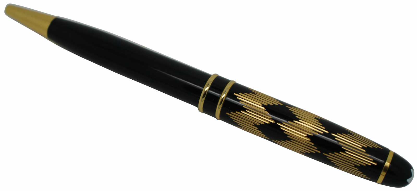 Vintage Montblanc Solitaire ballpoint pen in black with a gold hatch mark diamond pattern on the barrel.