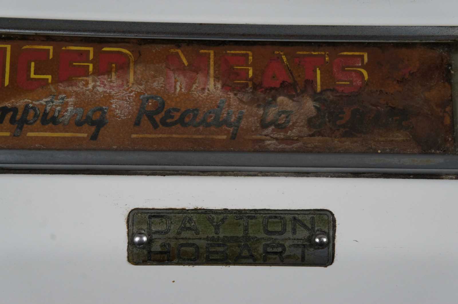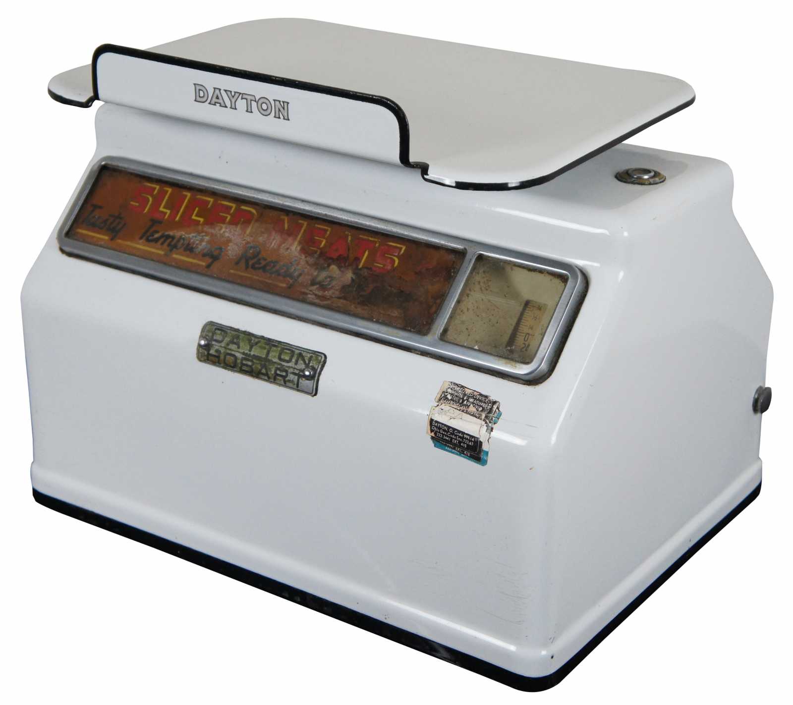 Vintage white enameled Dayton Scale Division meat scale, made at the Hobart Manufacturing Company, style 970, 30lb capacity.