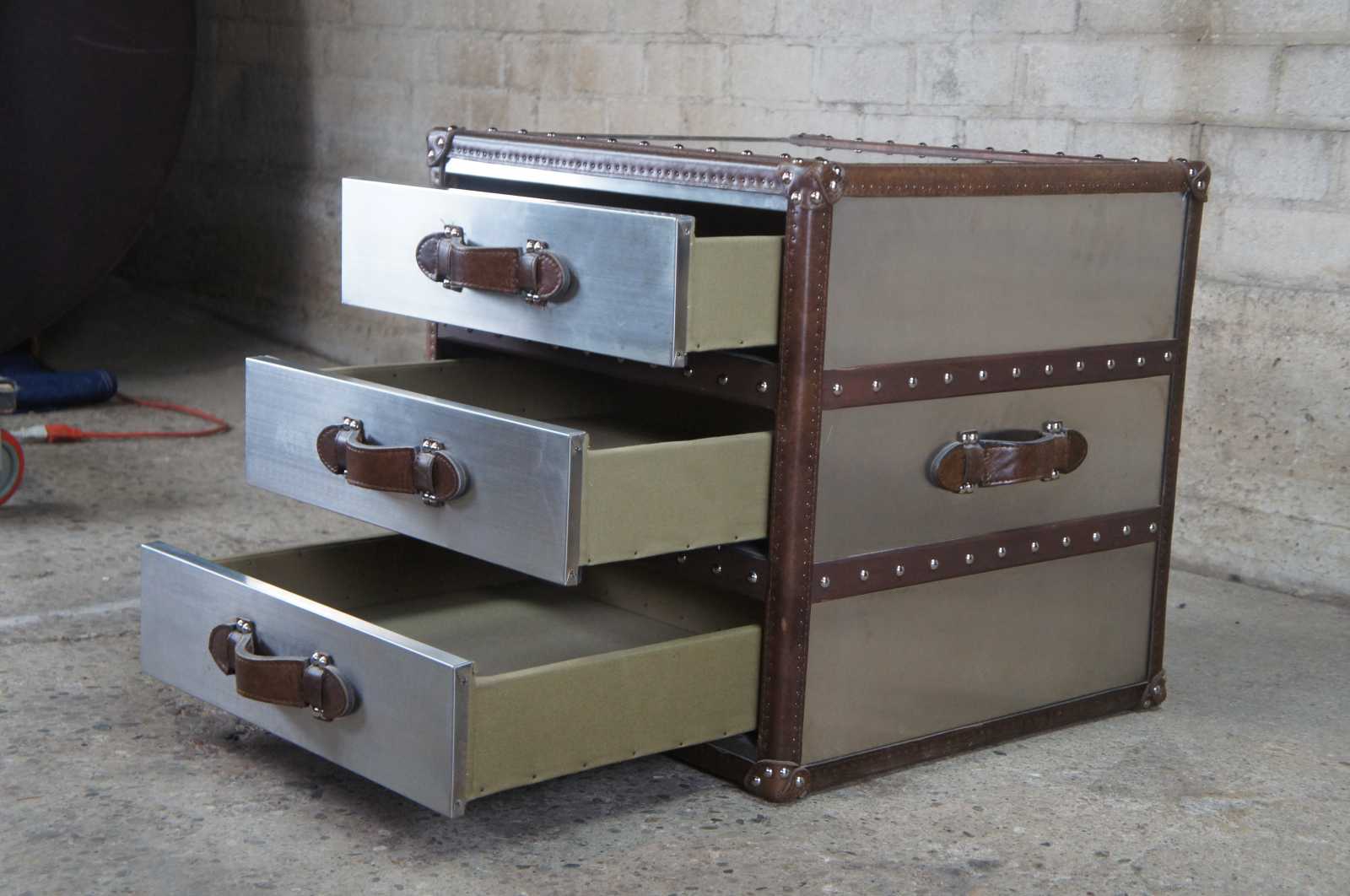 Leather-bound corner brackets, leather-wrapped handles, oak slats with a tobacco finish and cast-metal antiqued hardware
