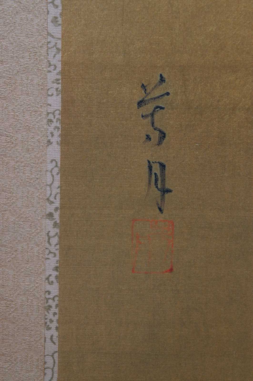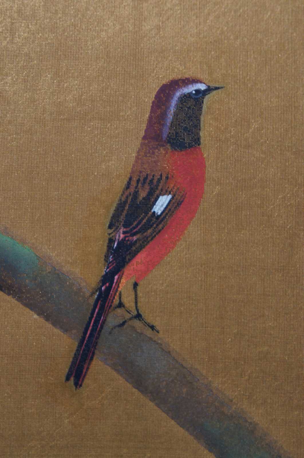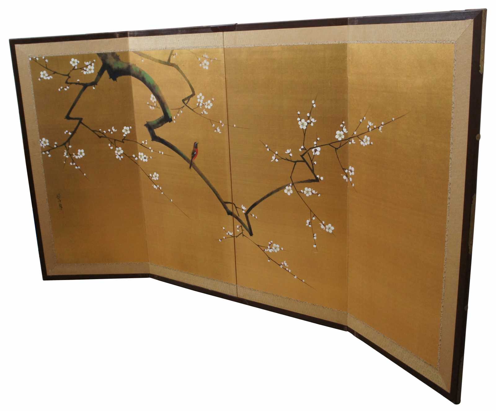Vintage hand painted Japanese byobu room screen featuring a bird perched on a flowering tree branch on a gold background.