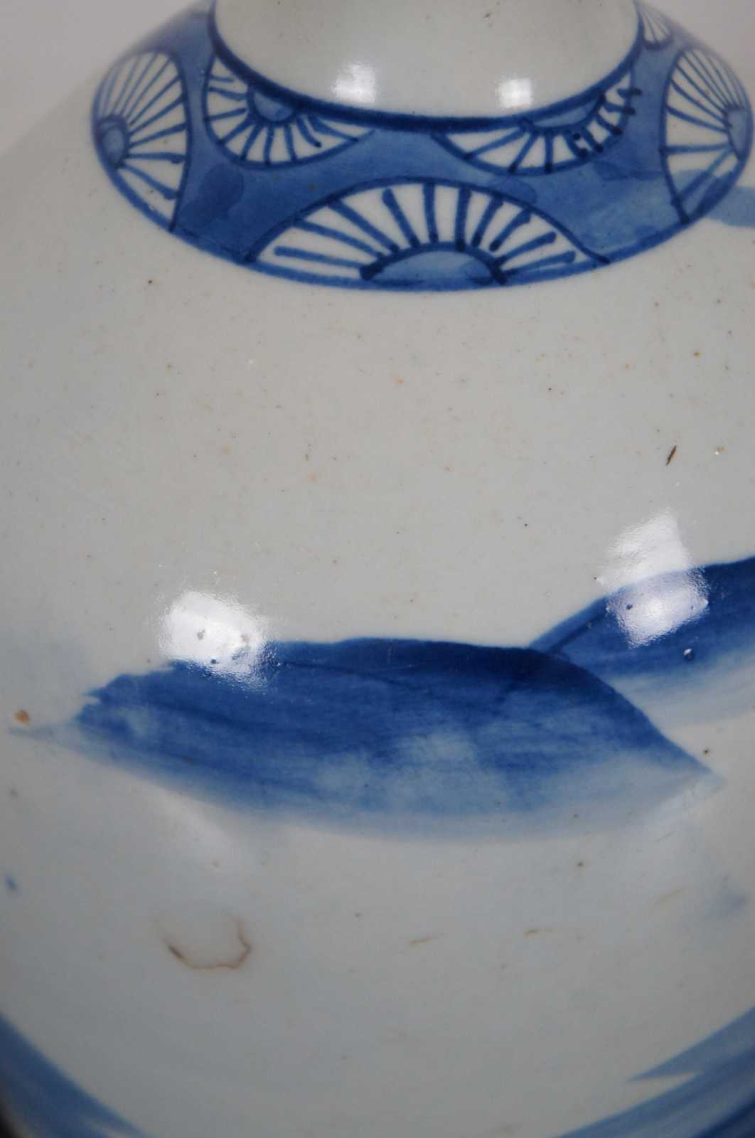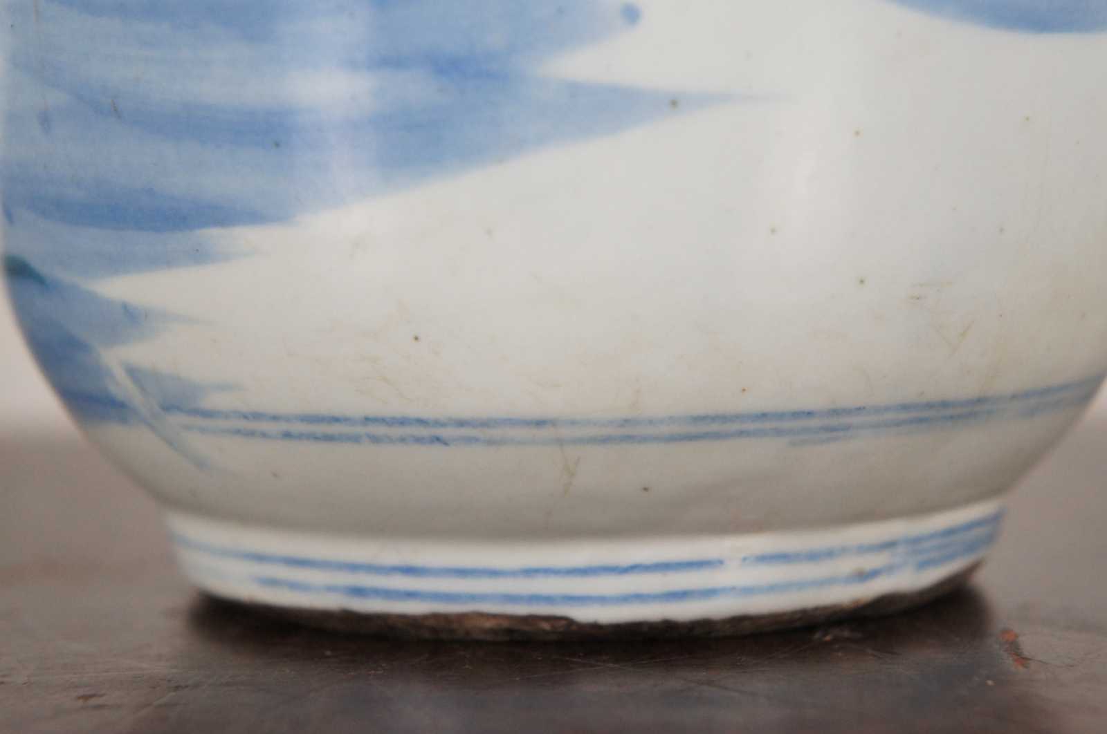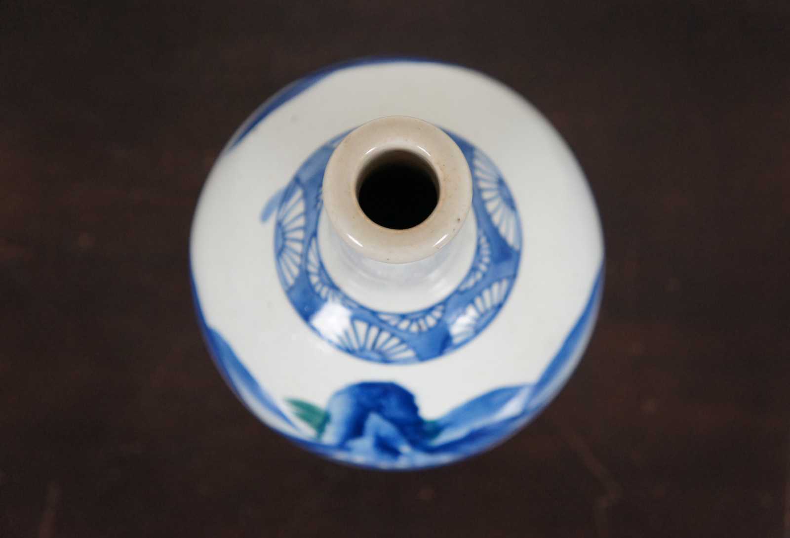 Antique Japanese ceramic tokkuri or sake bottle with a blue painted landscape.