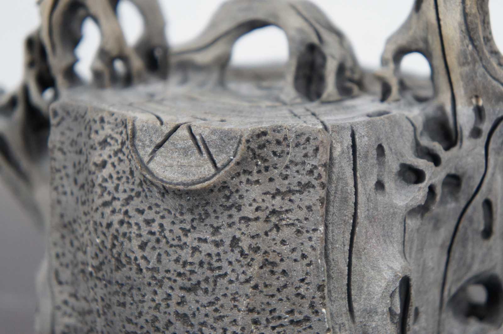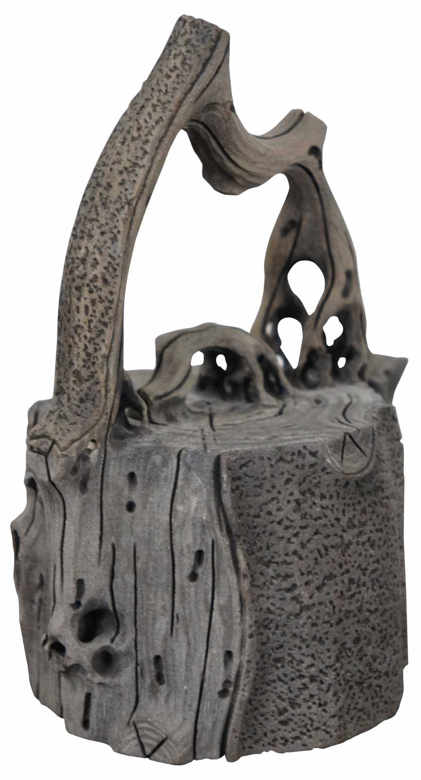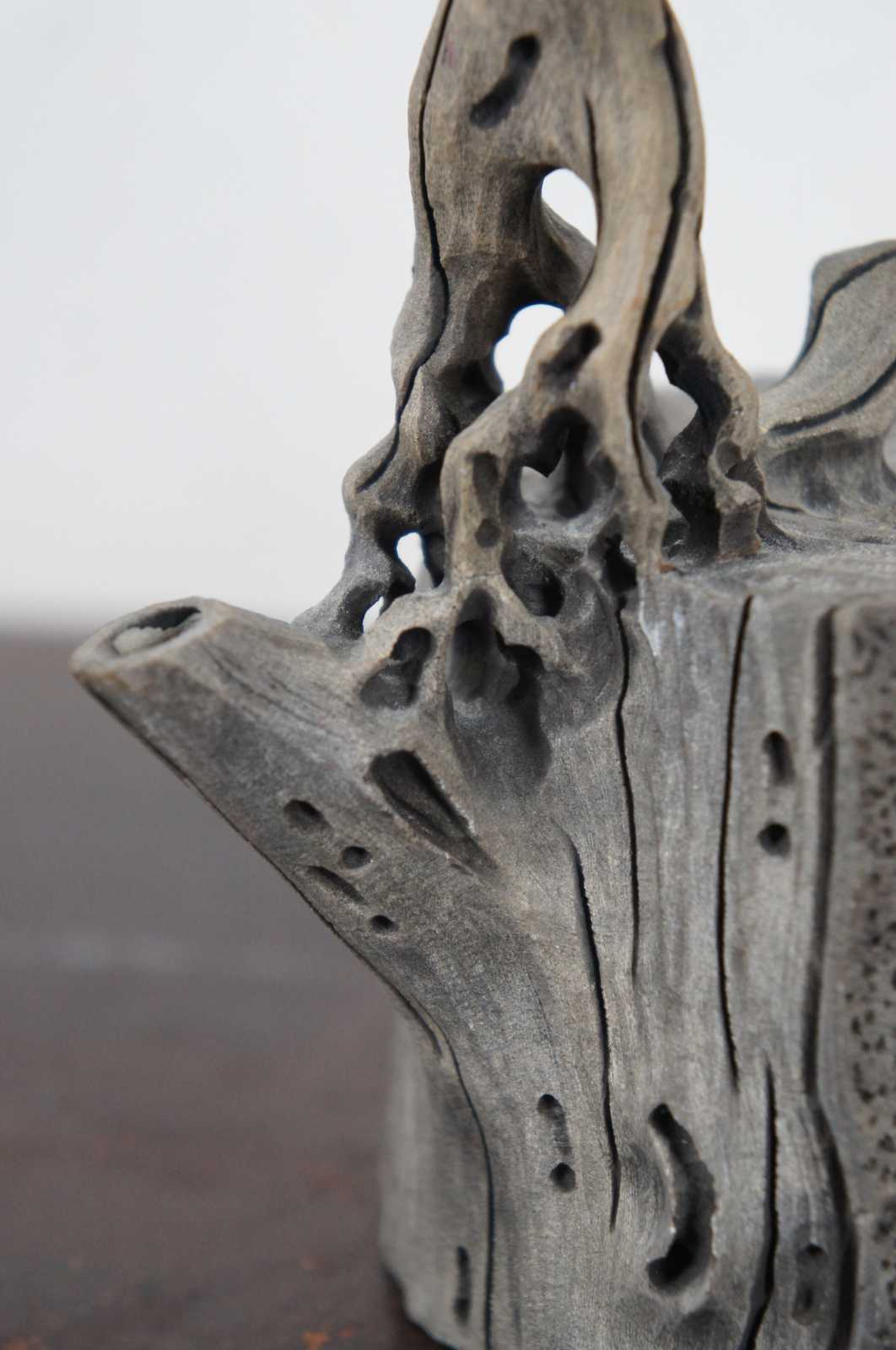 Vintage gray yixing zisha Chinese ceramic teapot shaped like a gnarled tree stump. Marked on base.