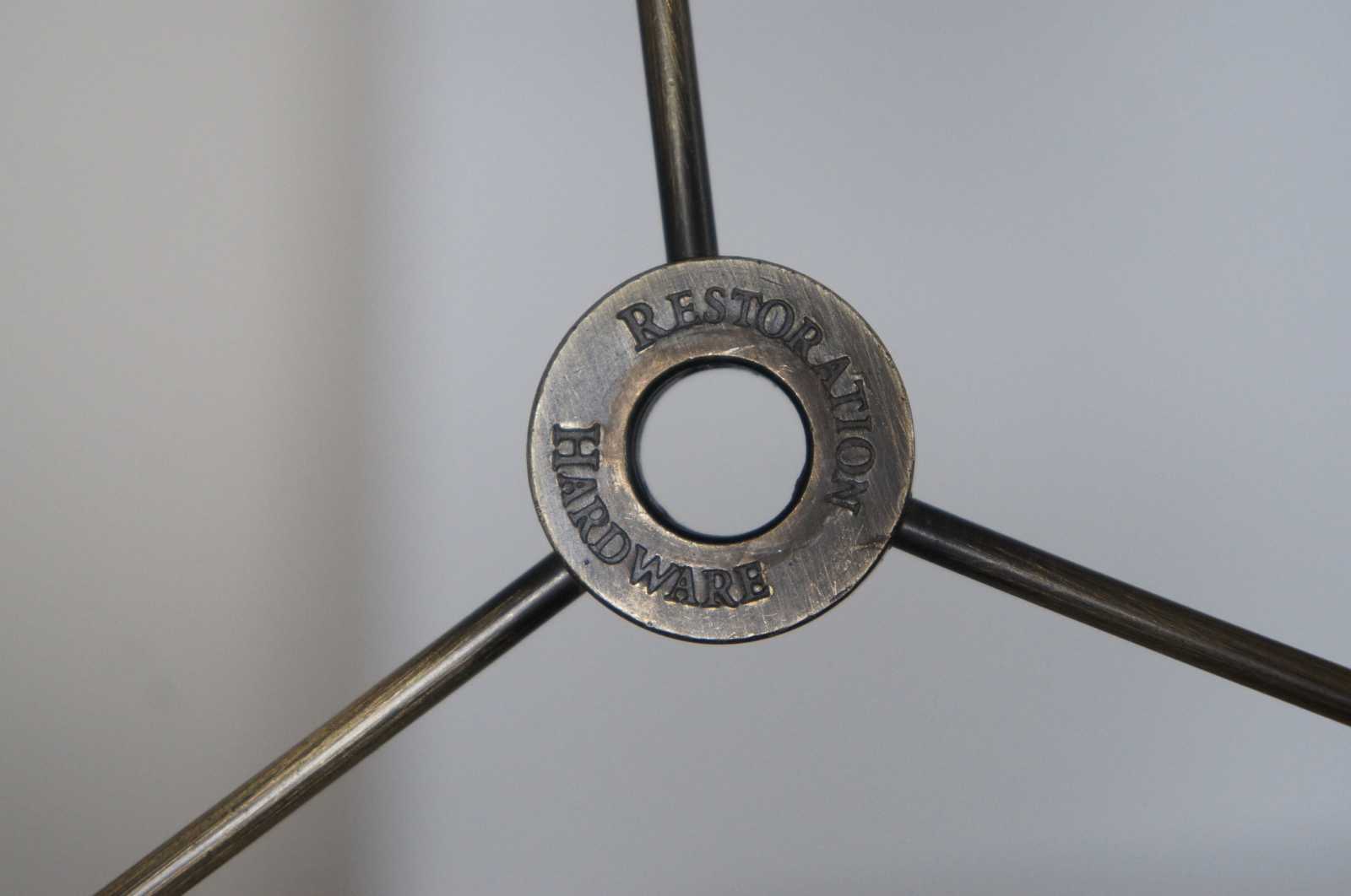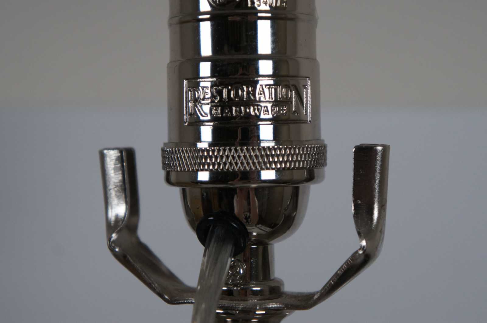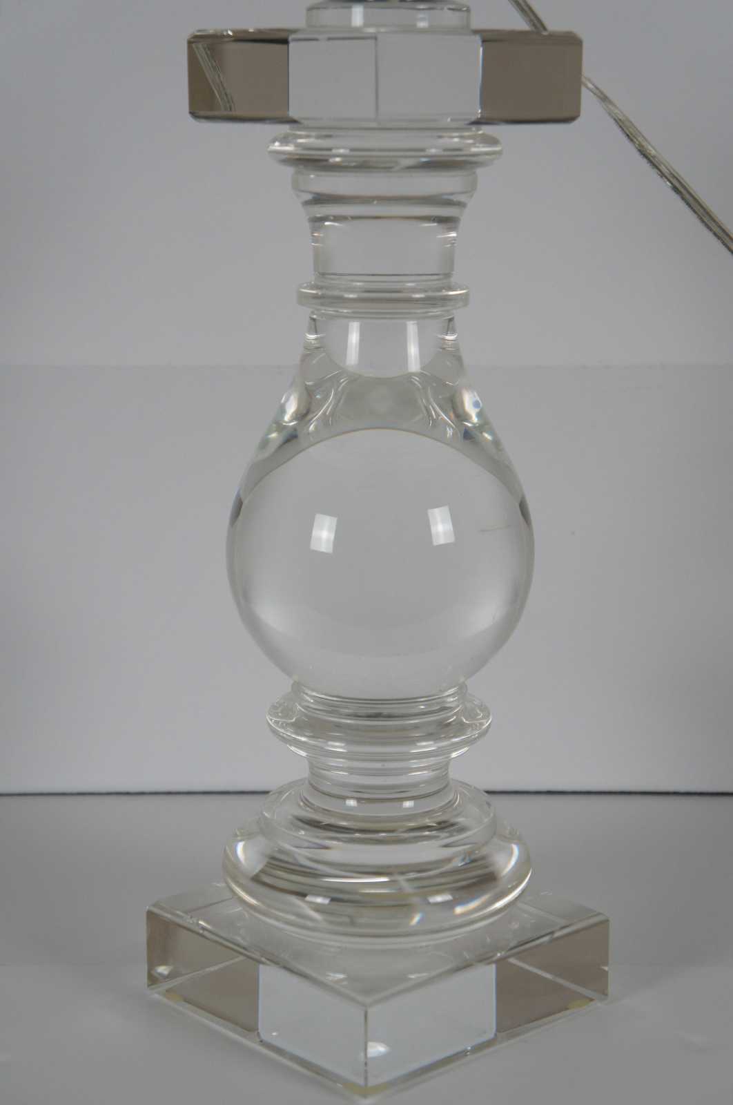 Large clear glass balustrade style table lamp with golden beige shade by Restoration Hardware; very heavy.