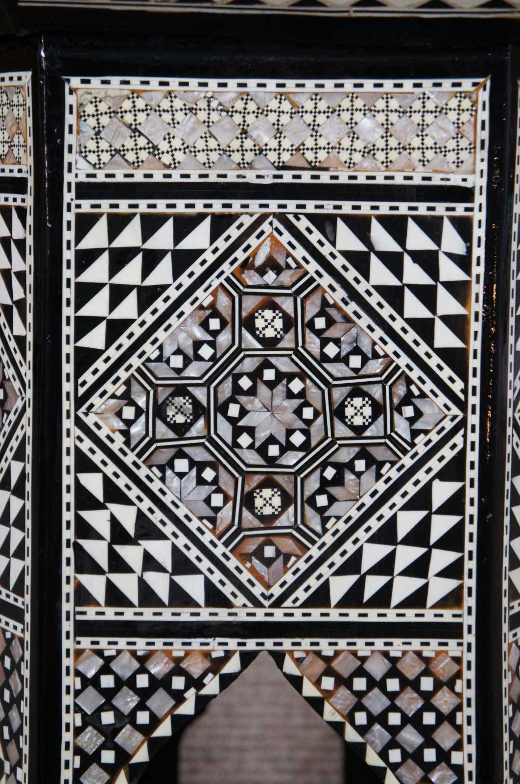 Elegant Moroccan/Moorish style accent table with a black lacquer finish inlaid with mother of pearl designs. The hexagonal top lift off to reveal a red velvet lined compartment. Made in Egypt by Desert Designs.