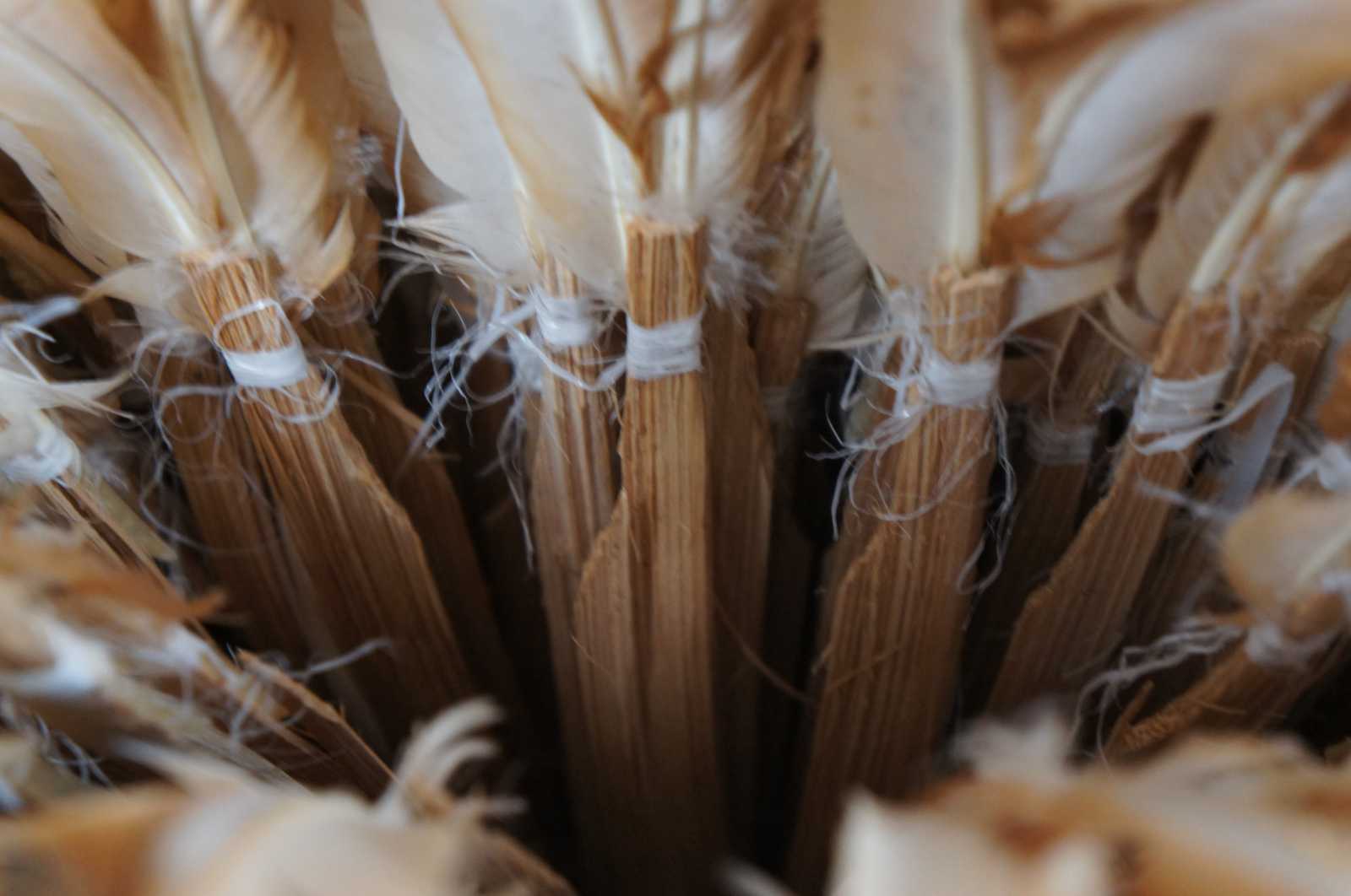 Vintage handmade African Juju feather hat, made of brown and white feathers.