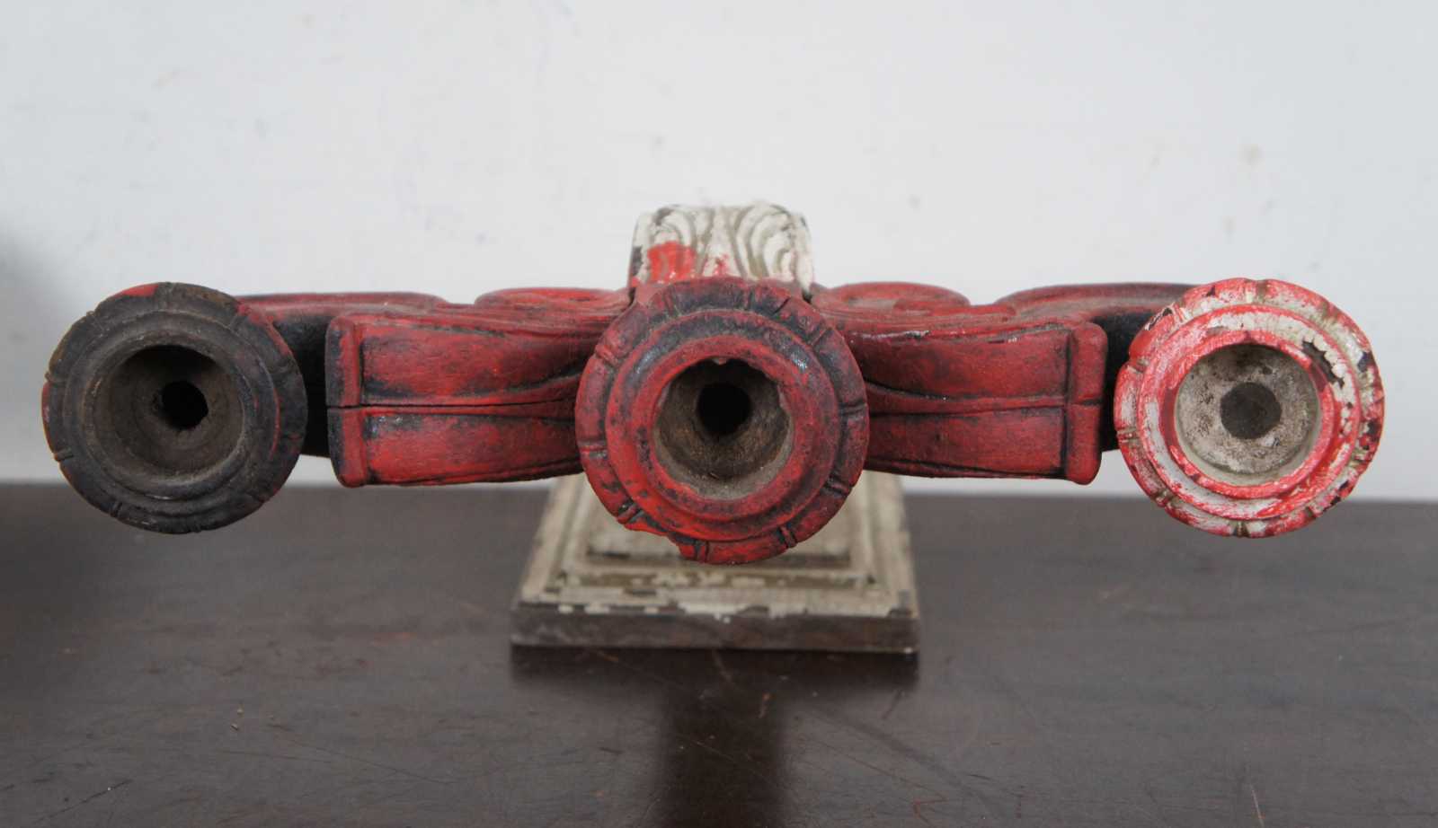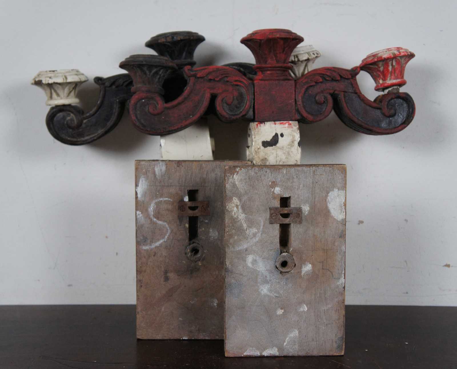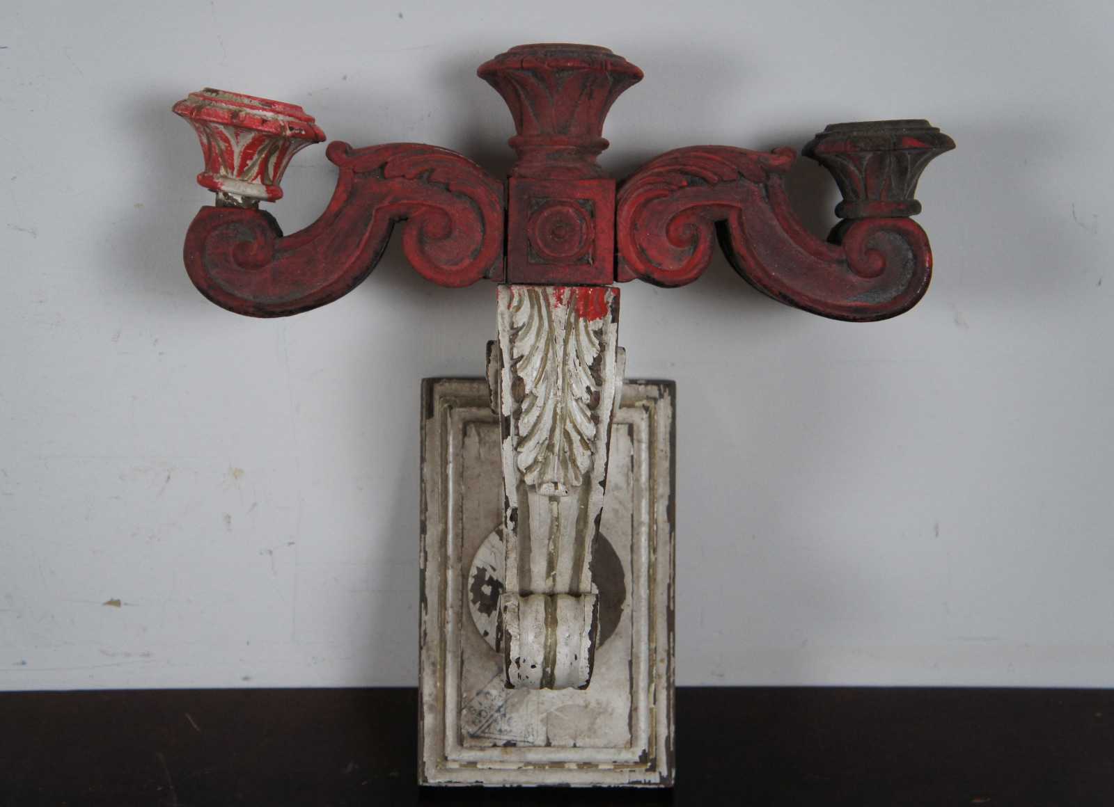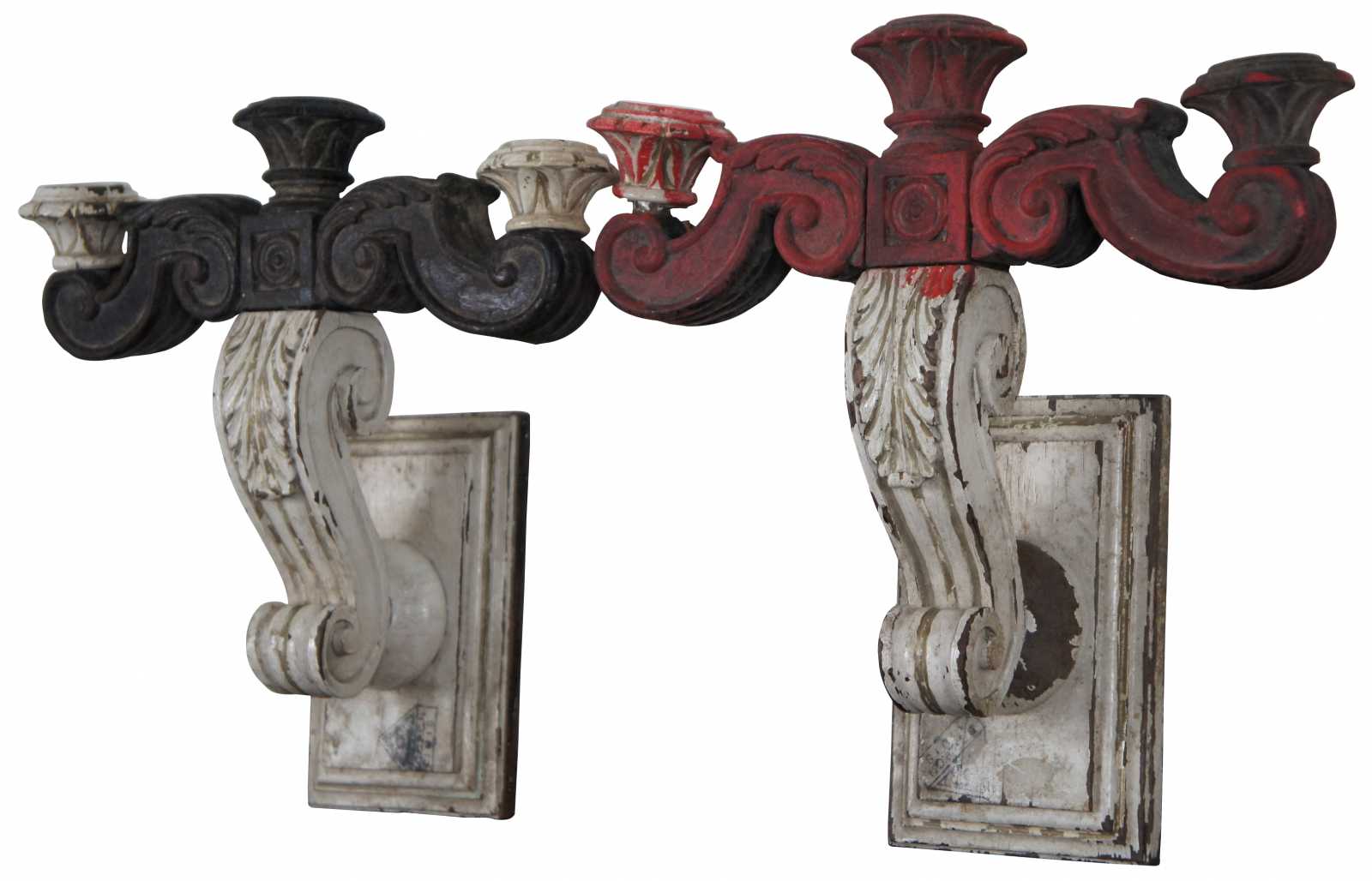 Pair of antique carved wood three arm candle holder wall sconces painted in red and white.