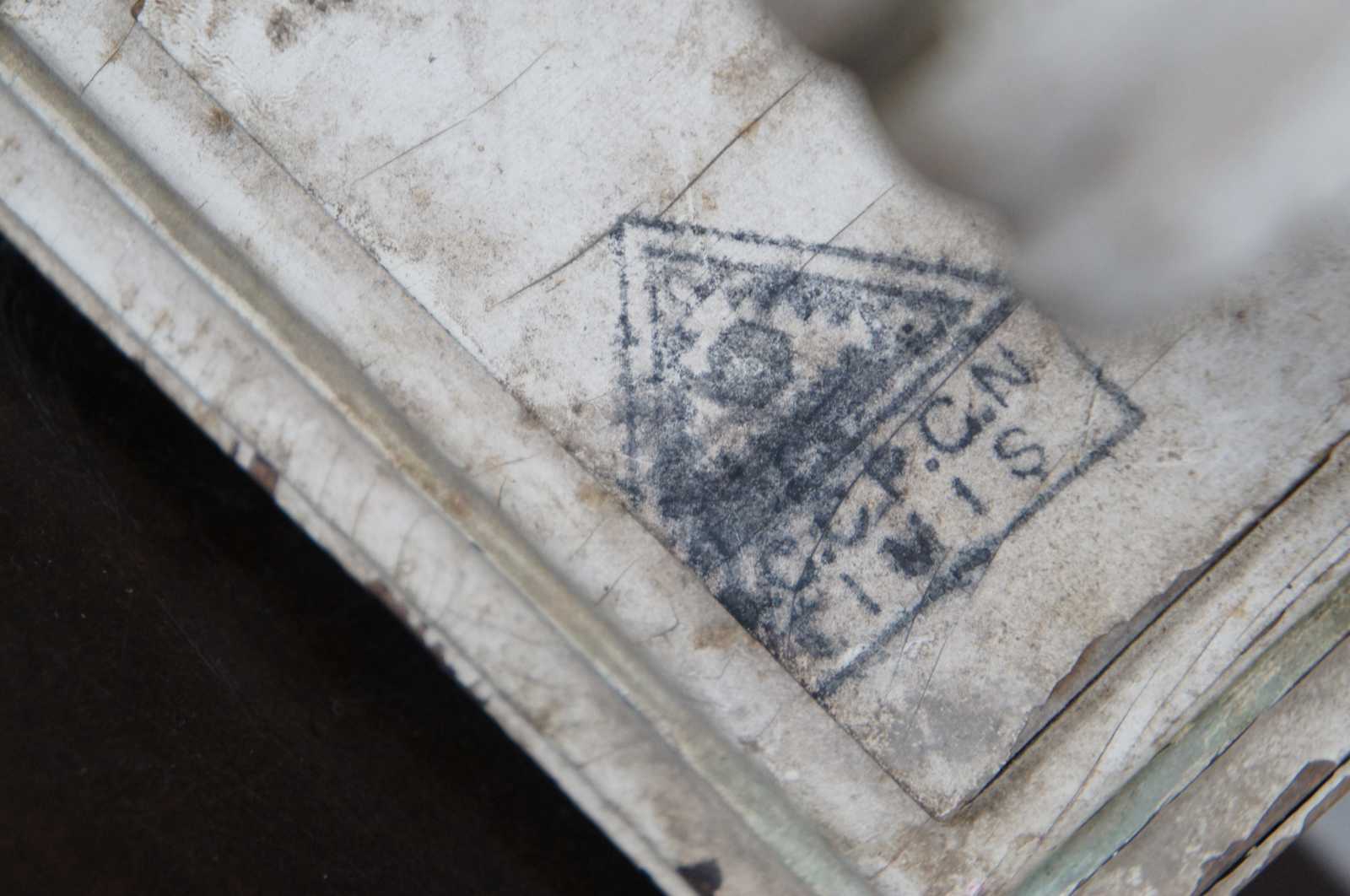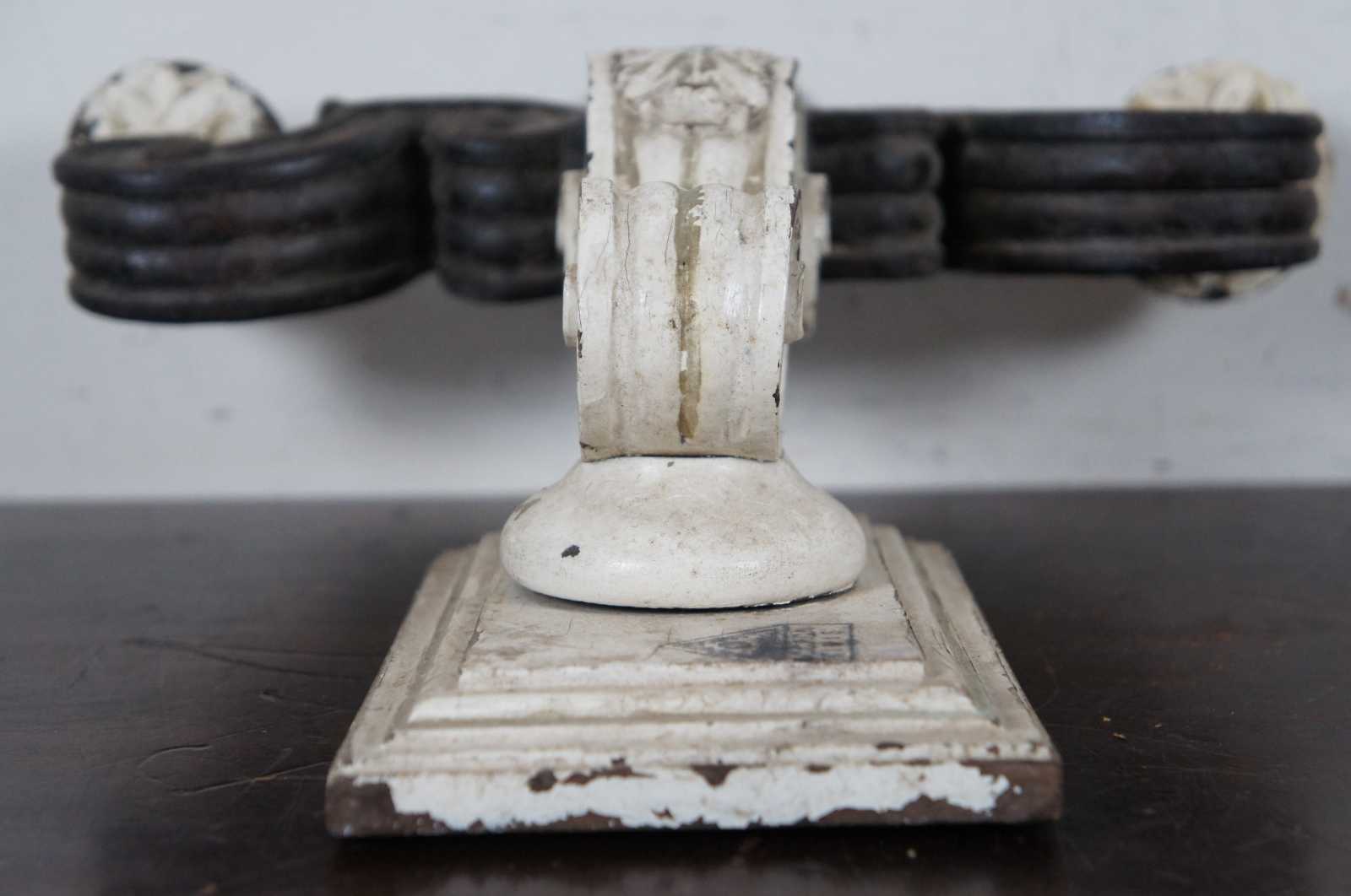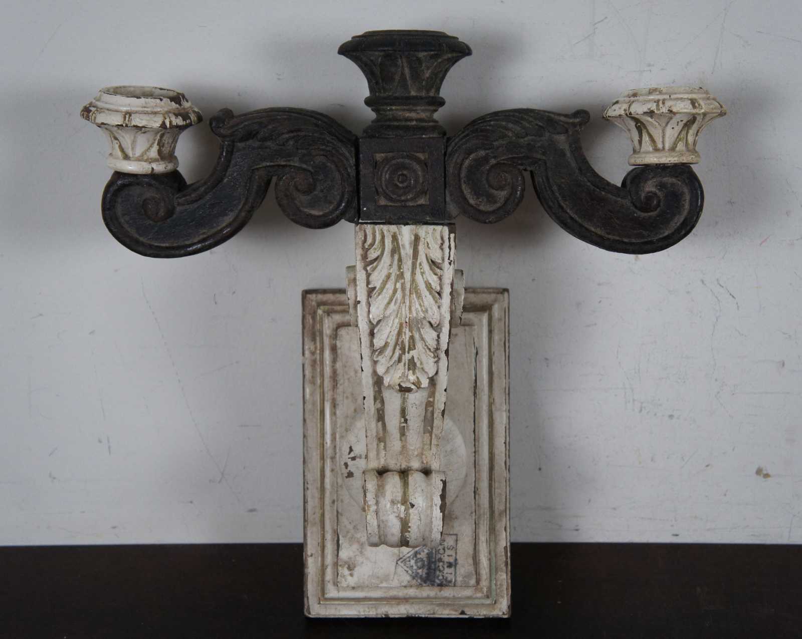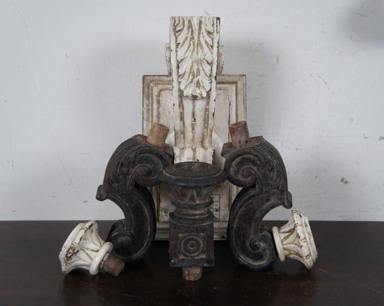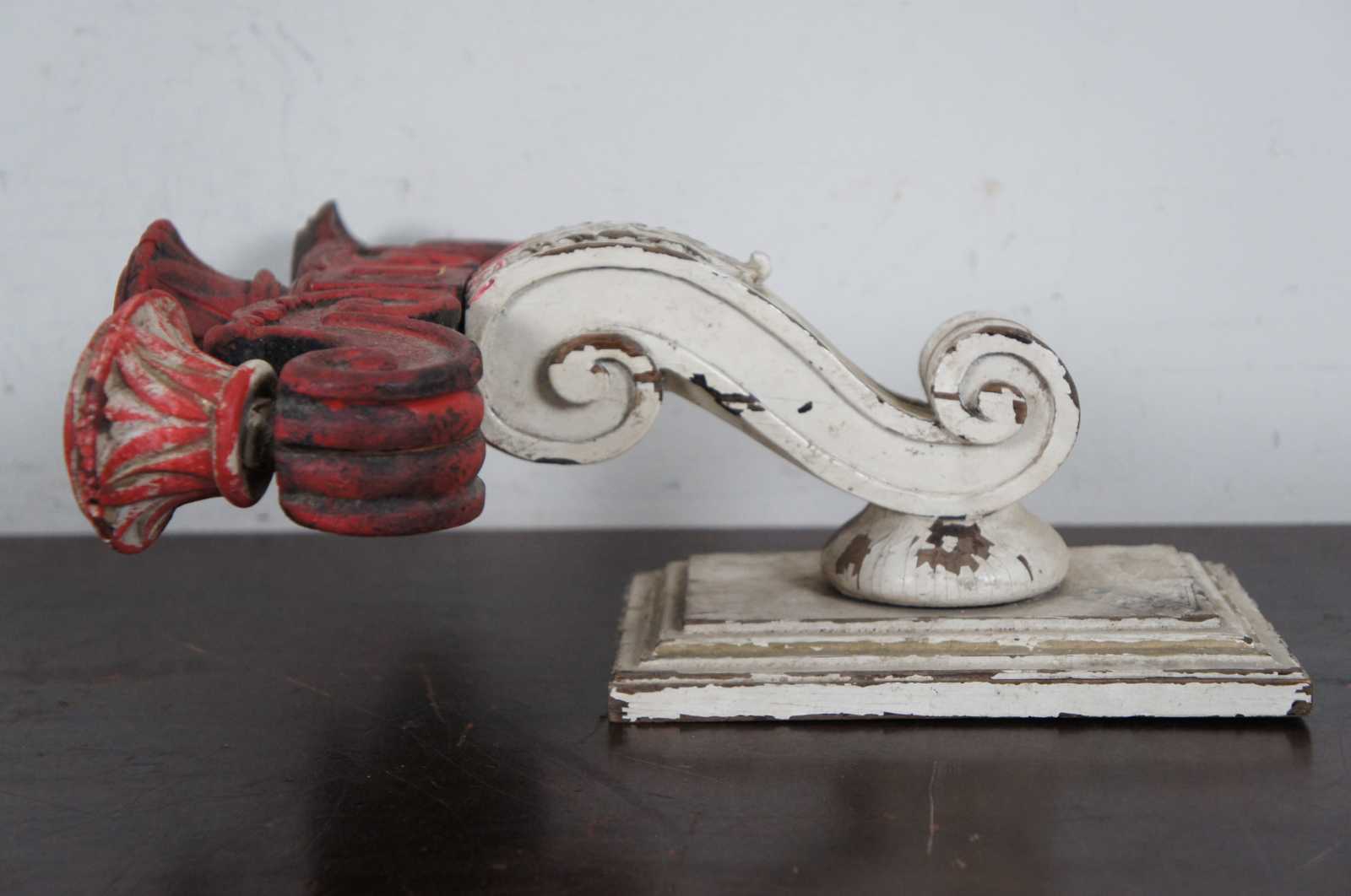 Pair of antique carved wood three arm candle holder wall sconces painted in red and white.