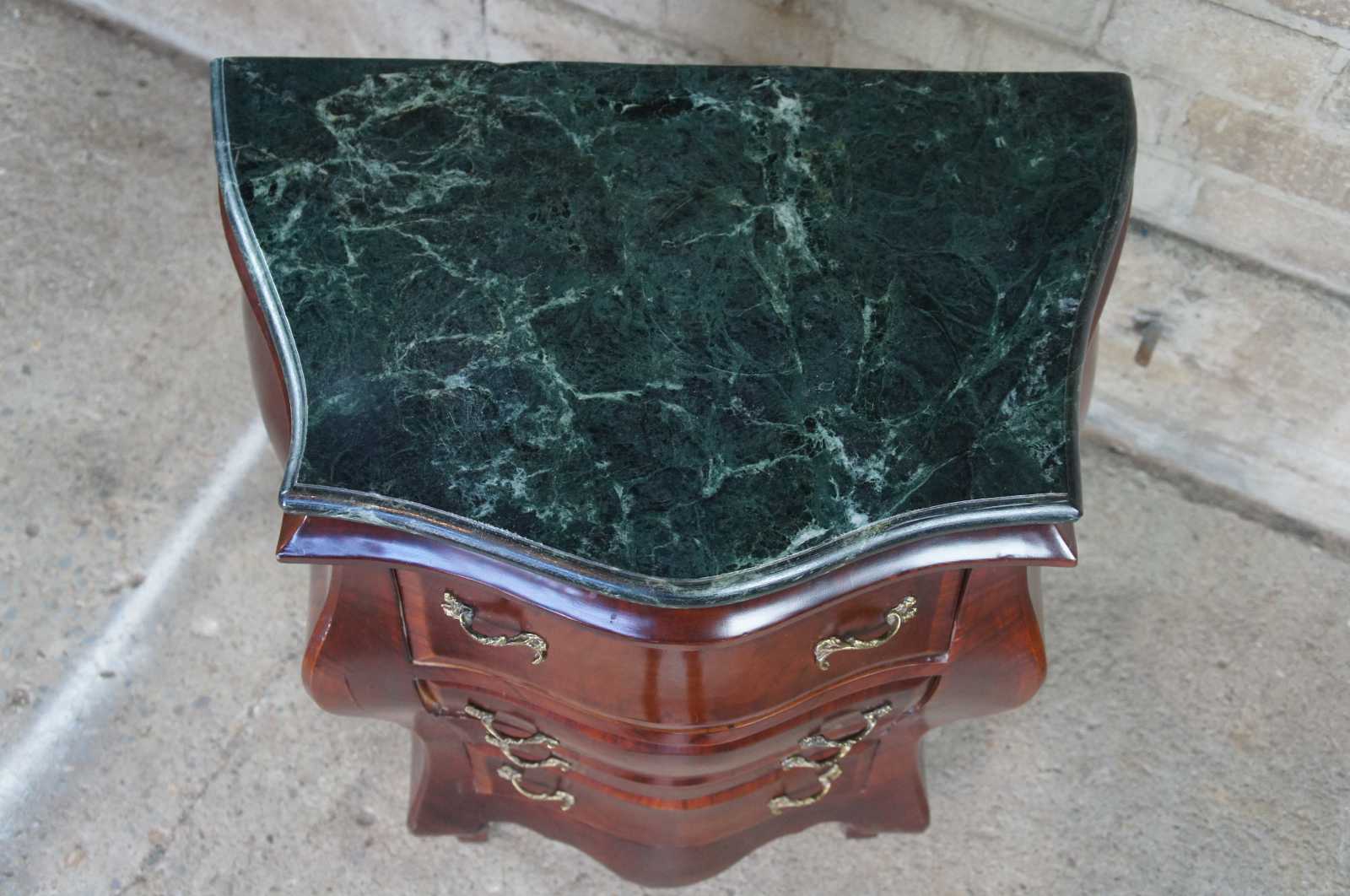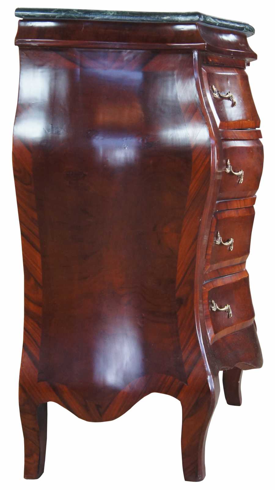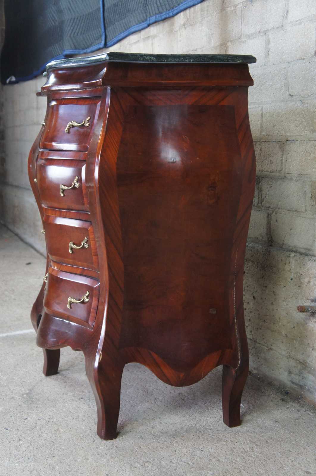Antique Italian bombe chest, commode or entry side table. Made of crotch mahogany with a green marble top and Rococo styling.