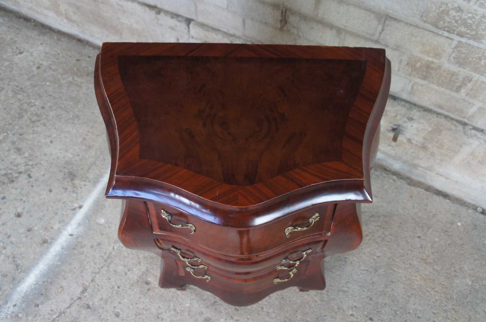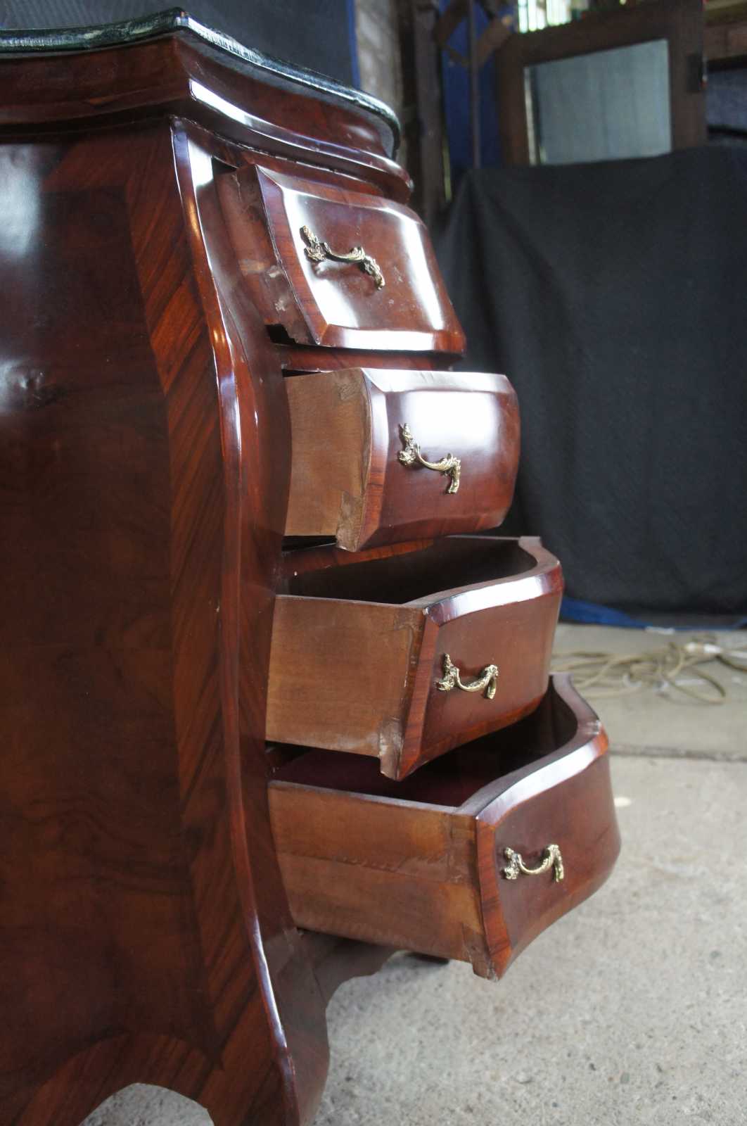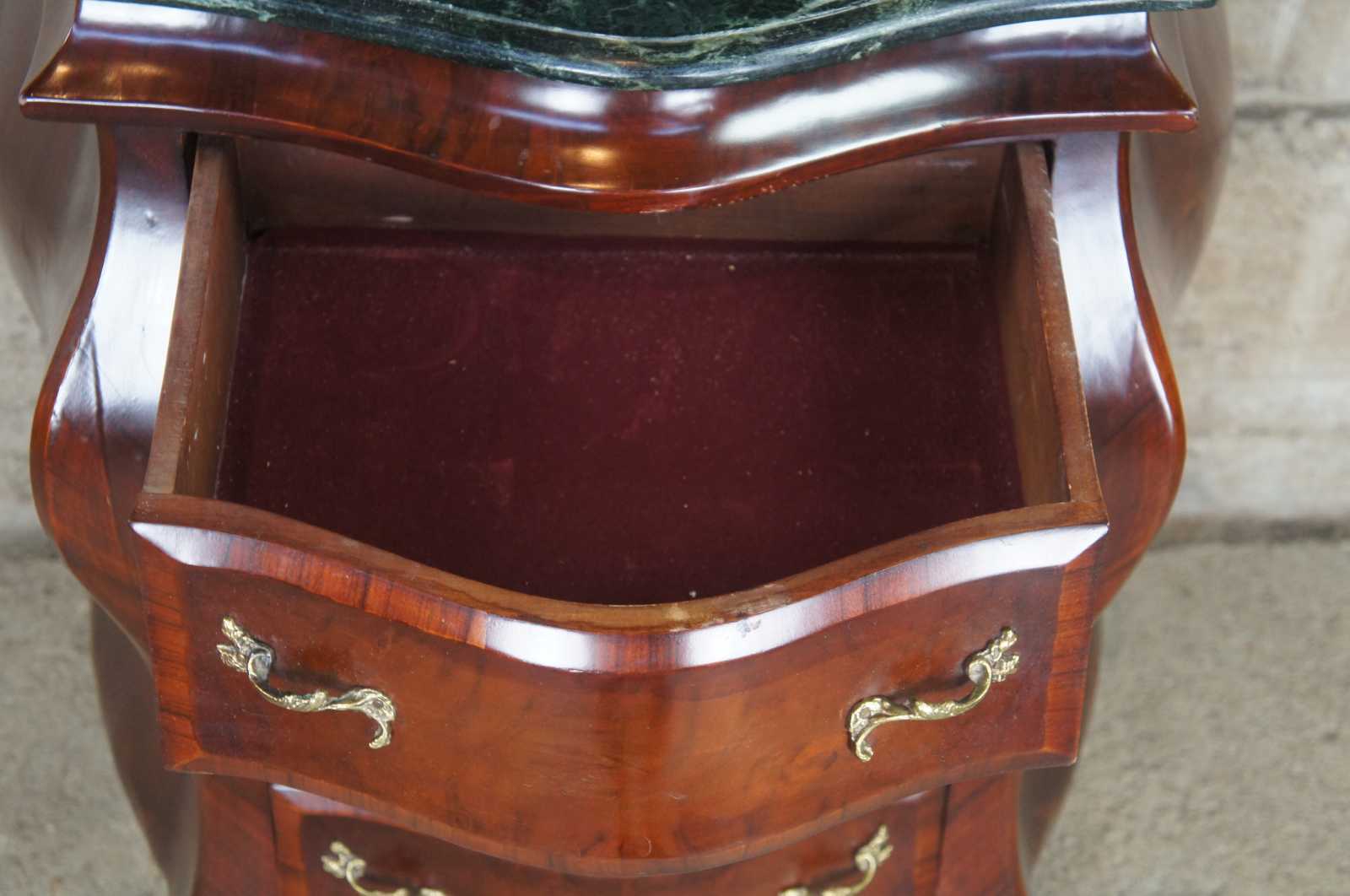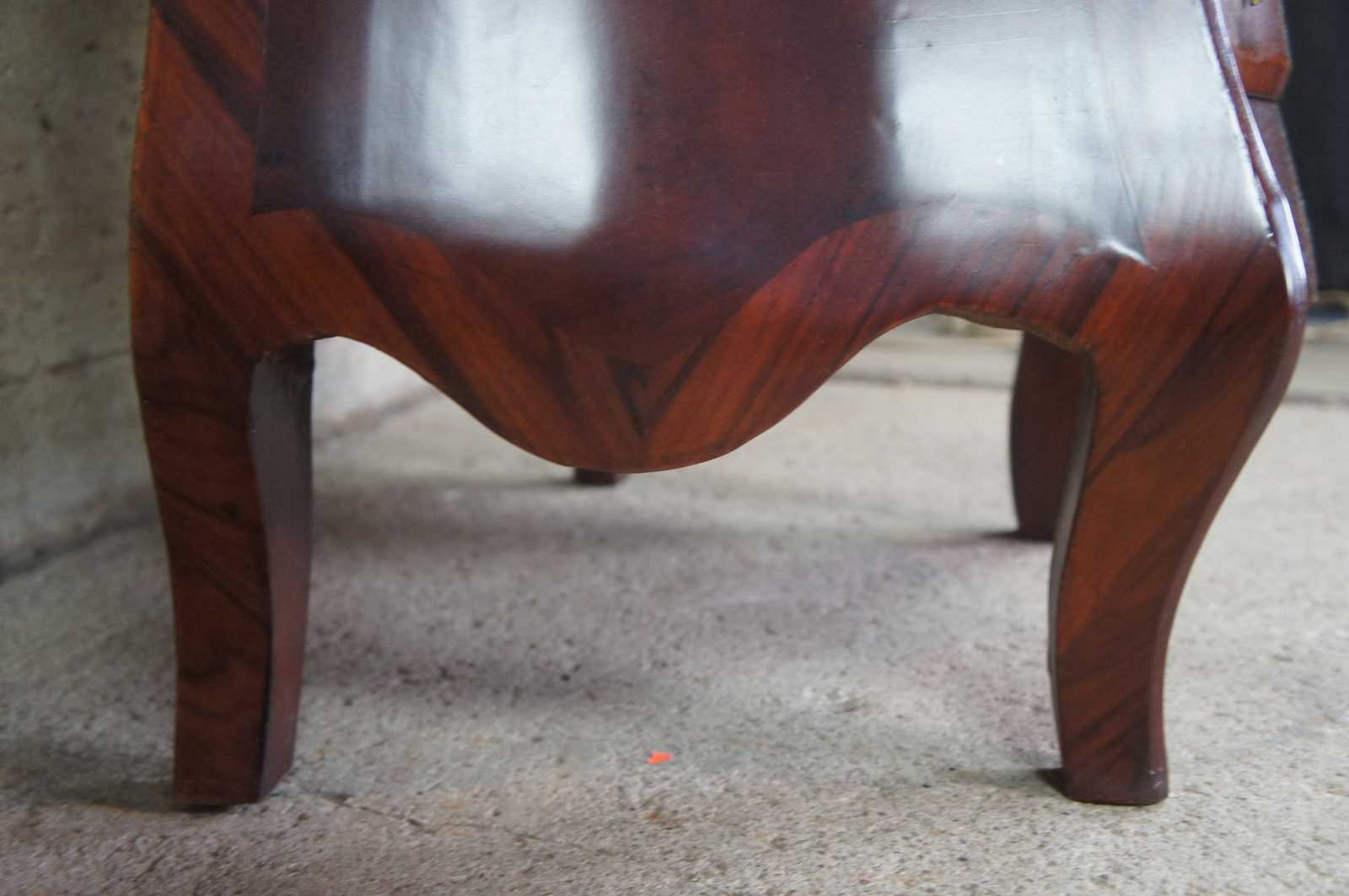 Antique Italian bombe chest, commode or entry side table. Made of crotch mahogany with a green marble top and Rococo styling.