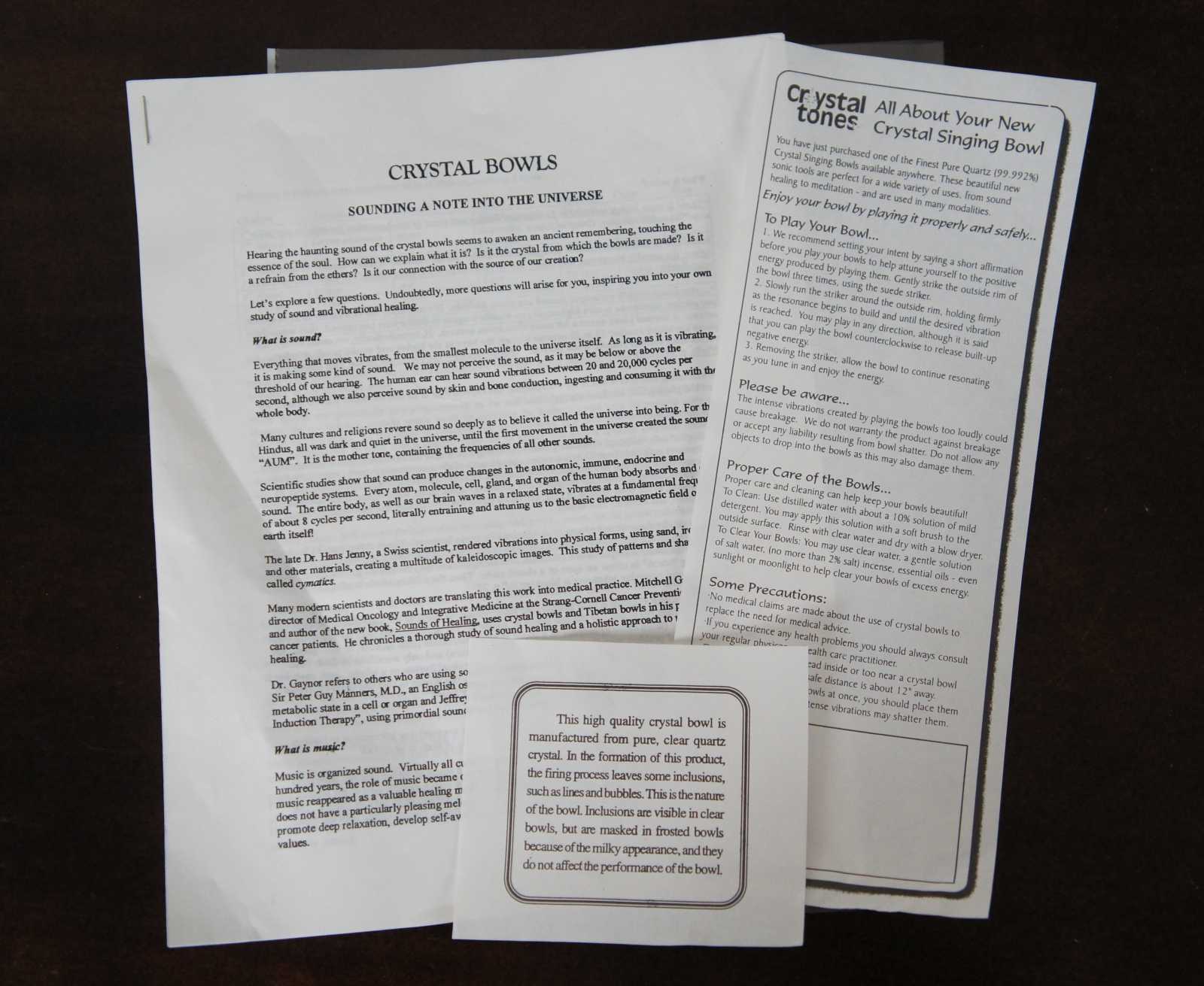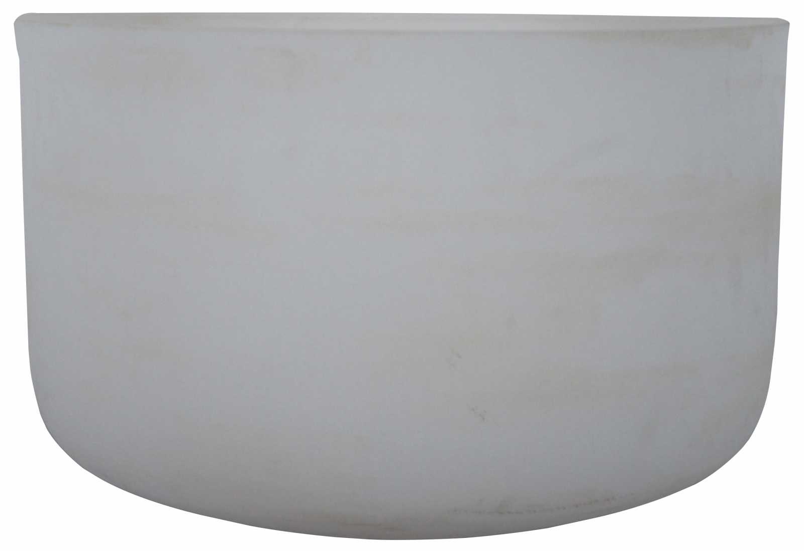 Crystal Tones frosted quartz crystal meditation singing bowl, playing the musical note F to resonate with the heart shakra; includes rubber O ring stand, suede striker and rubber mallet.