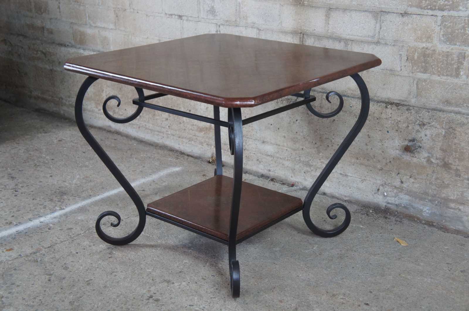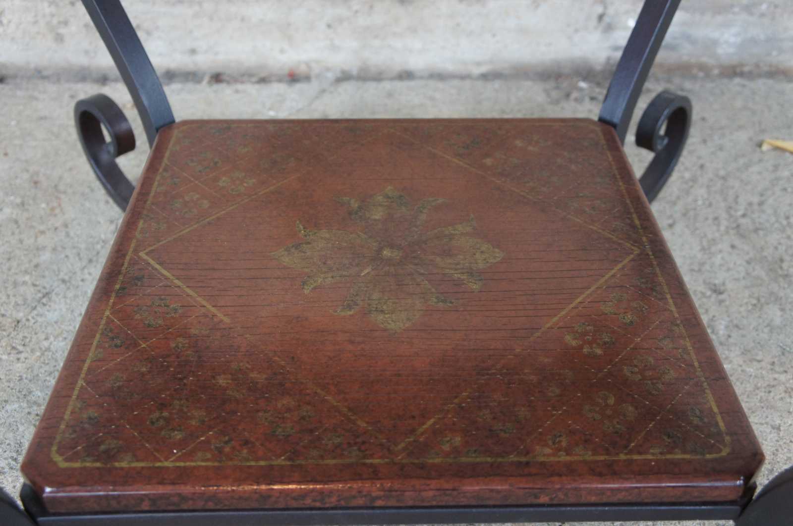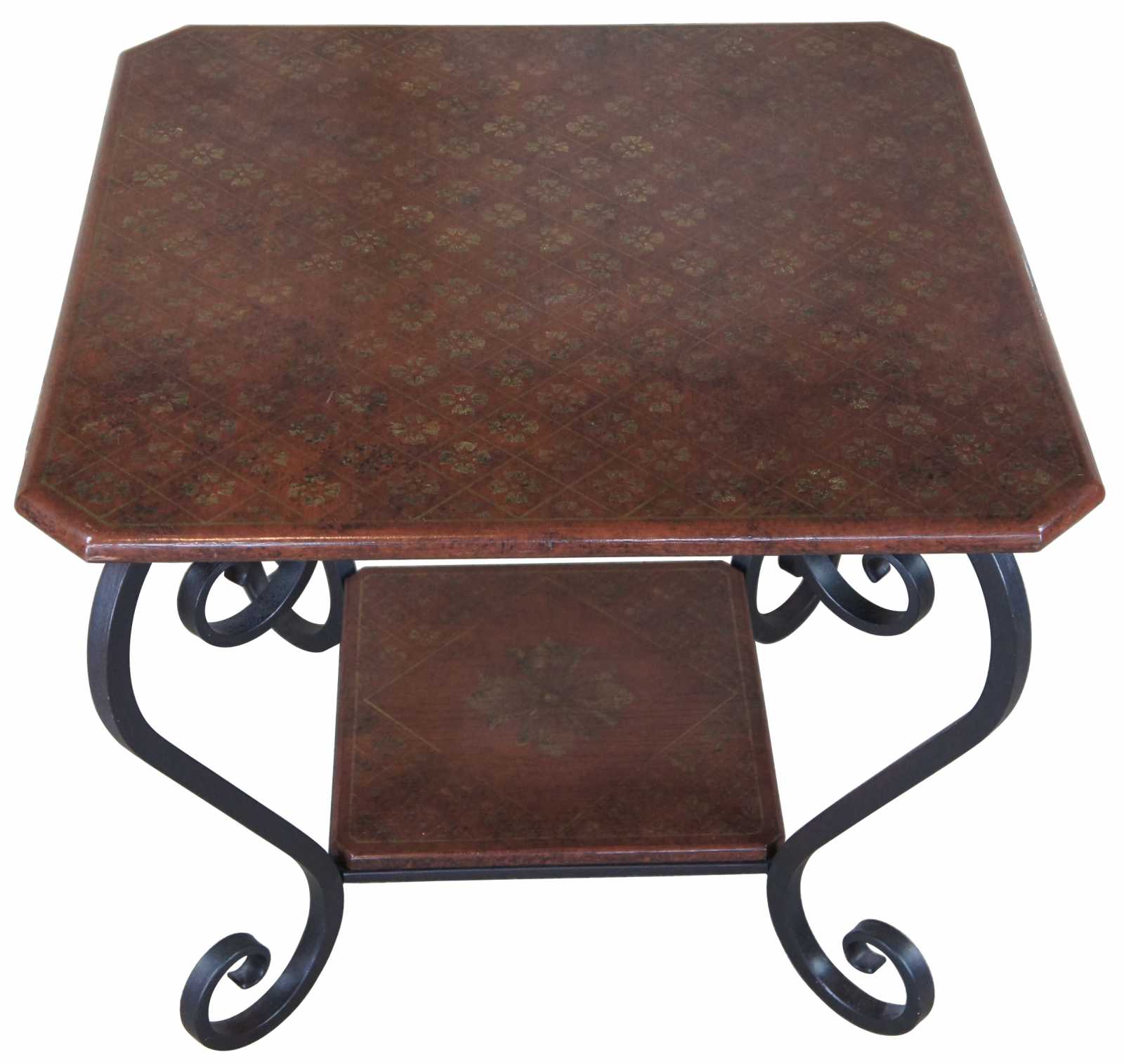 1990s Brunschwig & Fils side table. Drawing inspiration from Florentine and French styling. Made from scrolled iron with a reddish brown top featuring golden florets framed within a lattice design.