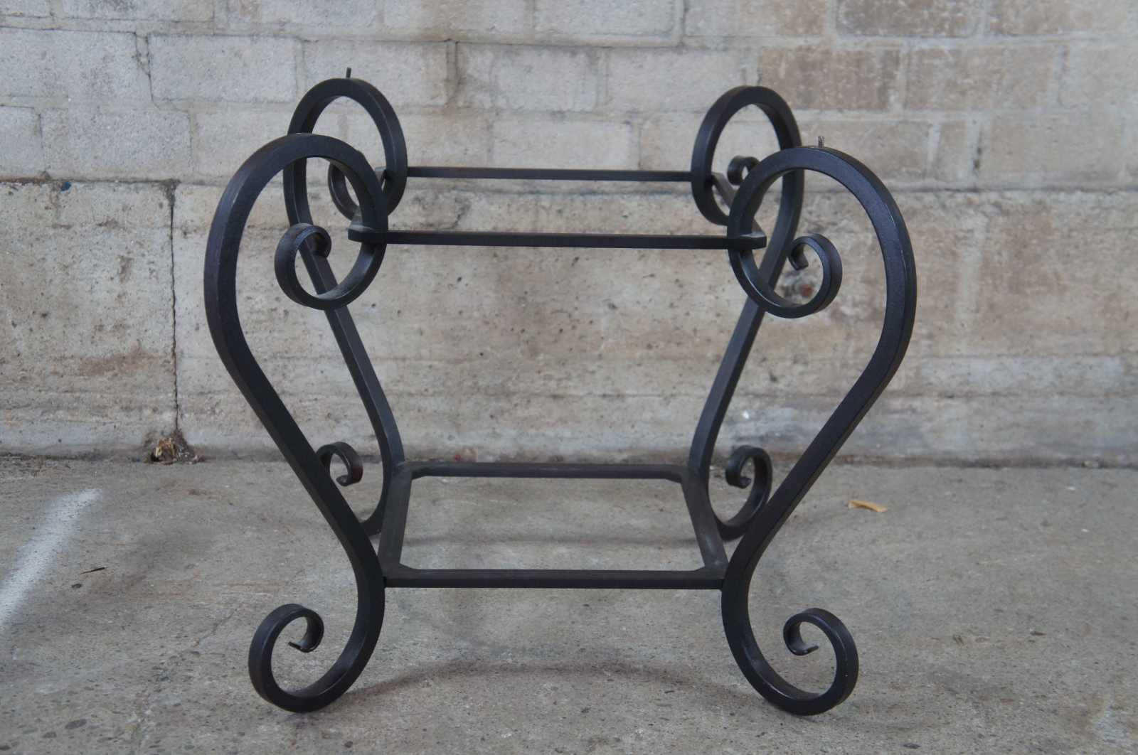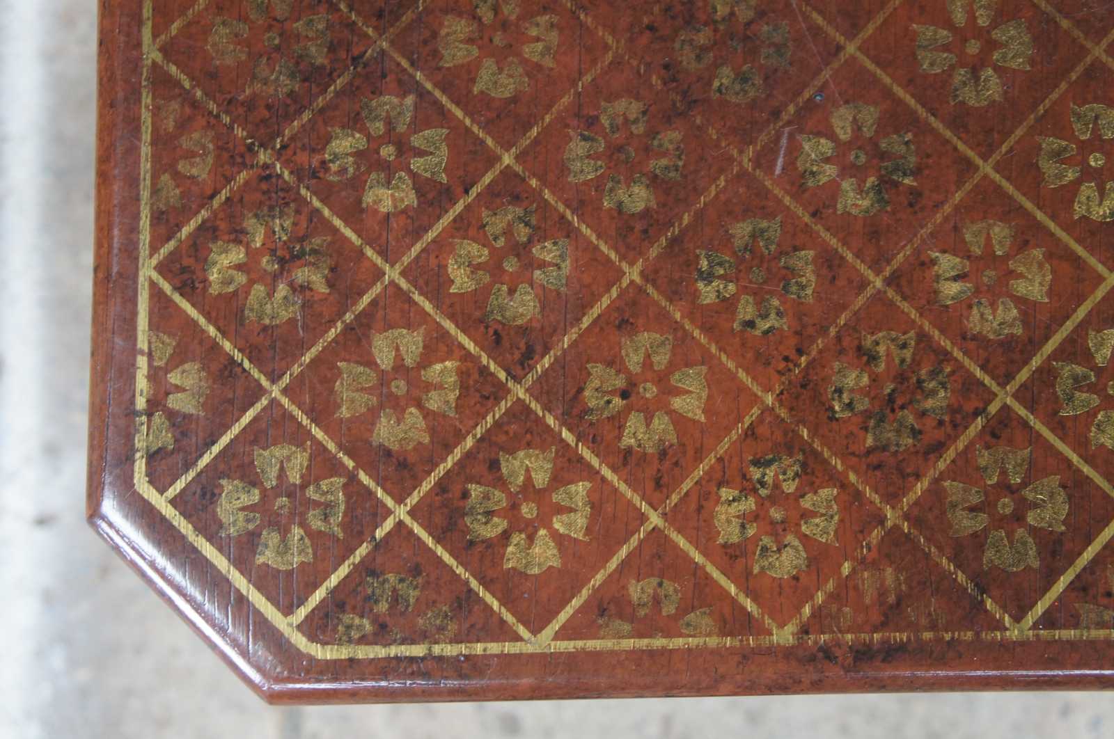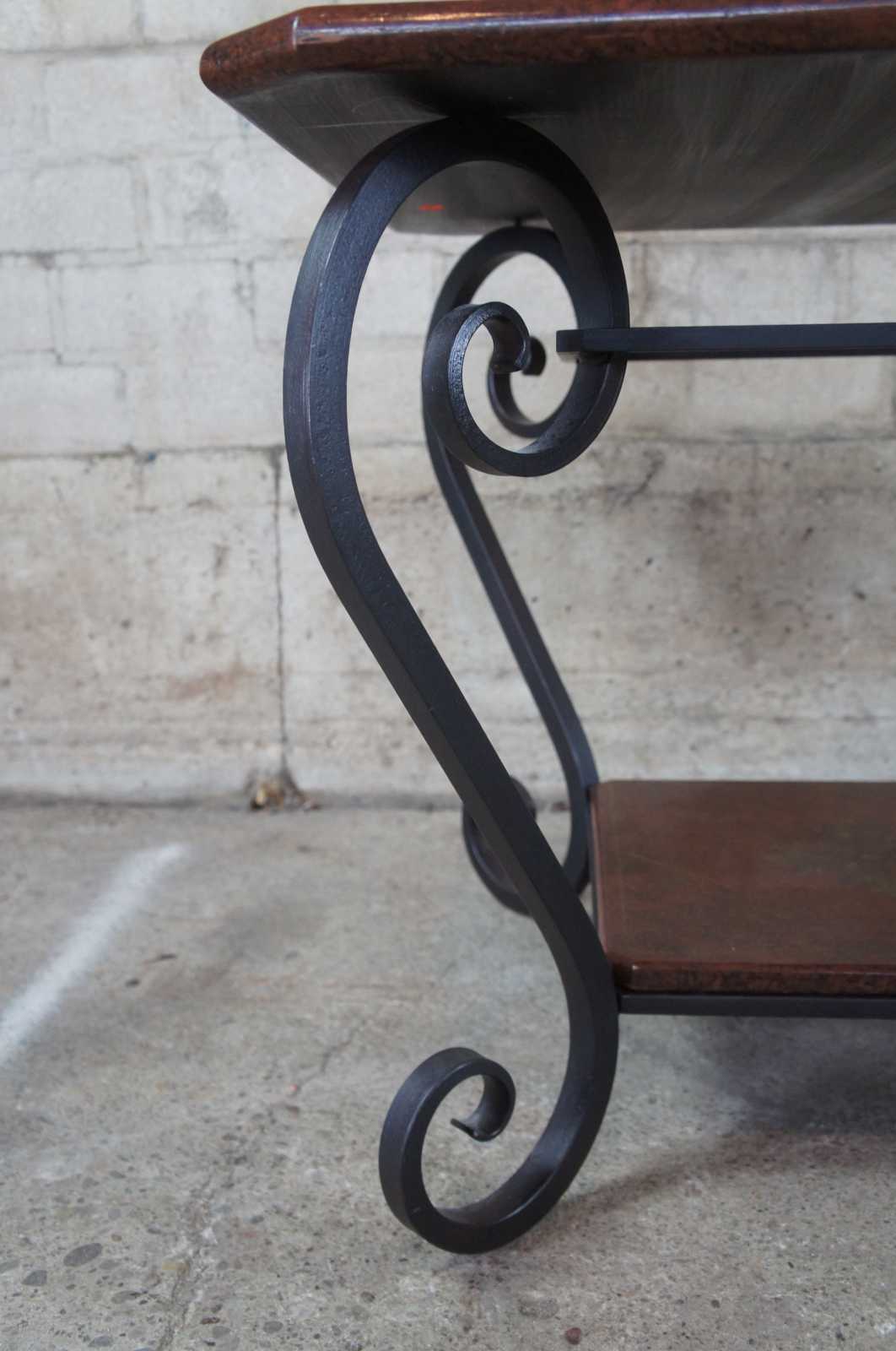 1990s Brunschwig & Fils side table. Drawing inspiration from Florentine and French styling. Made from scrolled iron with a reddish brown top featuring golden florets framed within a lattice design.