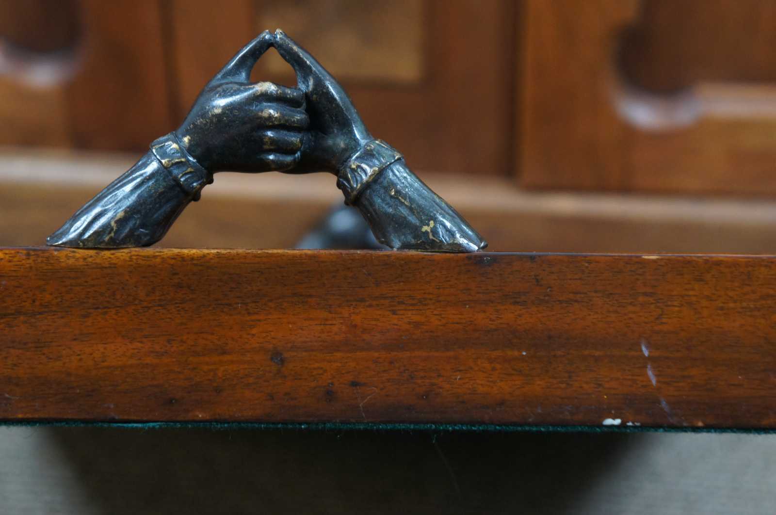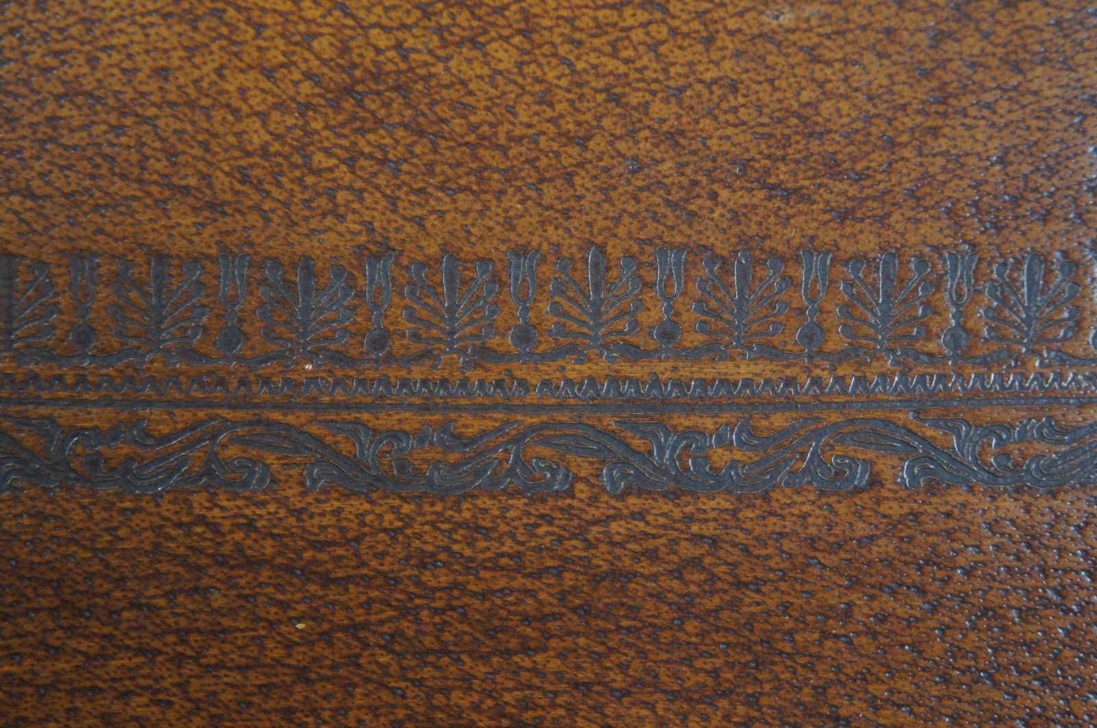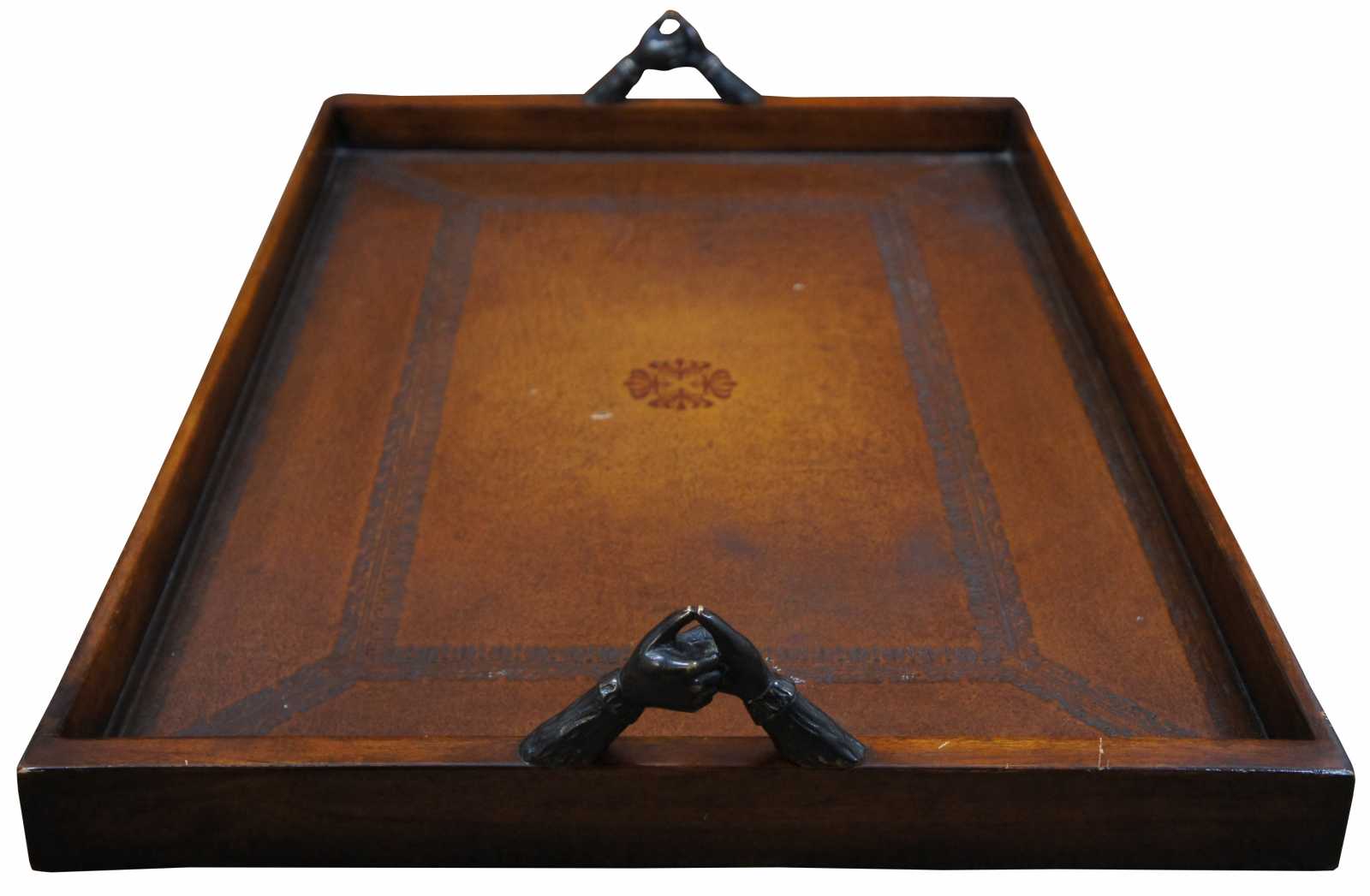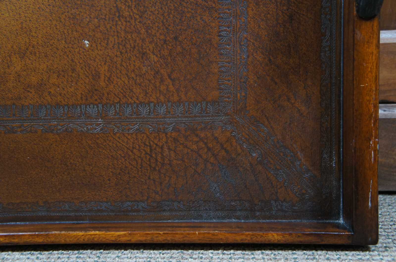 Theodore Alexander Victorian Library Tray made of wood with rectangular form and gallery with a tooled leather surface and bronze clasping handles. 1100-842BD