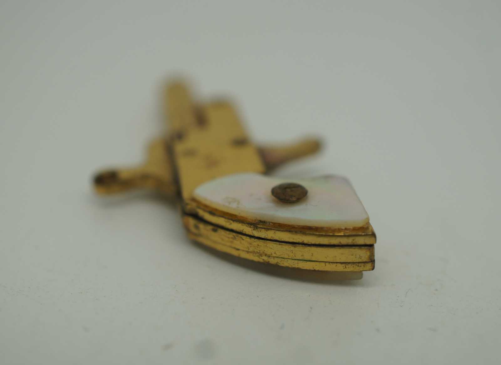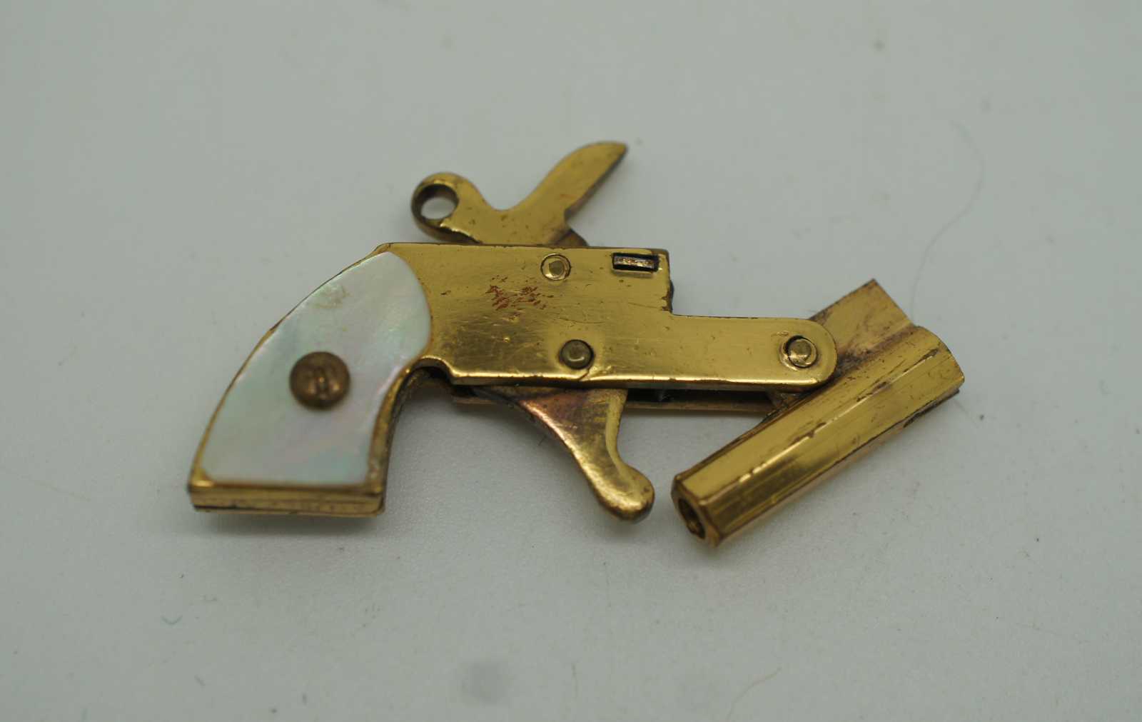 Vintage gold tone miniature pin fire cap gun with mother of pearl on the handle, made in Japan with small ring on top of the barrel for use as a key chain or watch fob.