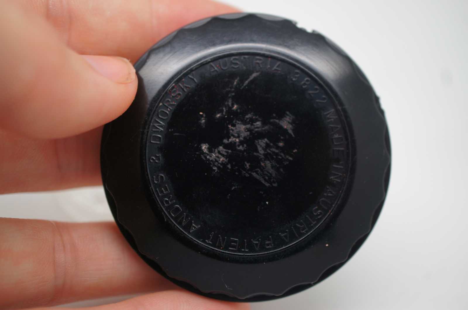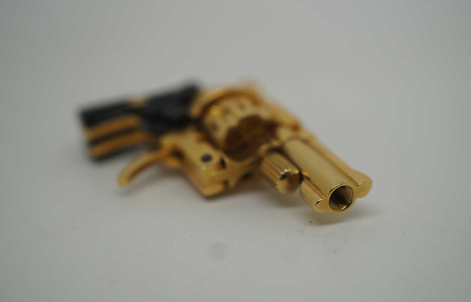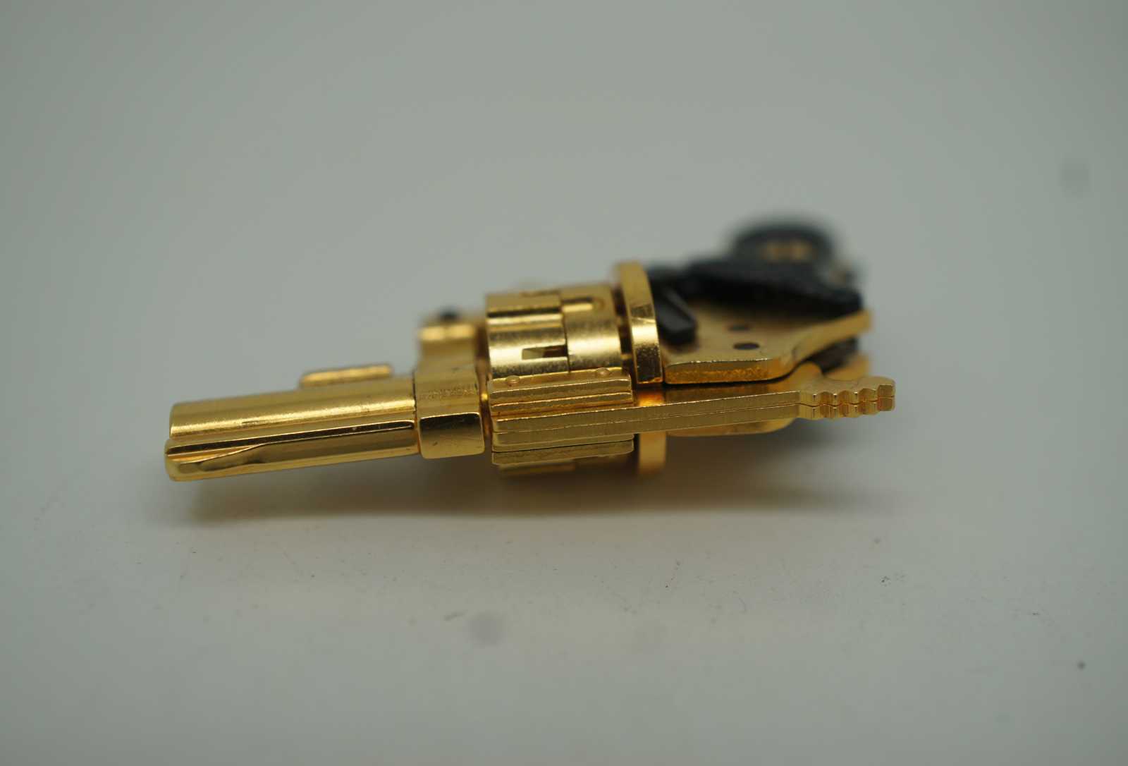 Vintage miniature Xythos Automatic six shot revolver in gold toned metal with black grip; produced by Autrian watch makers Andres & Dworsky. Includes original plastic case.