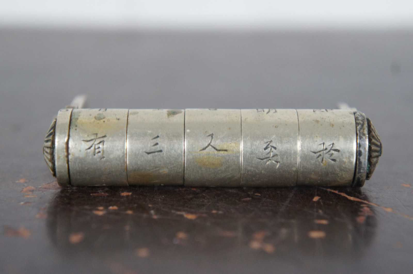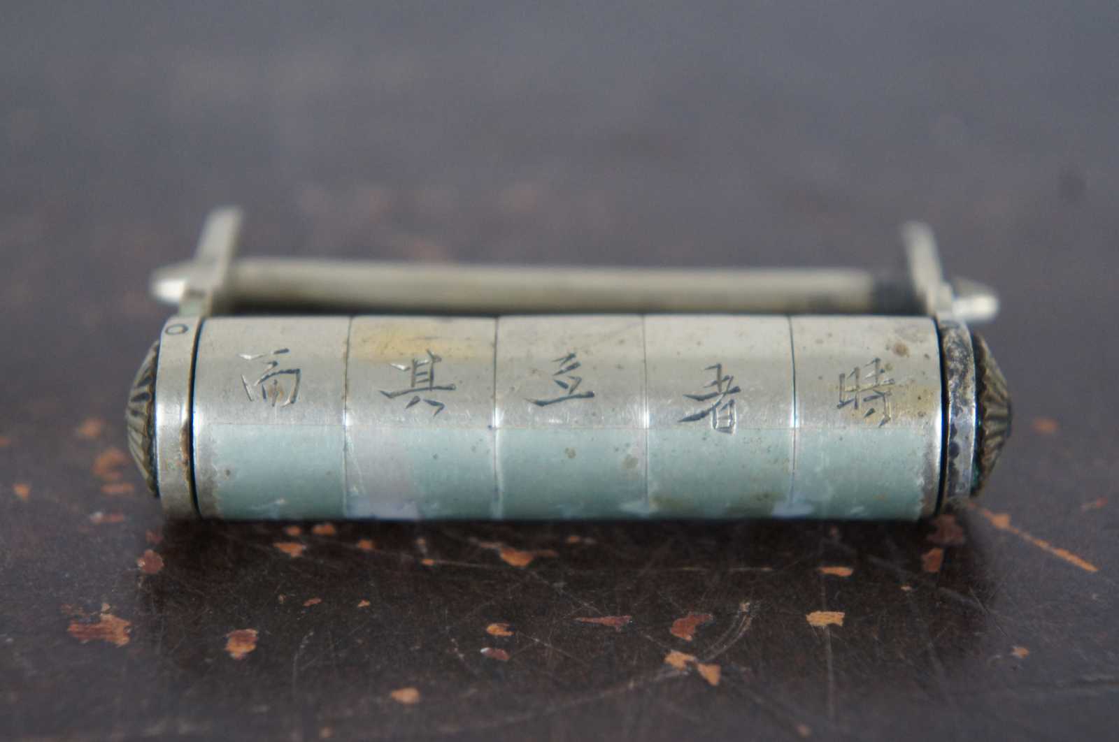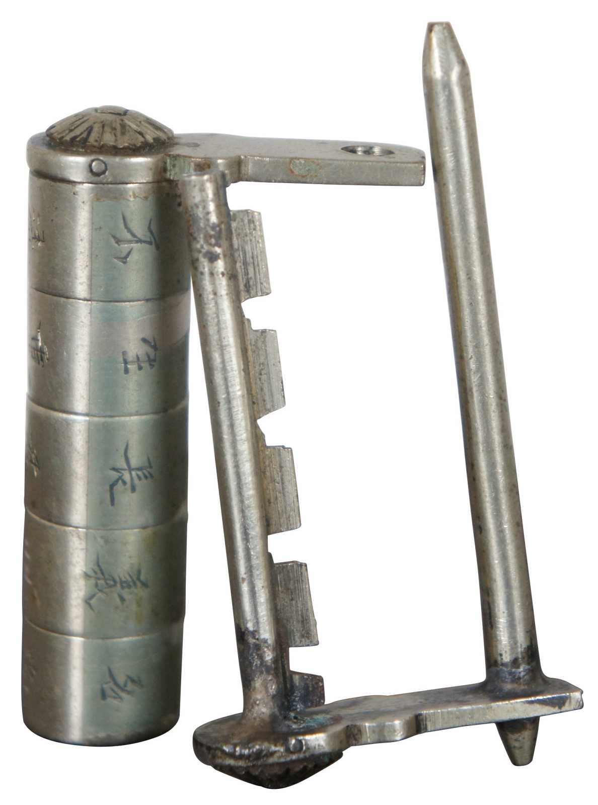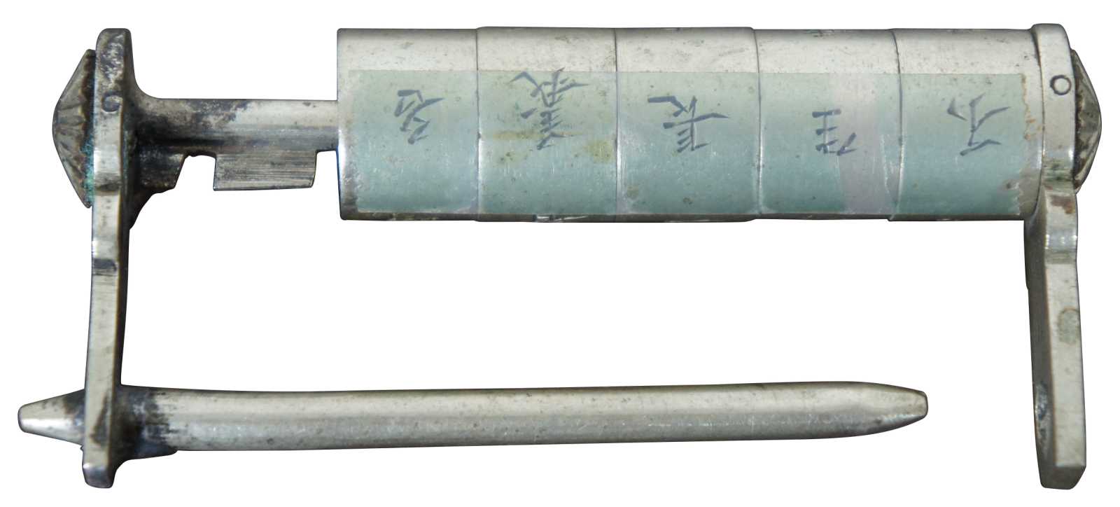 Antique metal cylinder poem padlock engraved with Chinese characters; currently taped in place at the solution/combination.