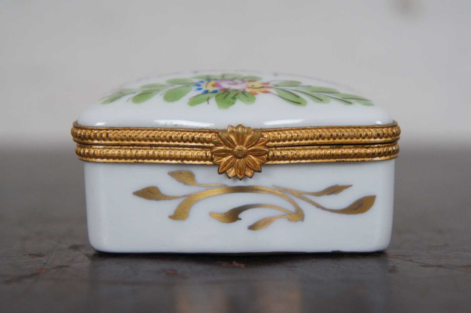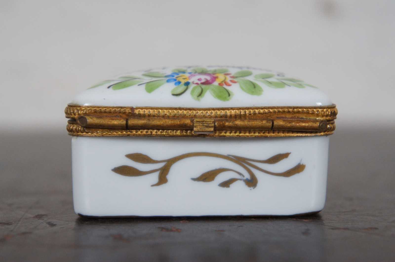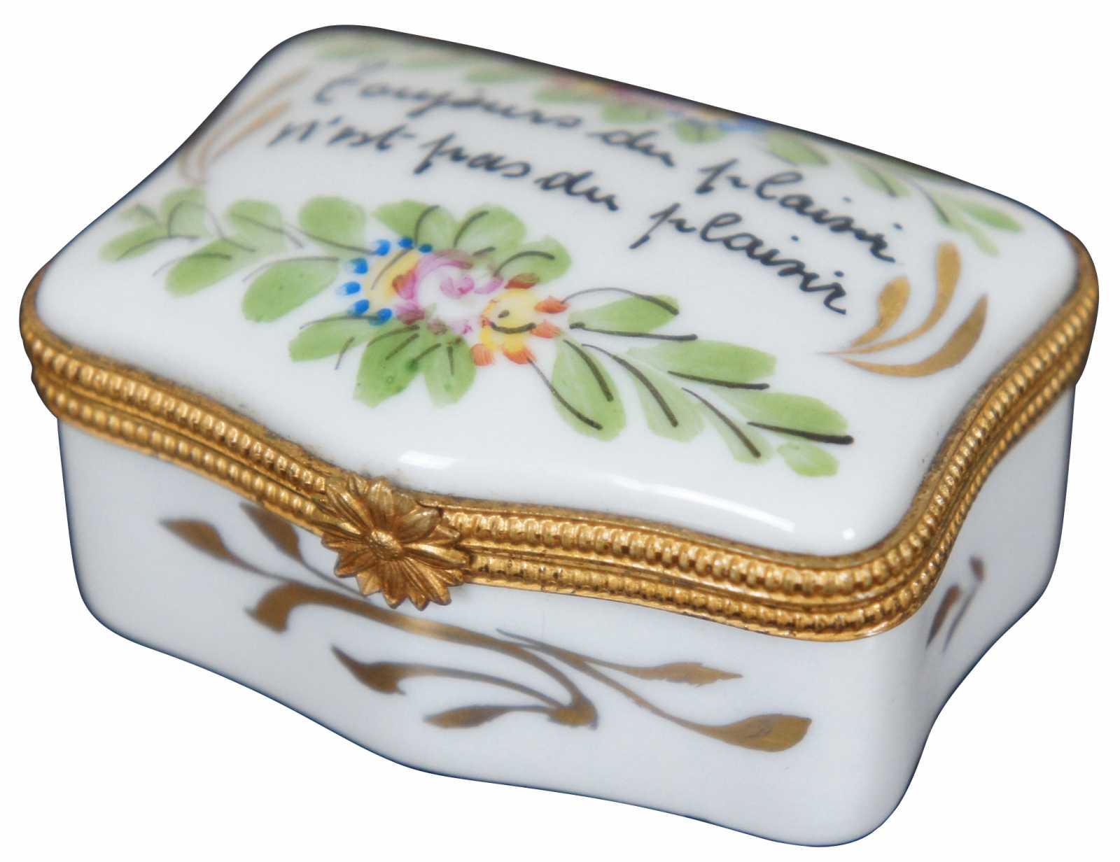 Vintage Limoges porcelain trinket or pill box hand painted with an array of flowers and the phrase “Toujour du Plaisir N’est-pas du Plaisir” (French for “Pleasure Always Isn’t Pleasure”).