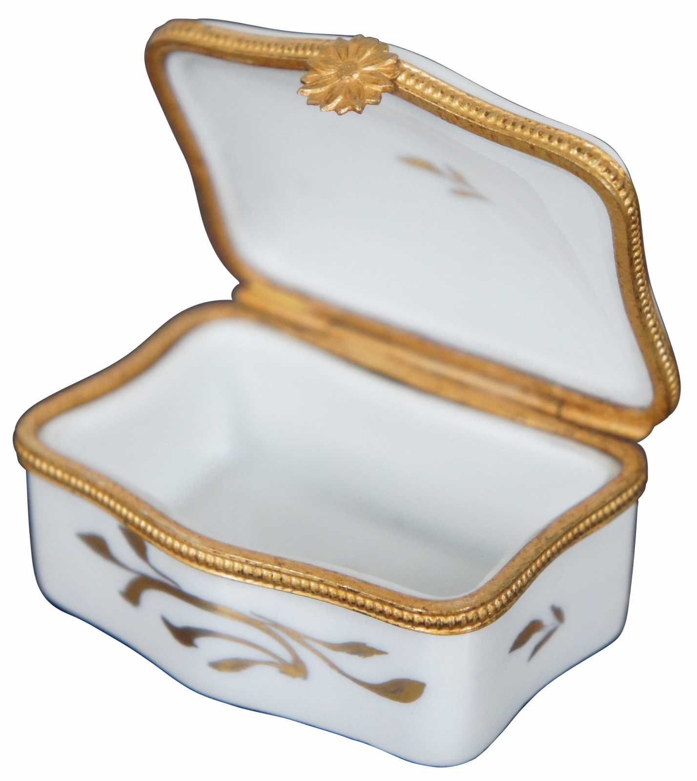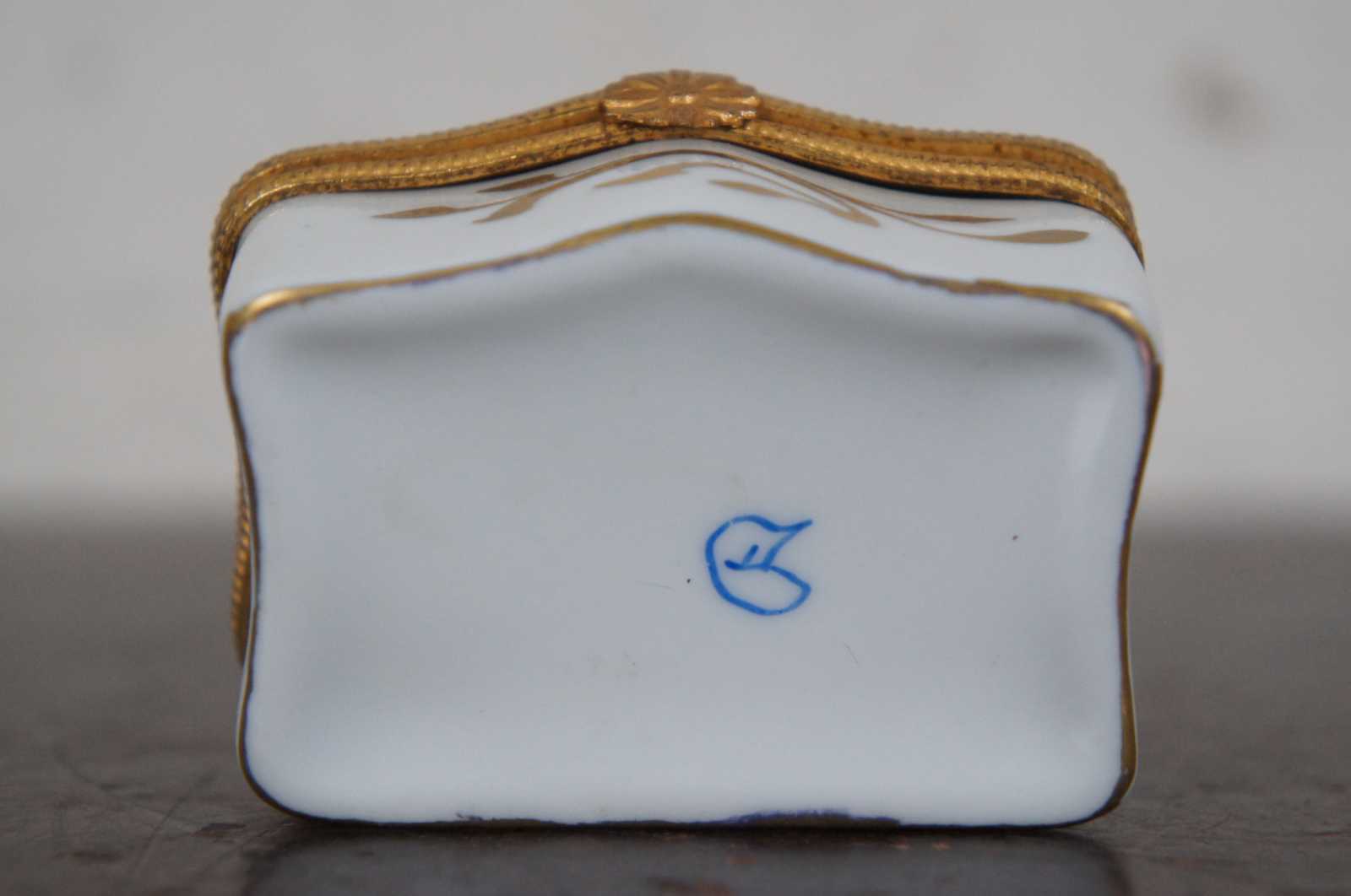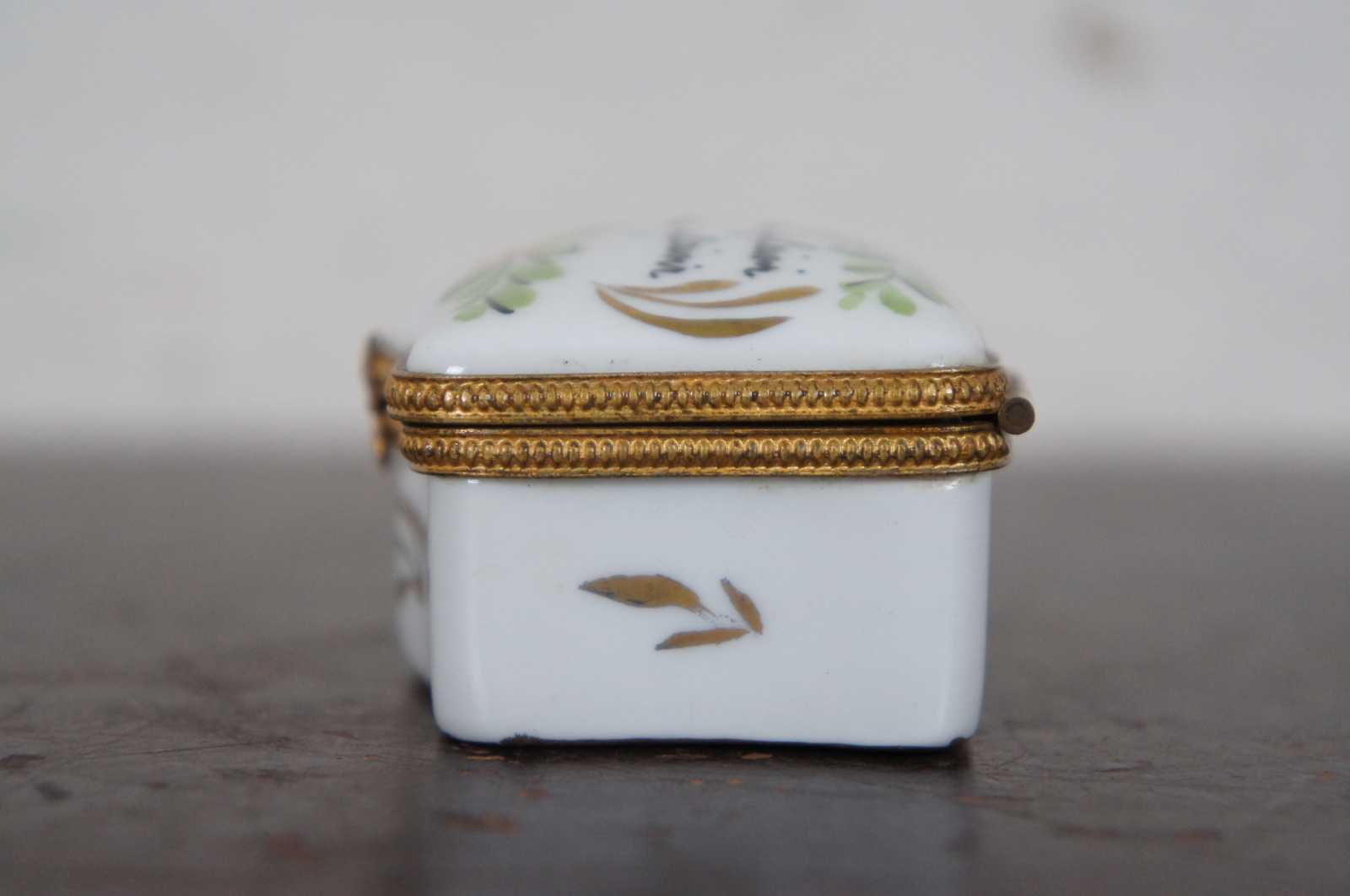 Vintage Limoges porcelain trinket or pill box hand painted with an array of flowers and the phrase “Toujour du Plaisir N’est-pas du Plaisir” (French for “Pleasure Always Isn’t Pleasure”).