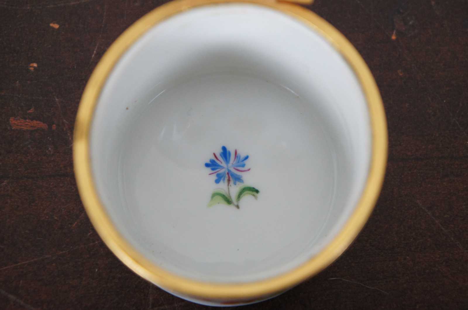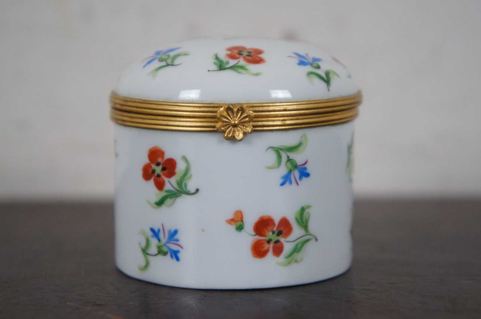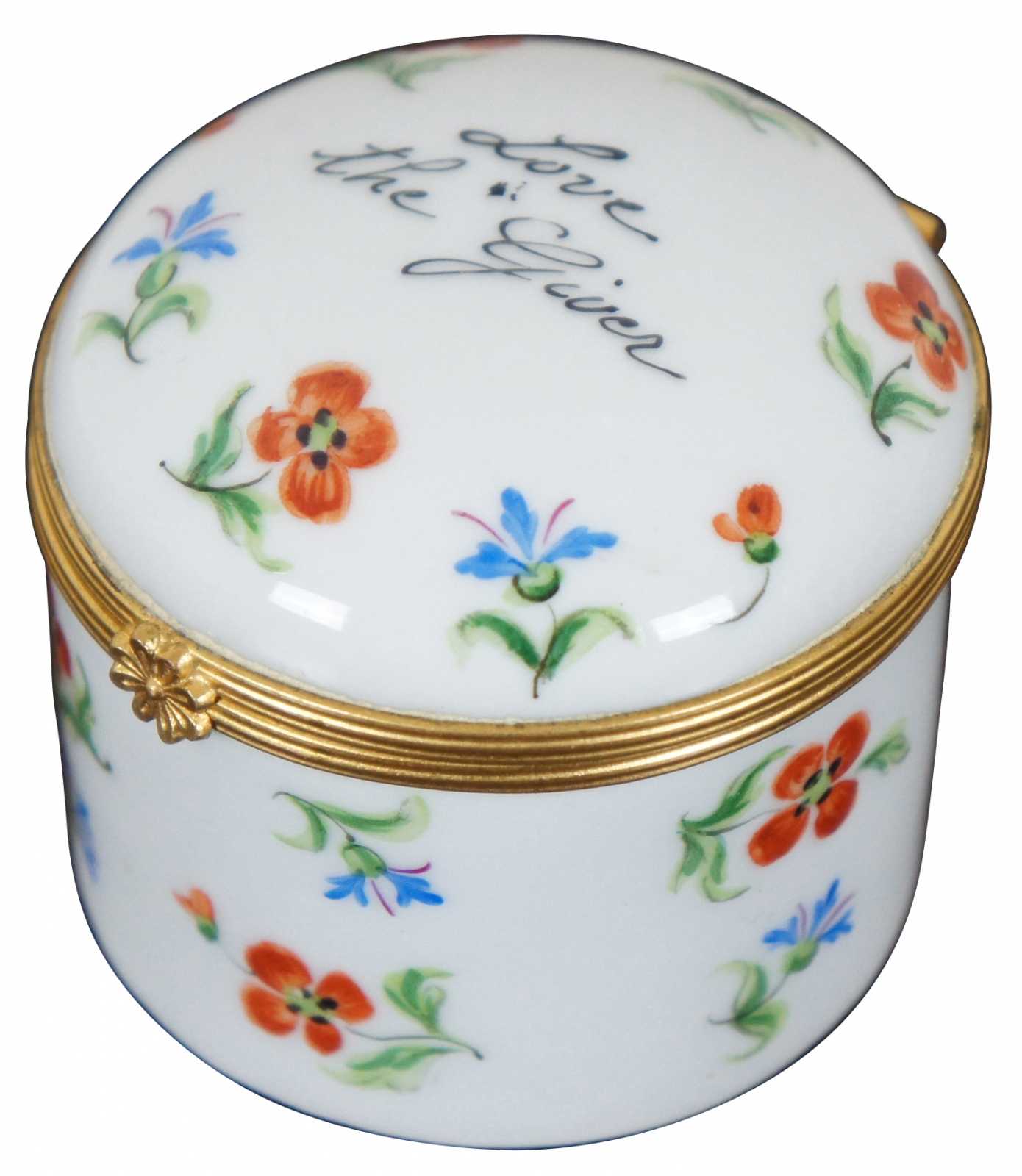 Vintage Tiffany & Company Private Stock hand painted round Limoges trinket or pill box, numbered 306; white porcelain with red-orange poppies, bluebells, and the phrase “Love the Giver.”