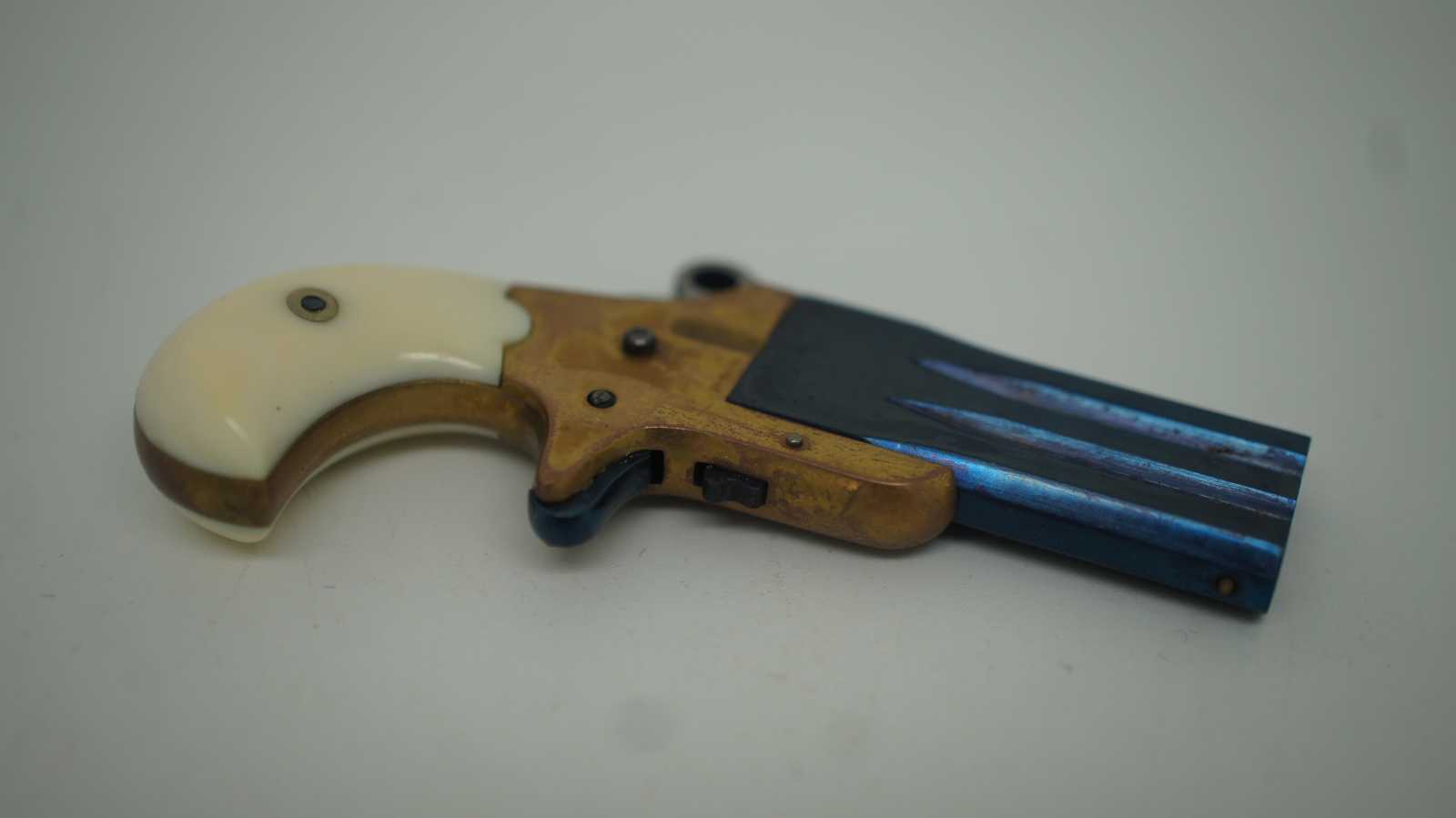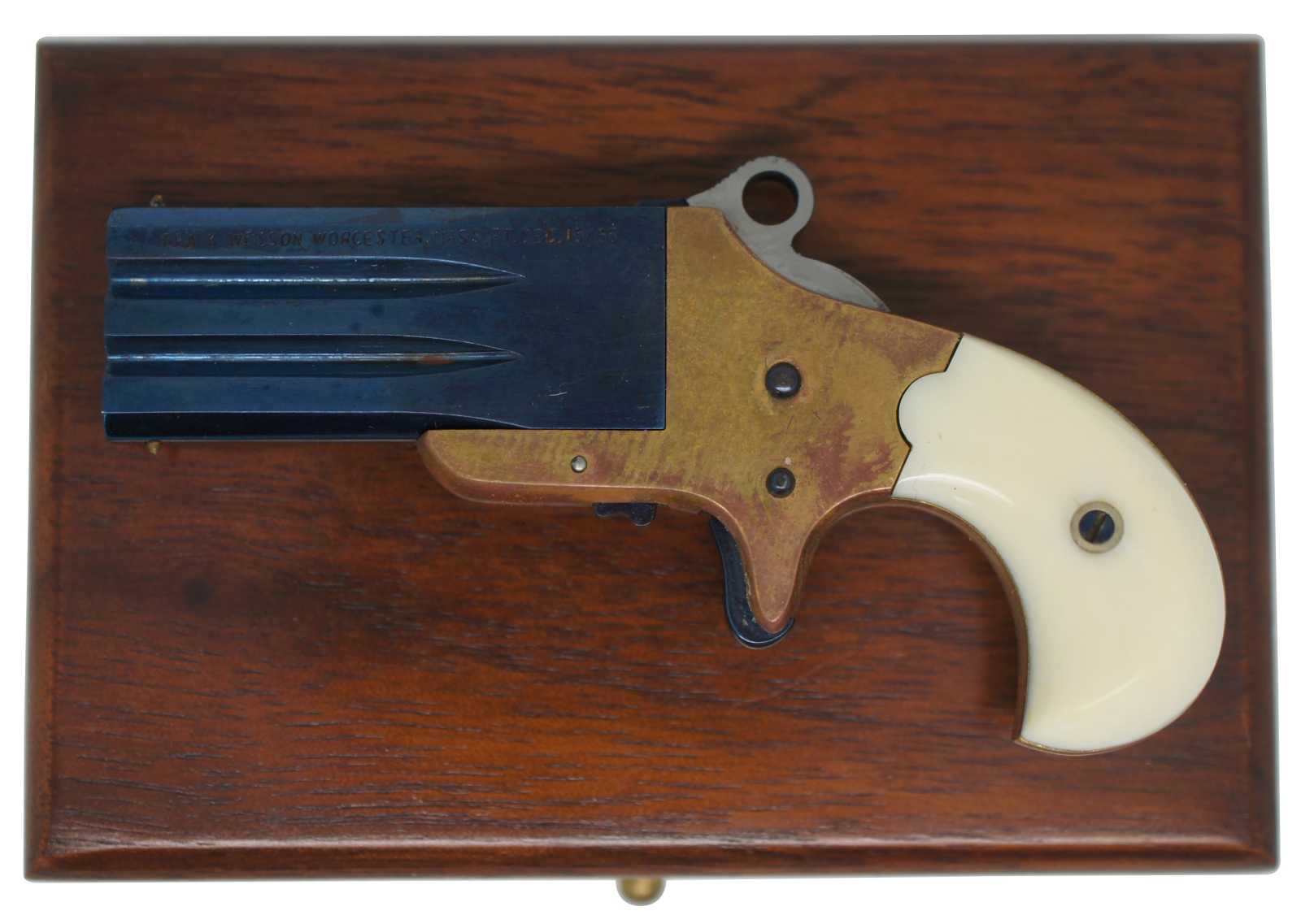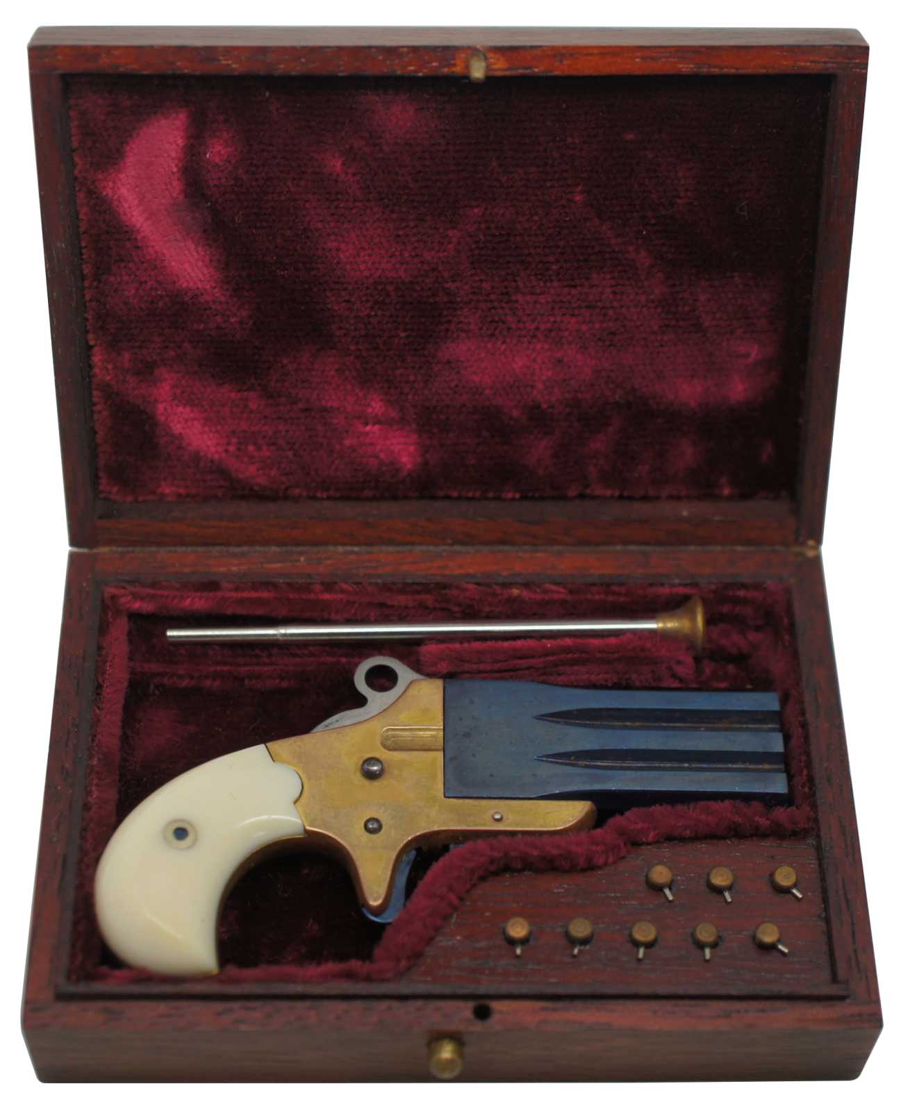 Vintage L.H. Smith miniature Frank Wesson swivel barrel two shot derringer pin fire cap gun and velvet lined walnut case marked “L.H. Smith 5.” Includes full set of blank cartridges and ram rod.