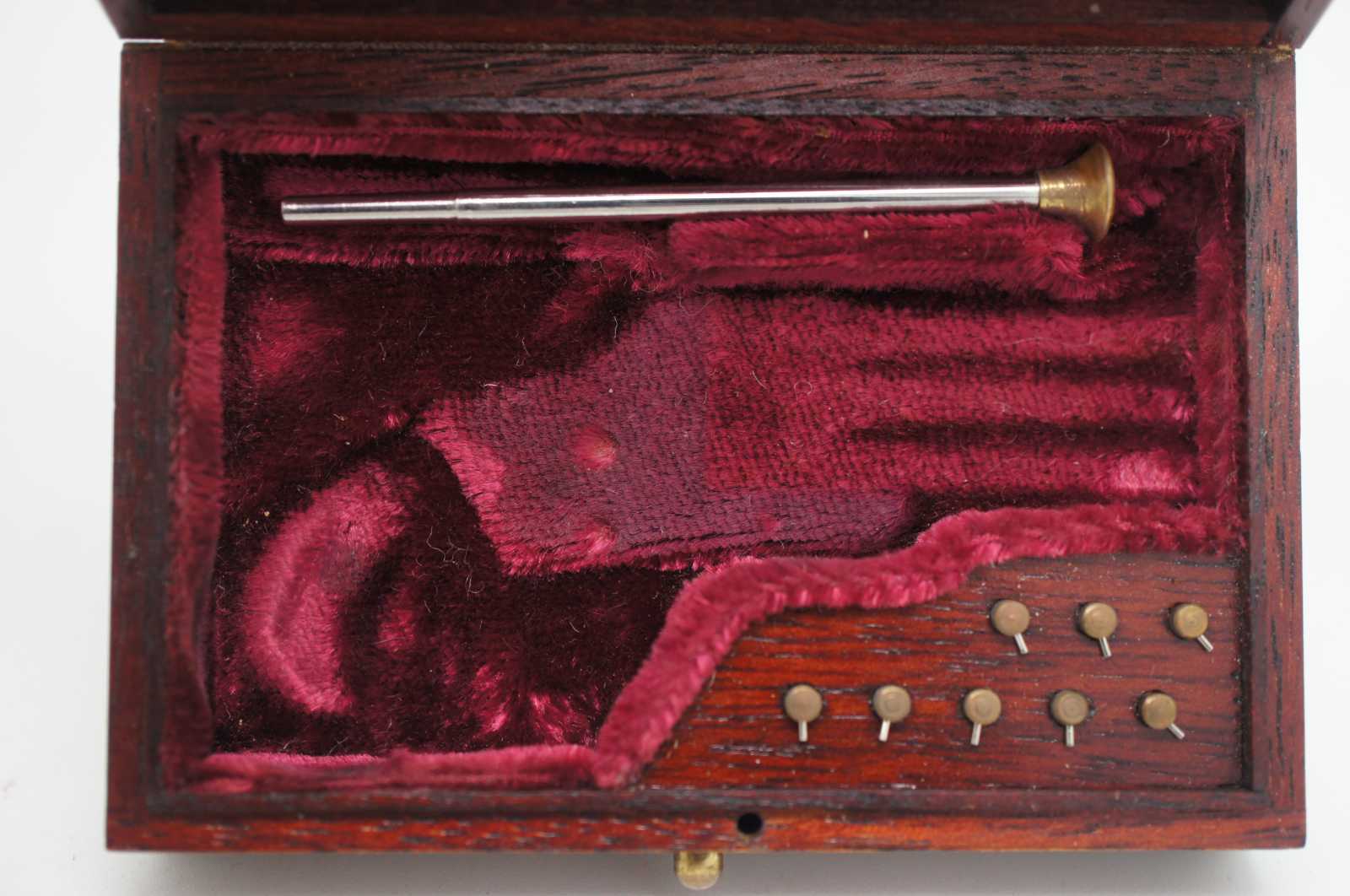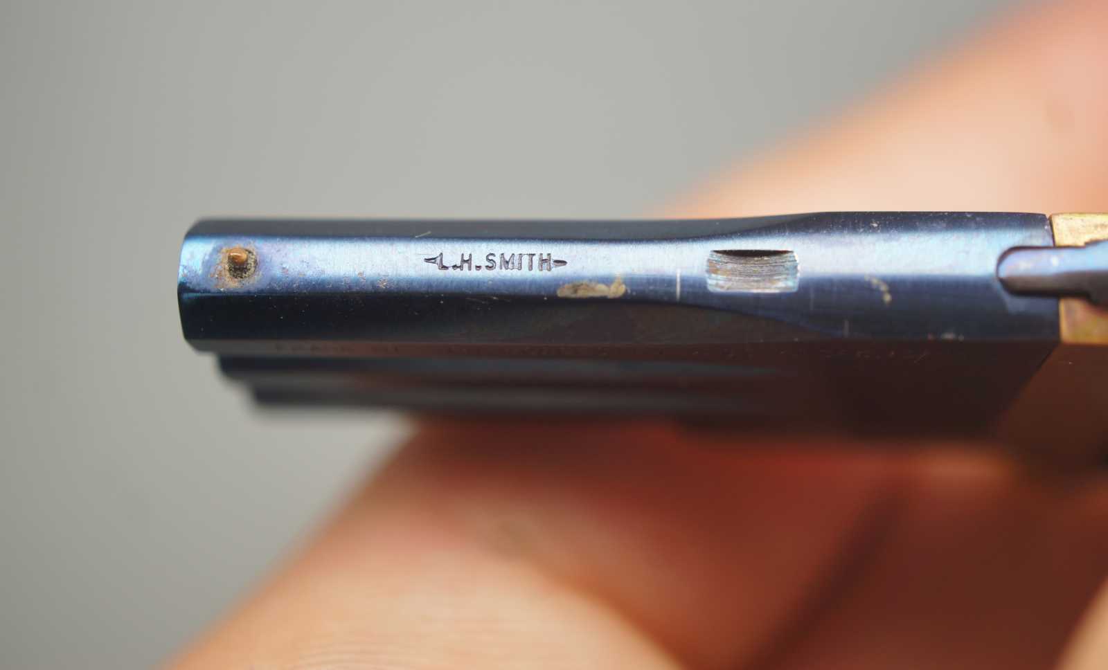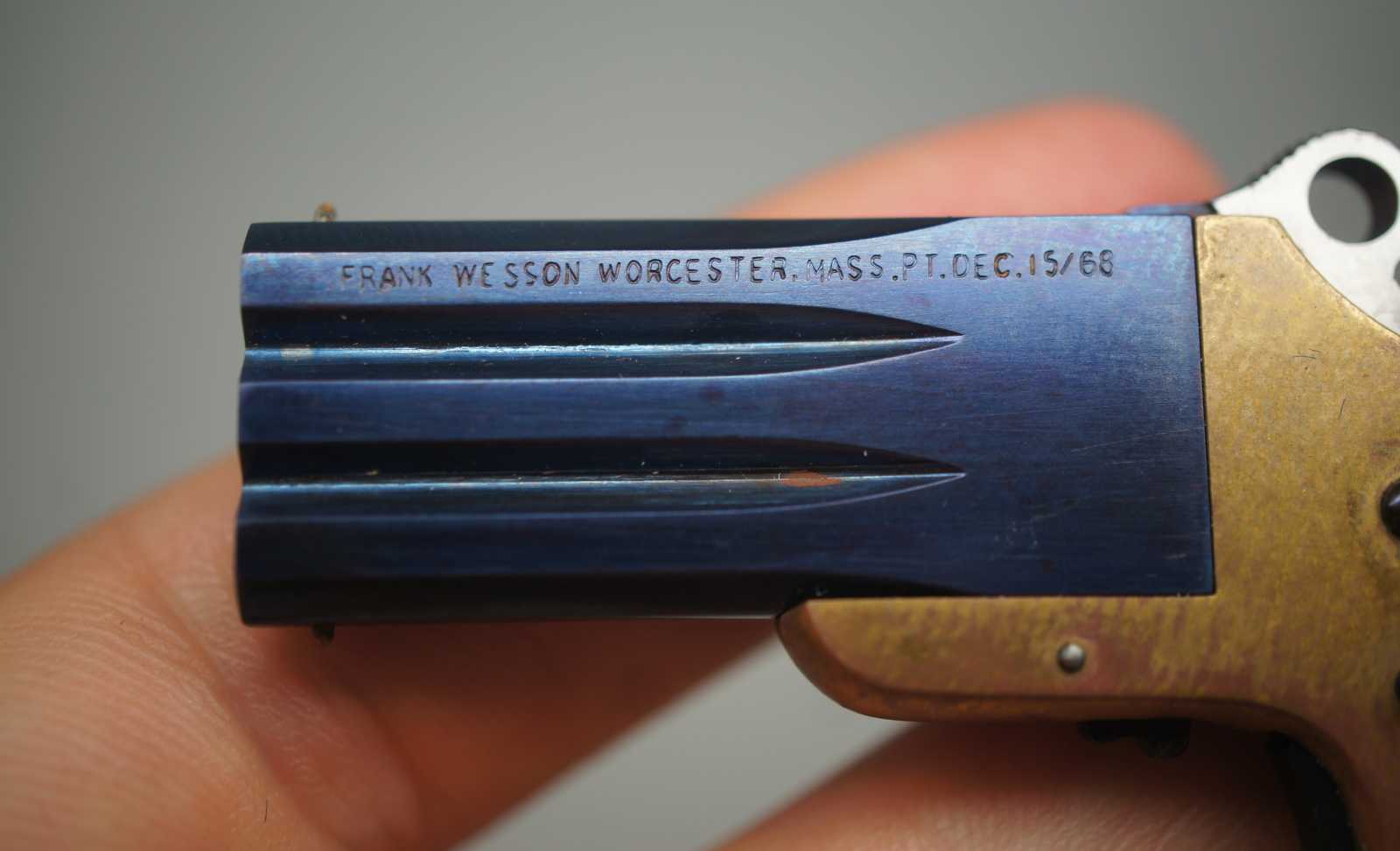 Vintage L.H. Smith miniature Frank Wesson swivel barrel two shot derringer pin fire cap gun and velvet lined walnut case marked “L.H. Smith 5.” Includes full set of blank cartridges and ram rod.