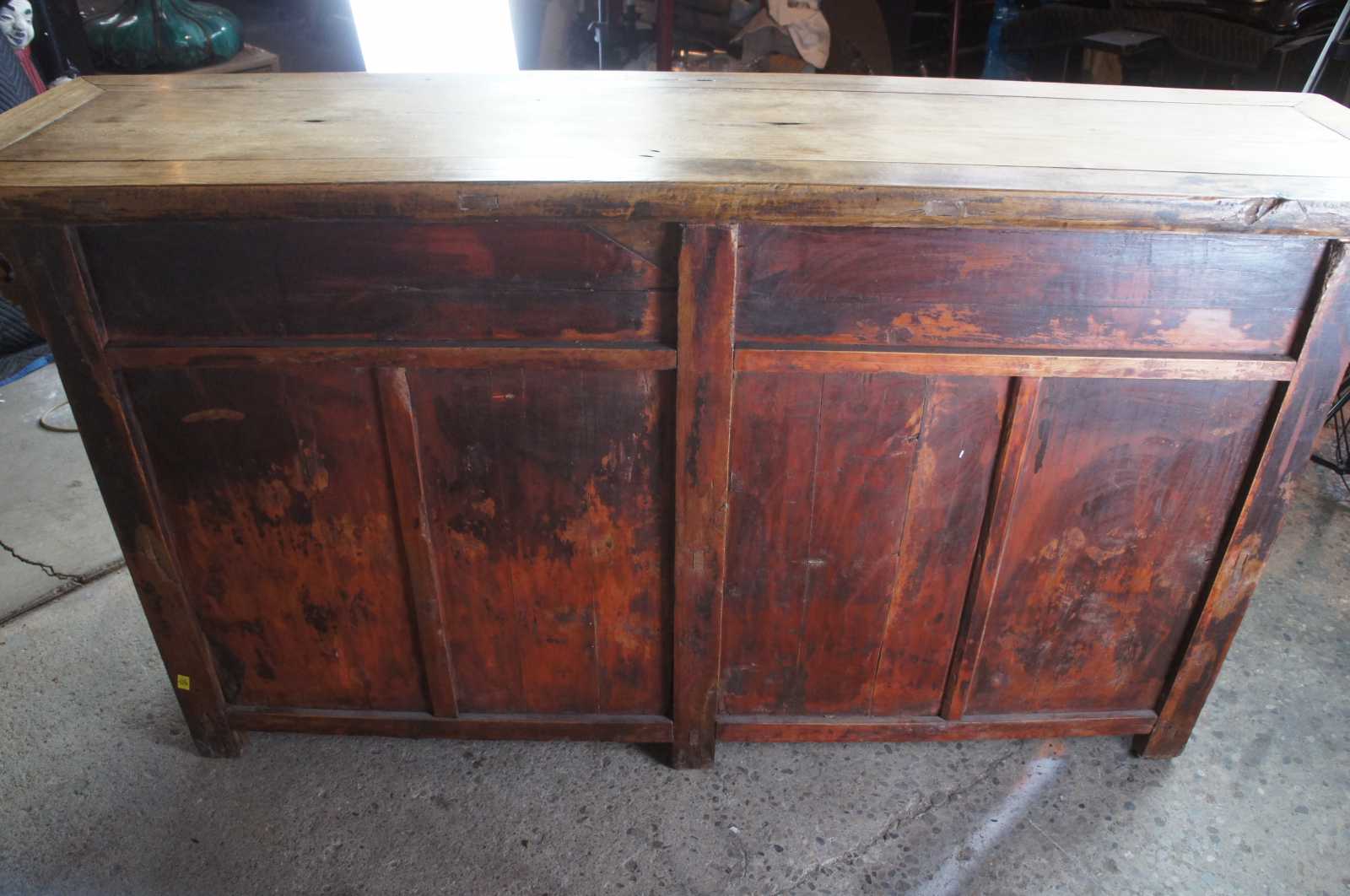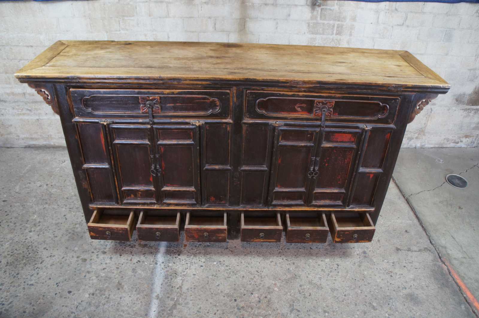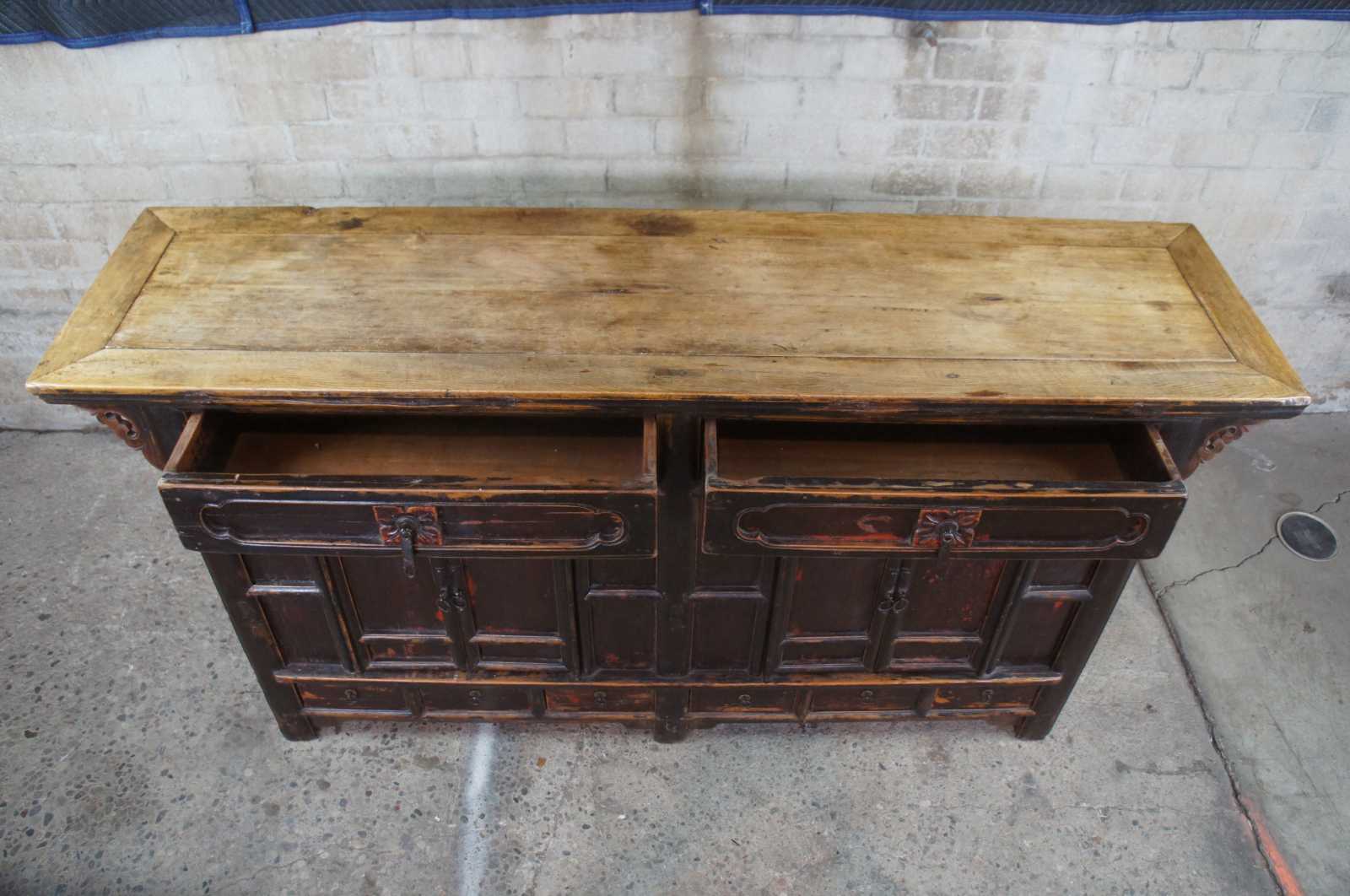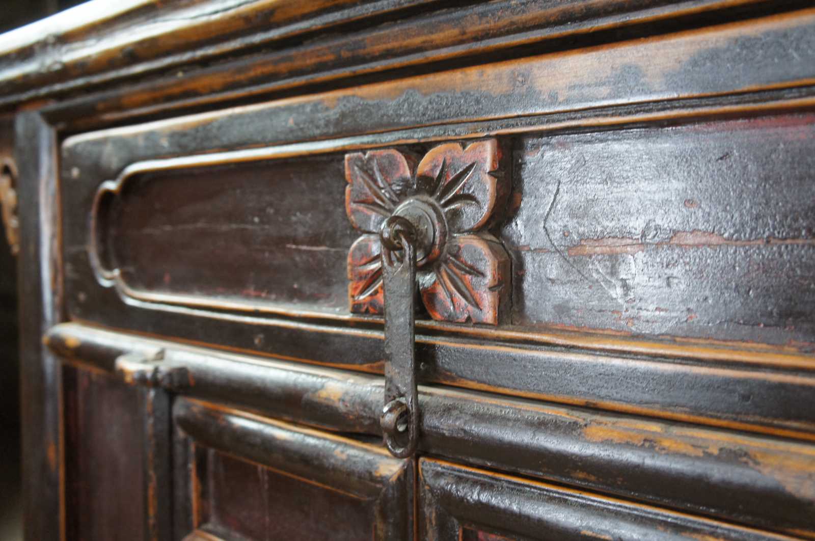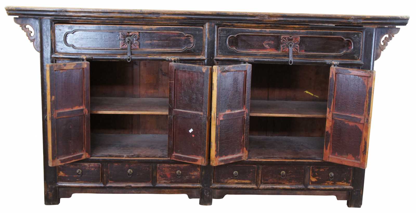 Sporting its original finish, this hand crafted buffet features a floating panel top, with cloud form spandrels, over two long drawers with cloud-form panels and carved florets. Includes two double door cabinets with rounded molding. Adding further storage, are six small drawers along the bottom, each with ring pulls. Circa 1780