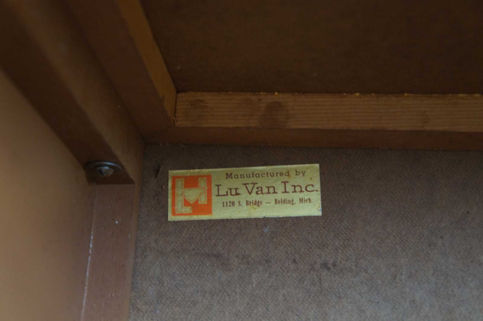 Danish mid century vinyl record or music cabinet by Lu Van Inc. Made of oak featuring a folding cabinet door that leads to four interior dividers over tapered legs.