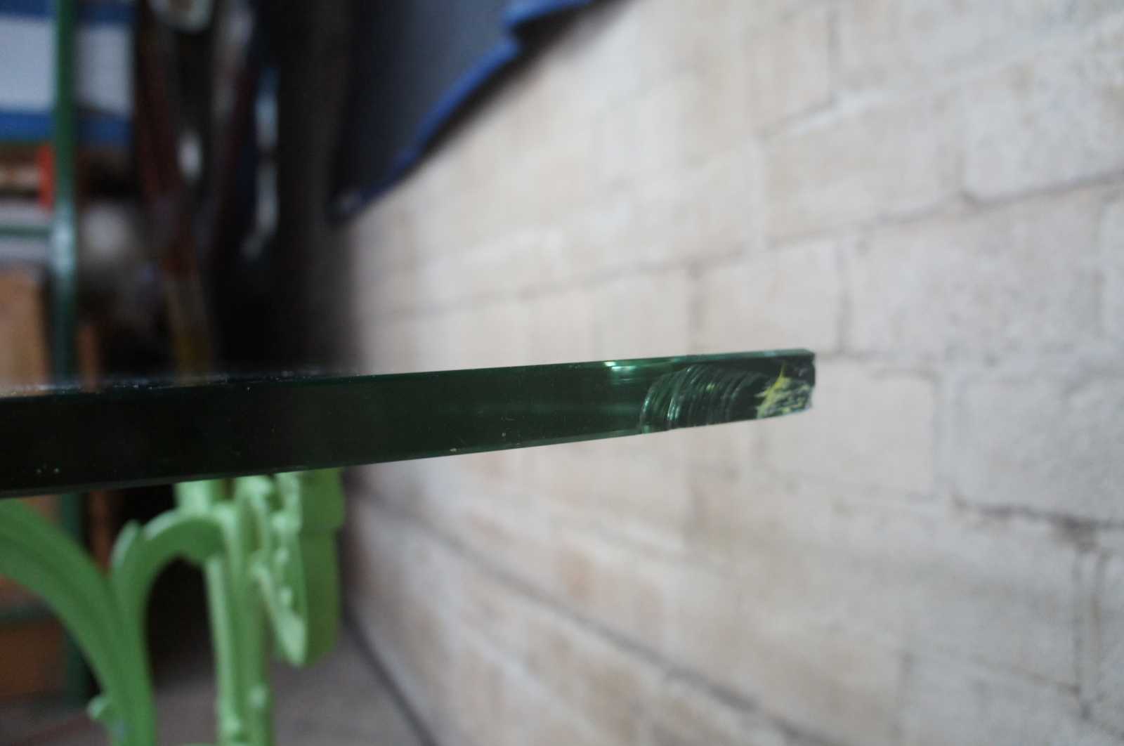 2 mid century cast iron and glass demilune console tables. Featuring scrolled iron bases and heavy glass tops. Bases finished in a lime green.