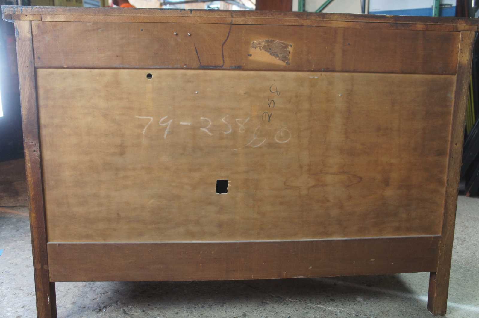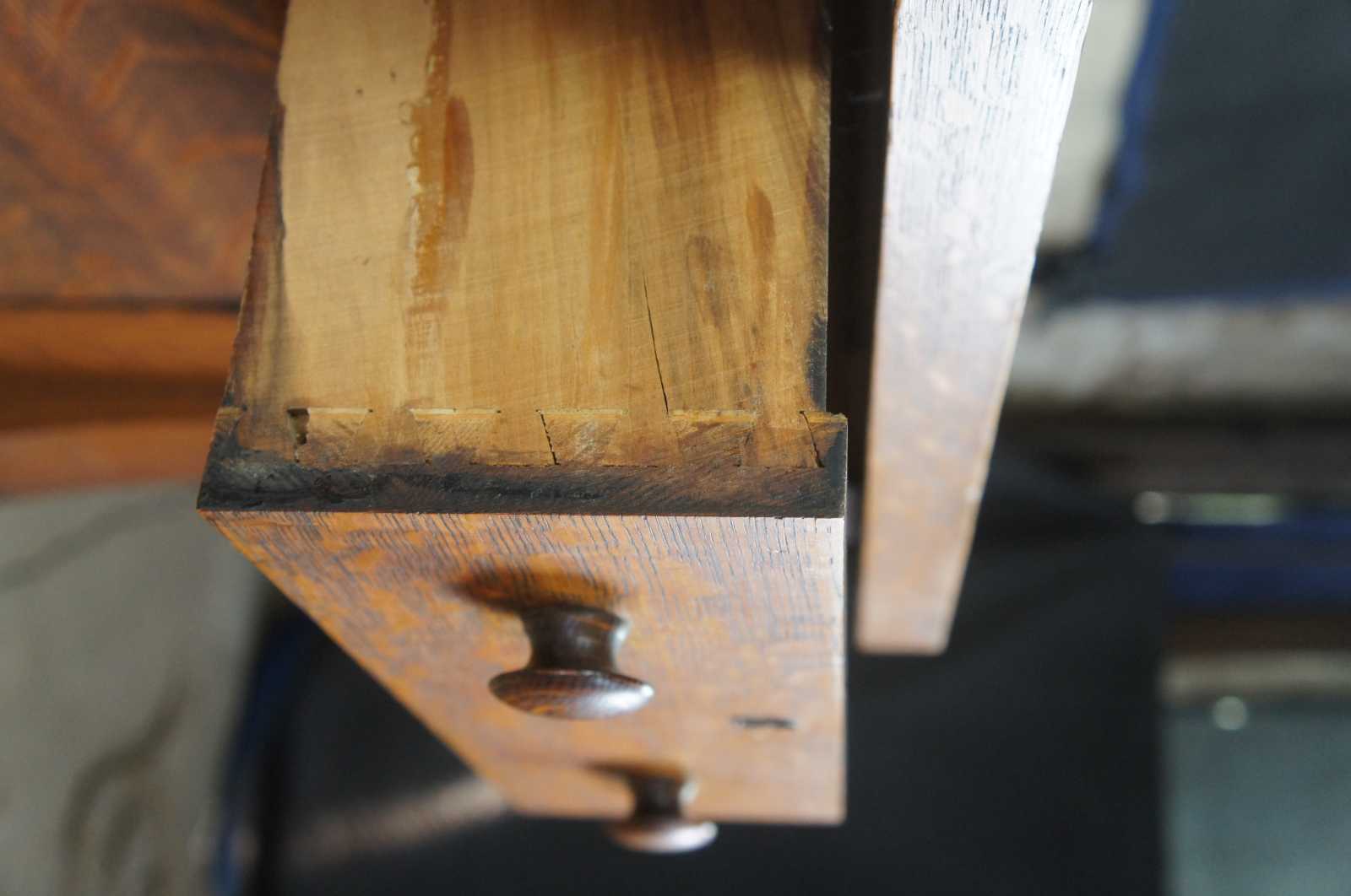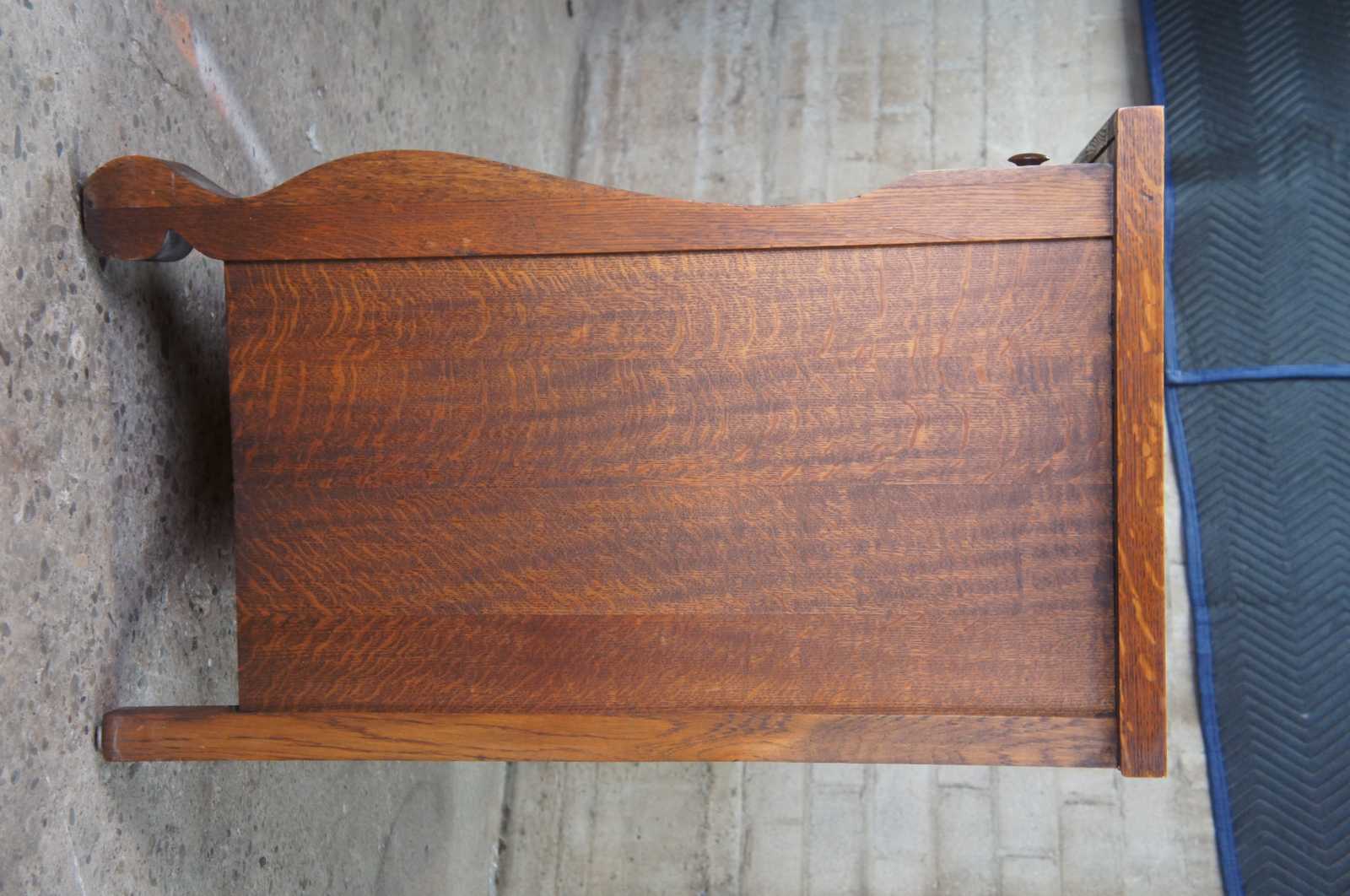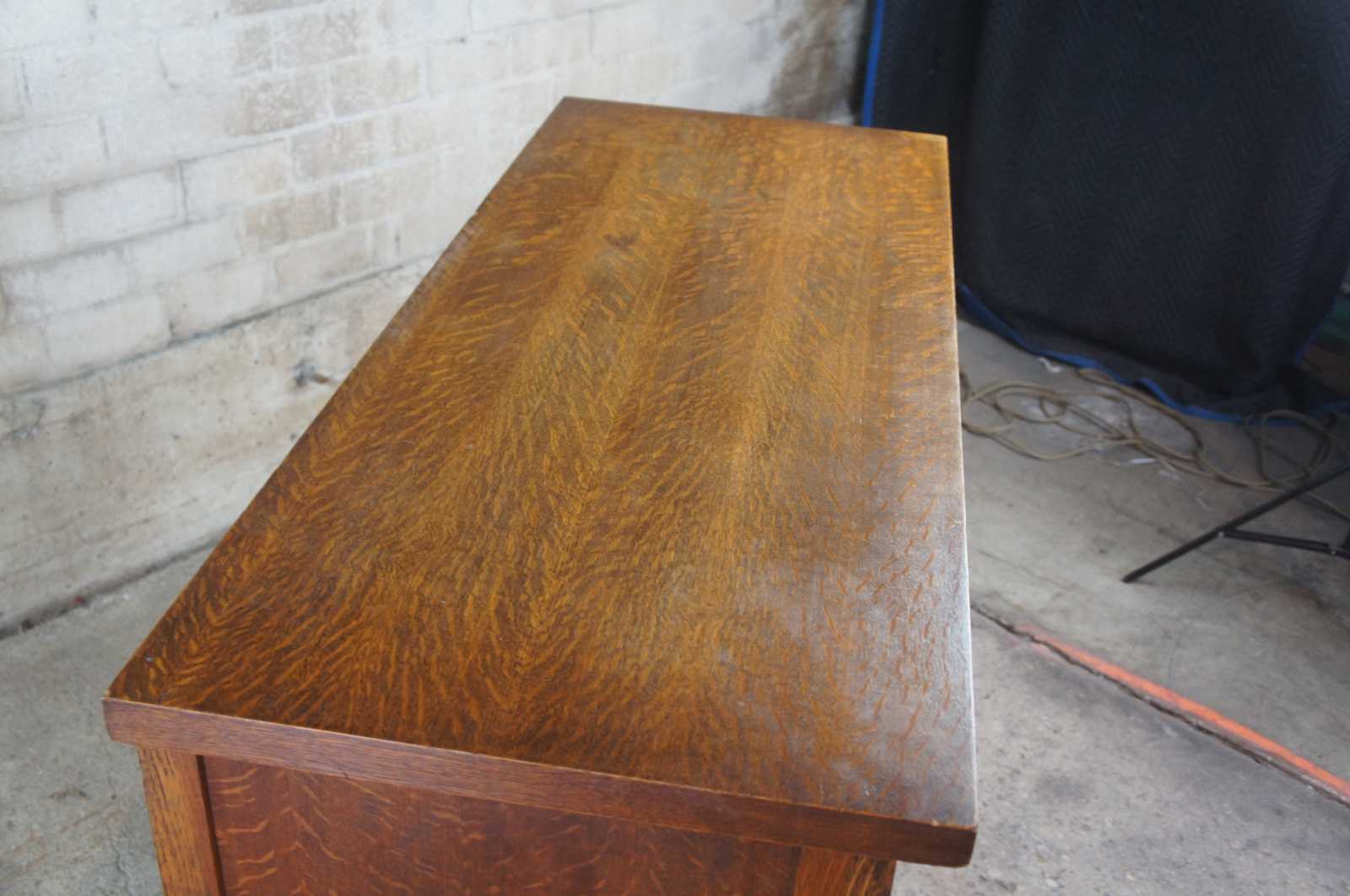 Early 1900s quartersawn oak buffet or server. Features a rectangular form with robust outer legs leading to scrolled feet. Includes three upper dovetailed drawers, a large central cabinet and full size lower drawer.