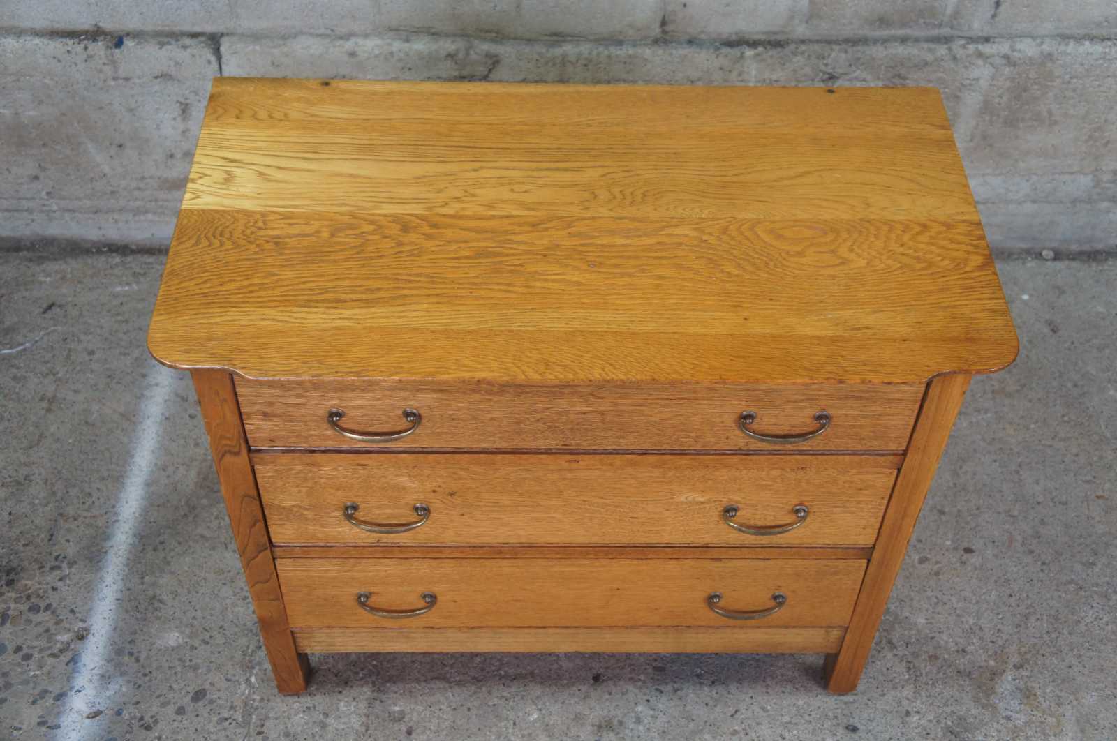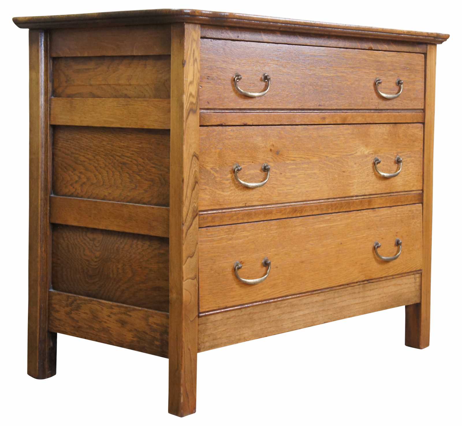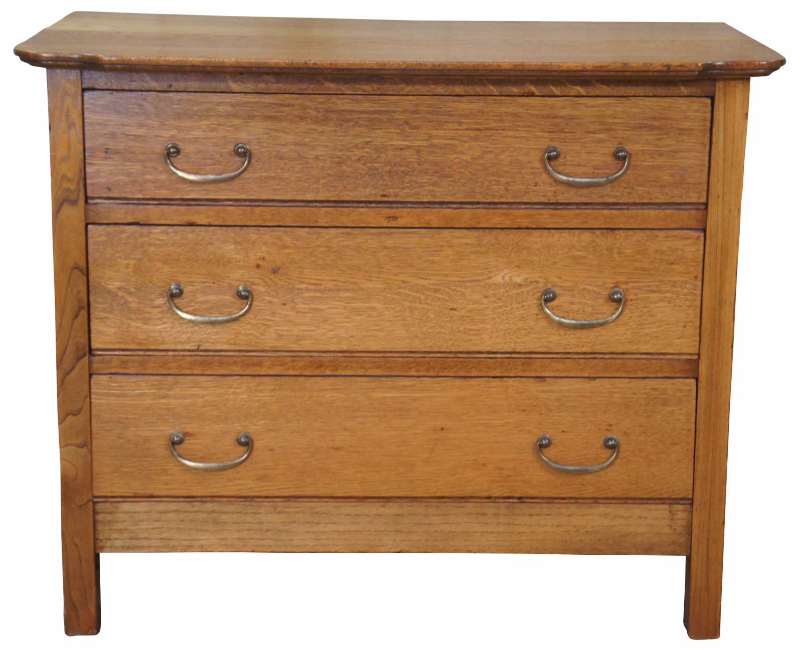 Antique Victorian dresser or chest of drawers. Made of oak featuring three drawers with brass pulls, paneled sides and serpentine front top corners.