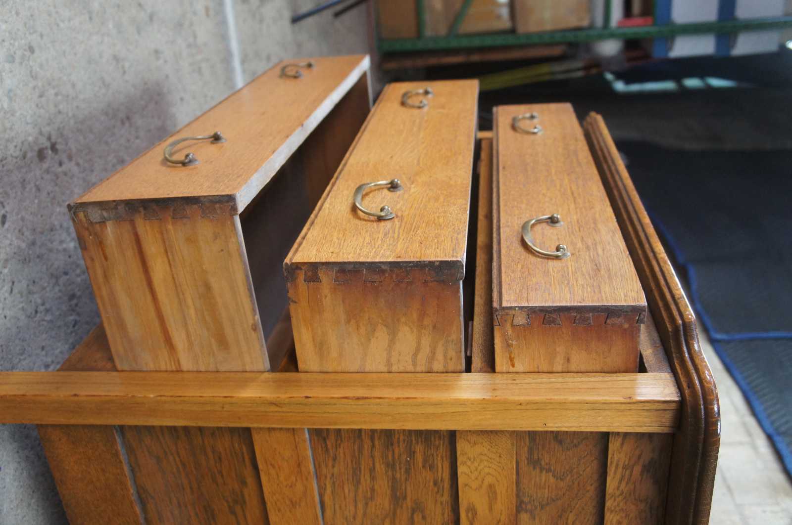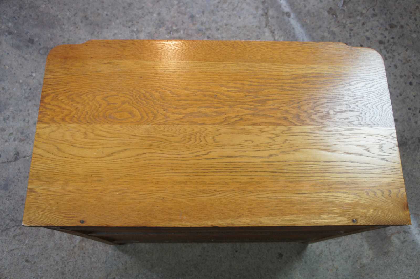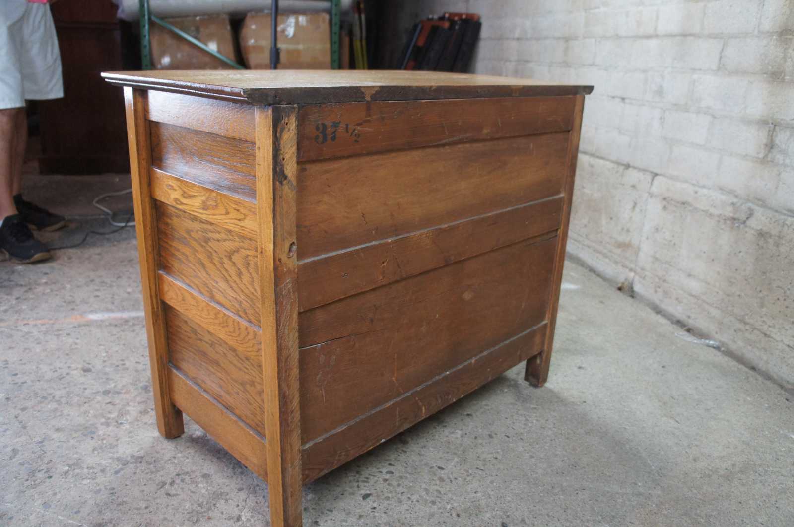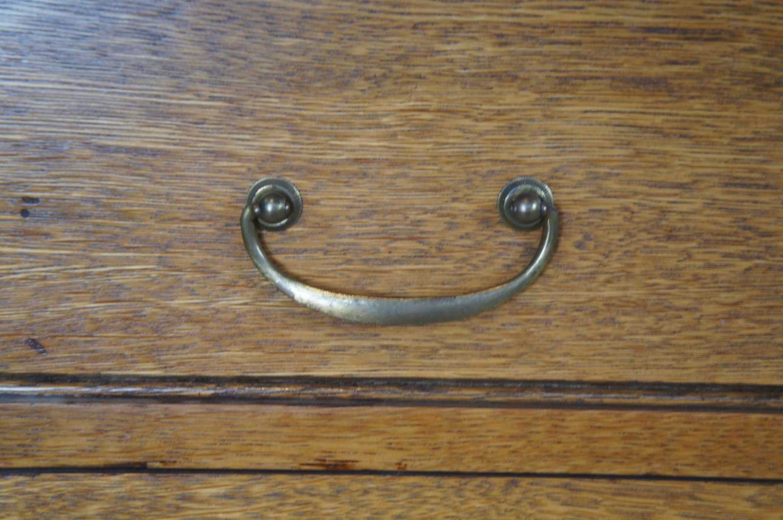 Antique Victorian dresser or chest of drawers. Made of oak featuring three drawers with brass pulls, paneled sides and serpentine front top corners.