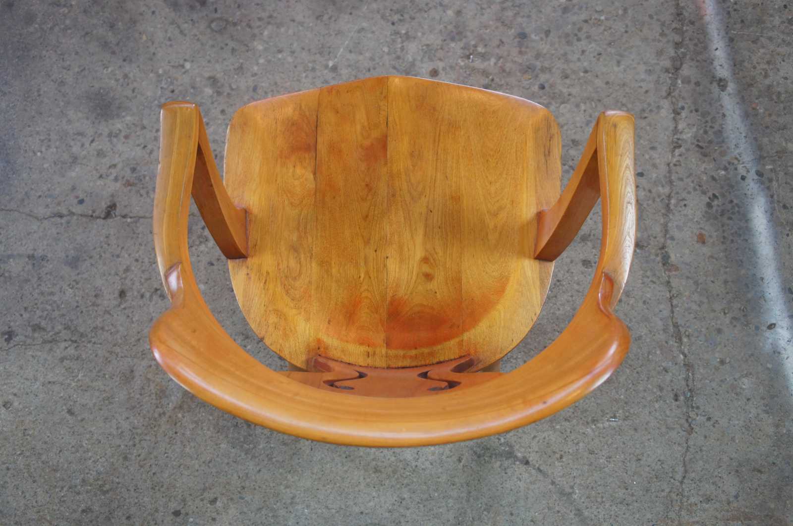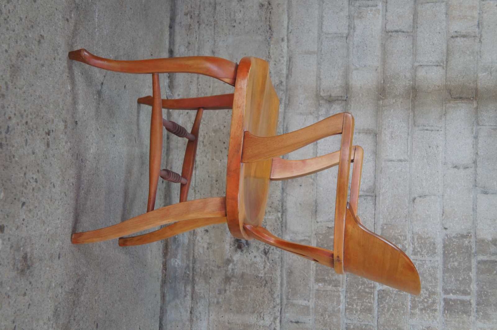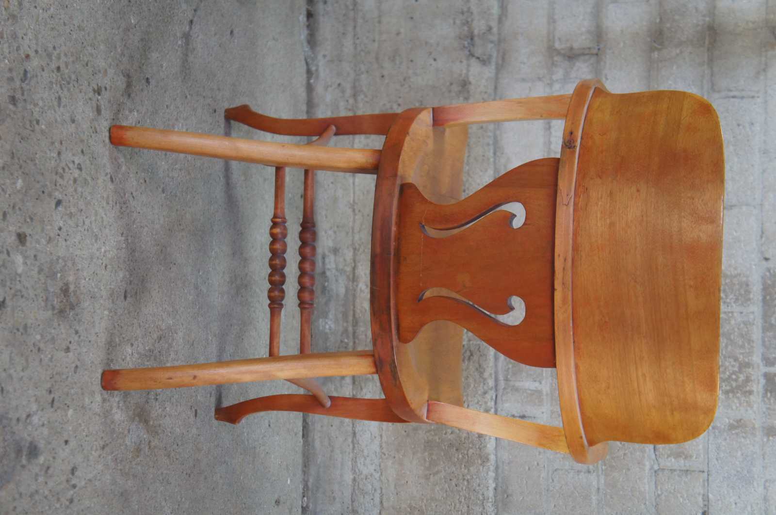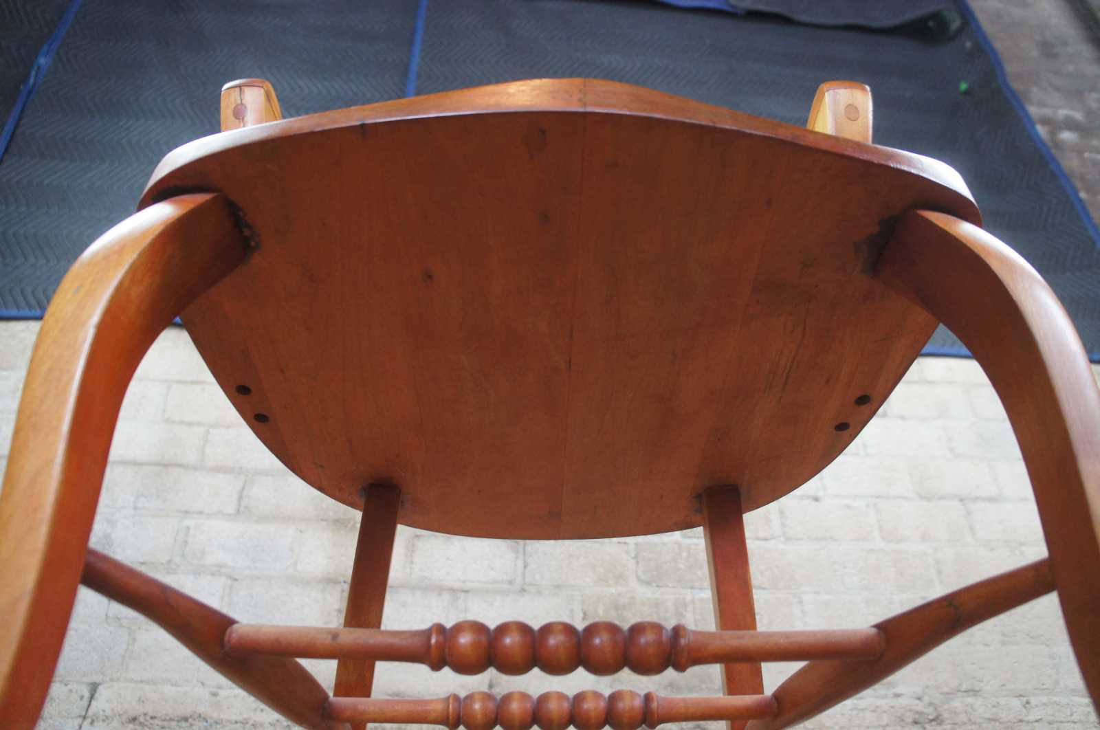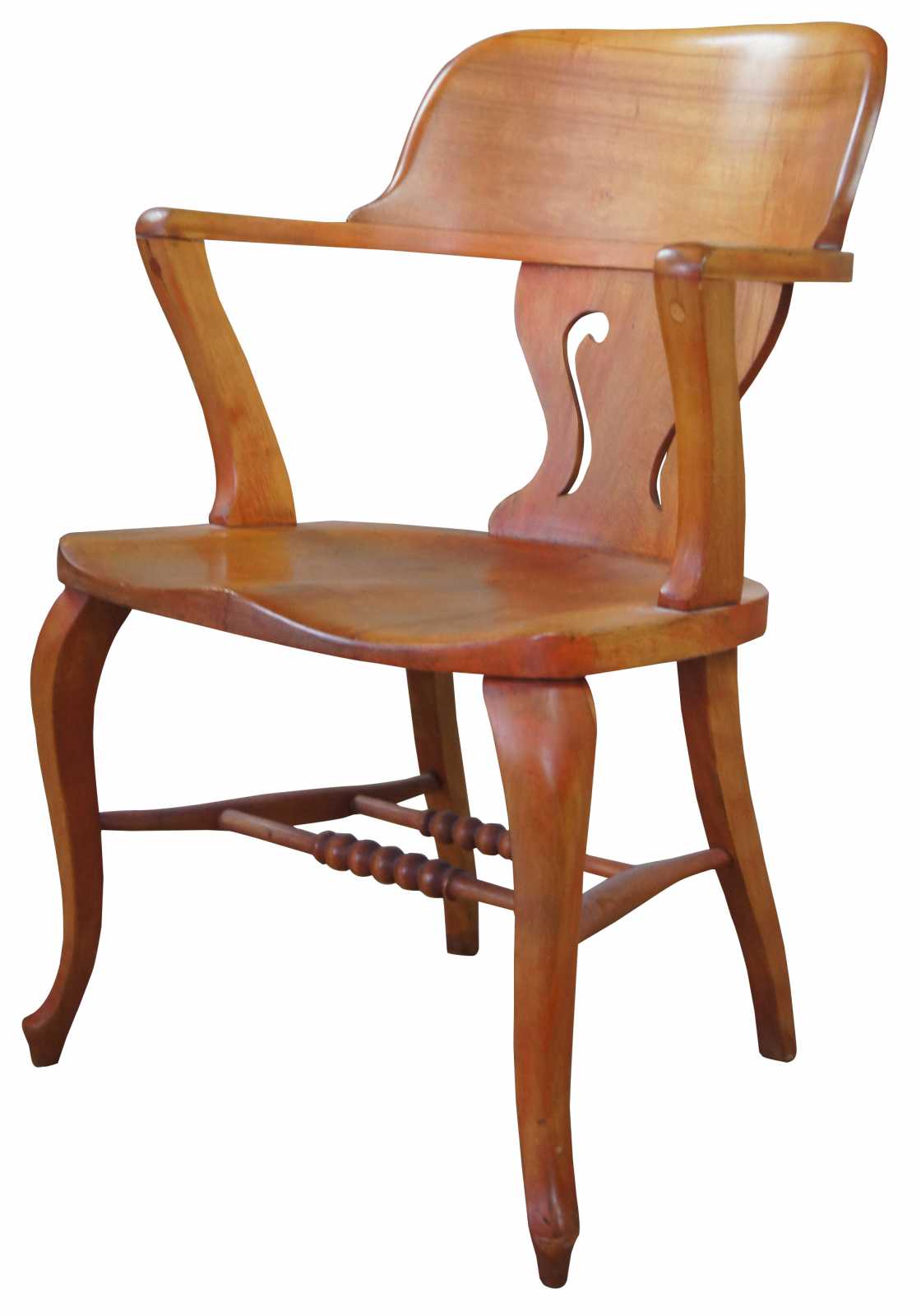 Antique late Victorian arm chair. Made of solid cherry featuring curved back with serpentine accents, high arms, saddle seat, cabriole legs and ball and stick stretchers.