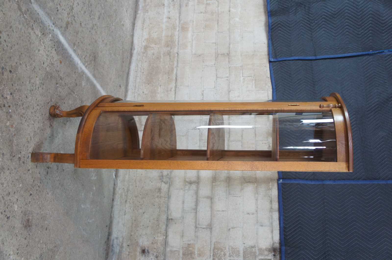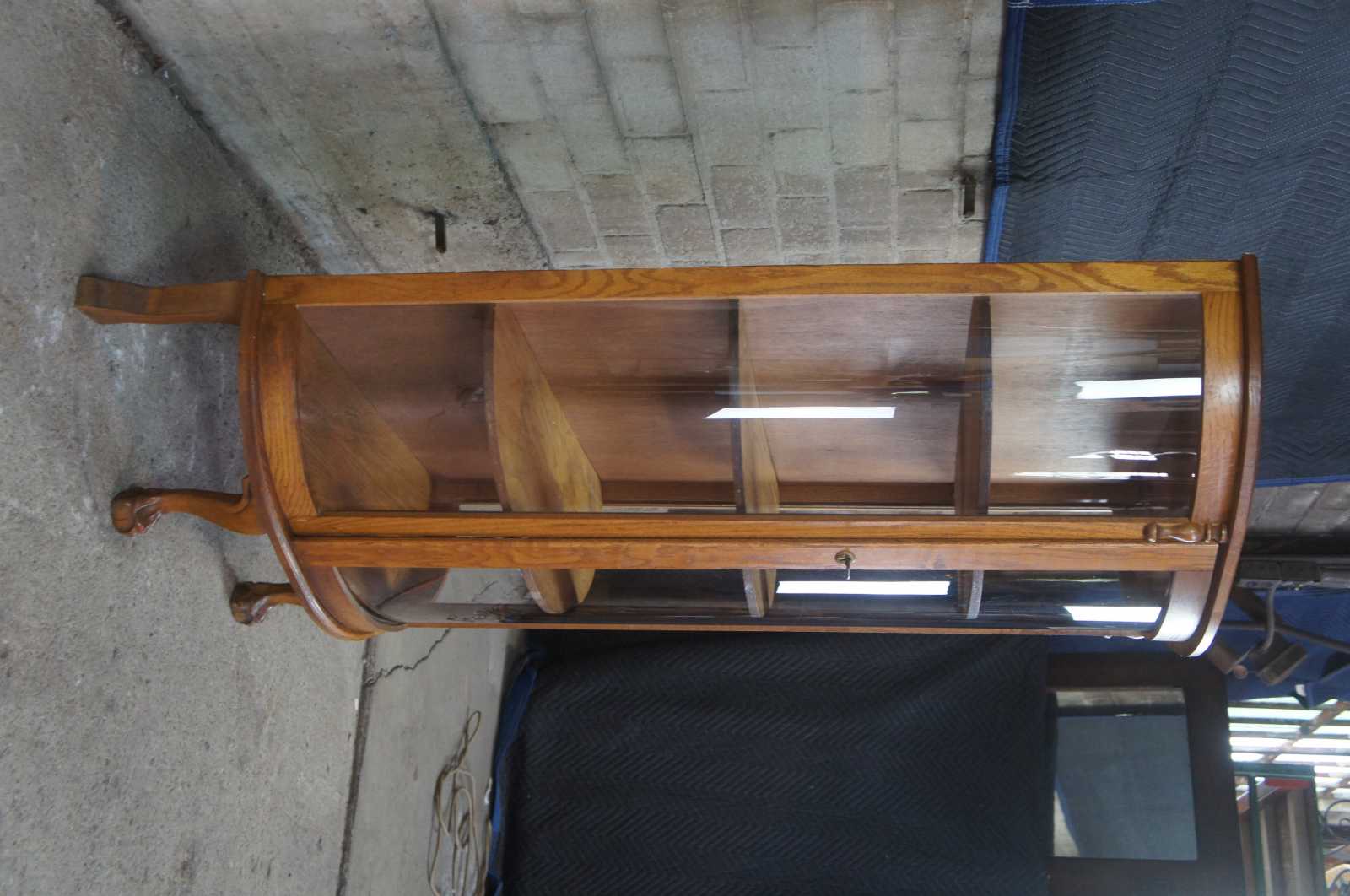 Early 20th century oak bowfront curio or display cabinet. Features a demiulune form with three shelves over ball and claw feet.