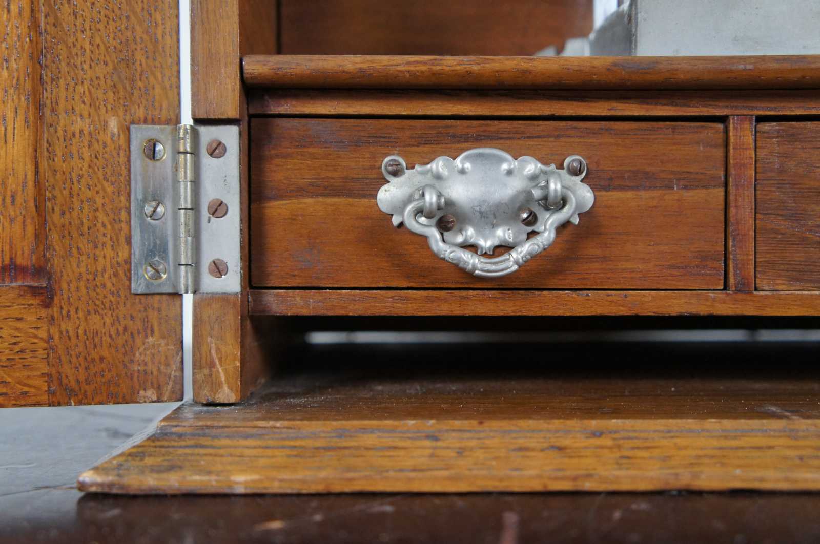 Antique quartersawn oak library desk top stationary cabinet with envelope slots, two small drawers, several pen rests/slots and glass ink well.
